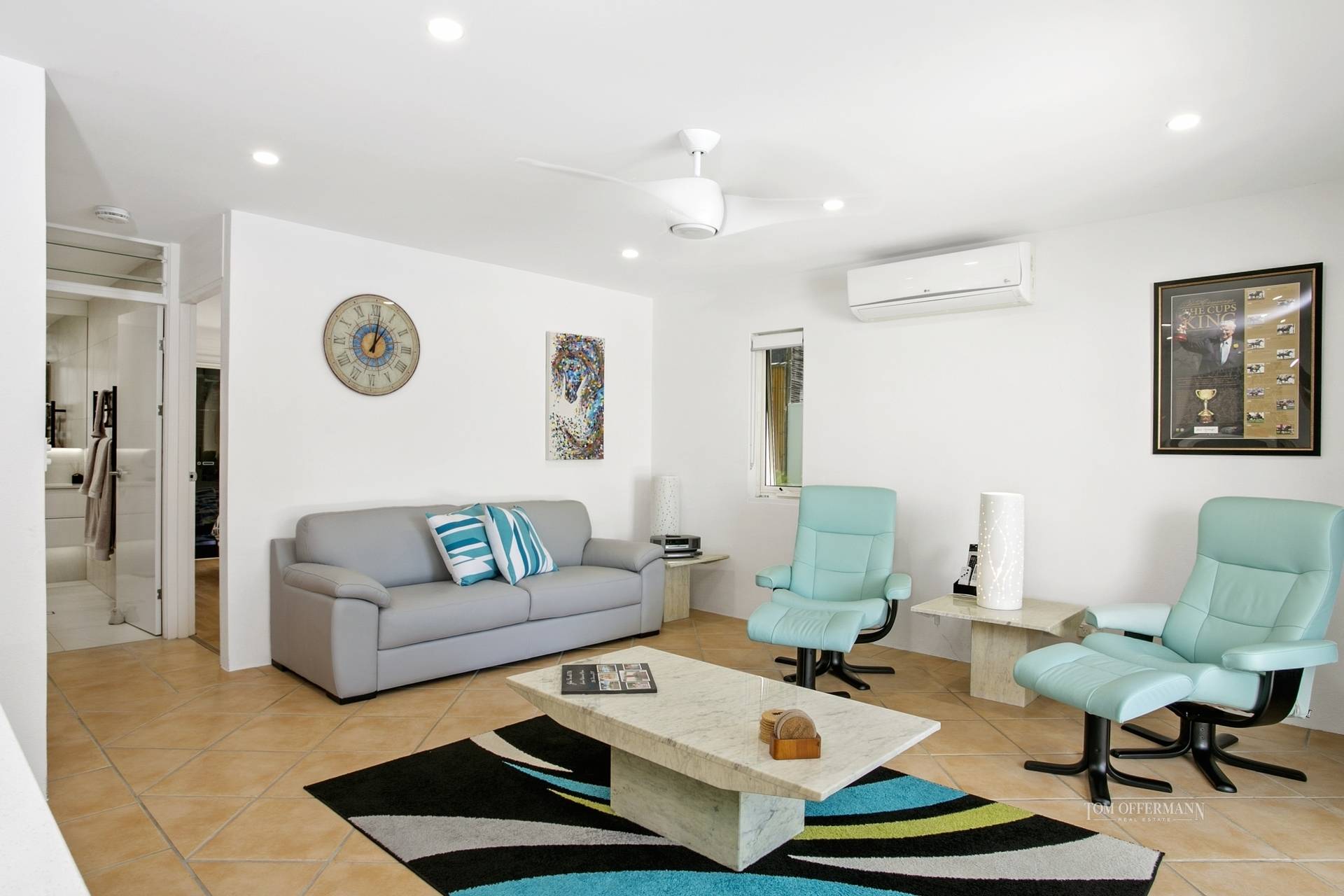 Upstairs has VJ-profile ceilings, plus an ambient atmosphere with two generous bedrooms, one of which is currently used as a media room and opens out to a visually arresting and massive terrace. With a Sunset Bar and sun-deck beside the north-facing 6.5m long dazzling pool, it shrieks of fun times alfresco.