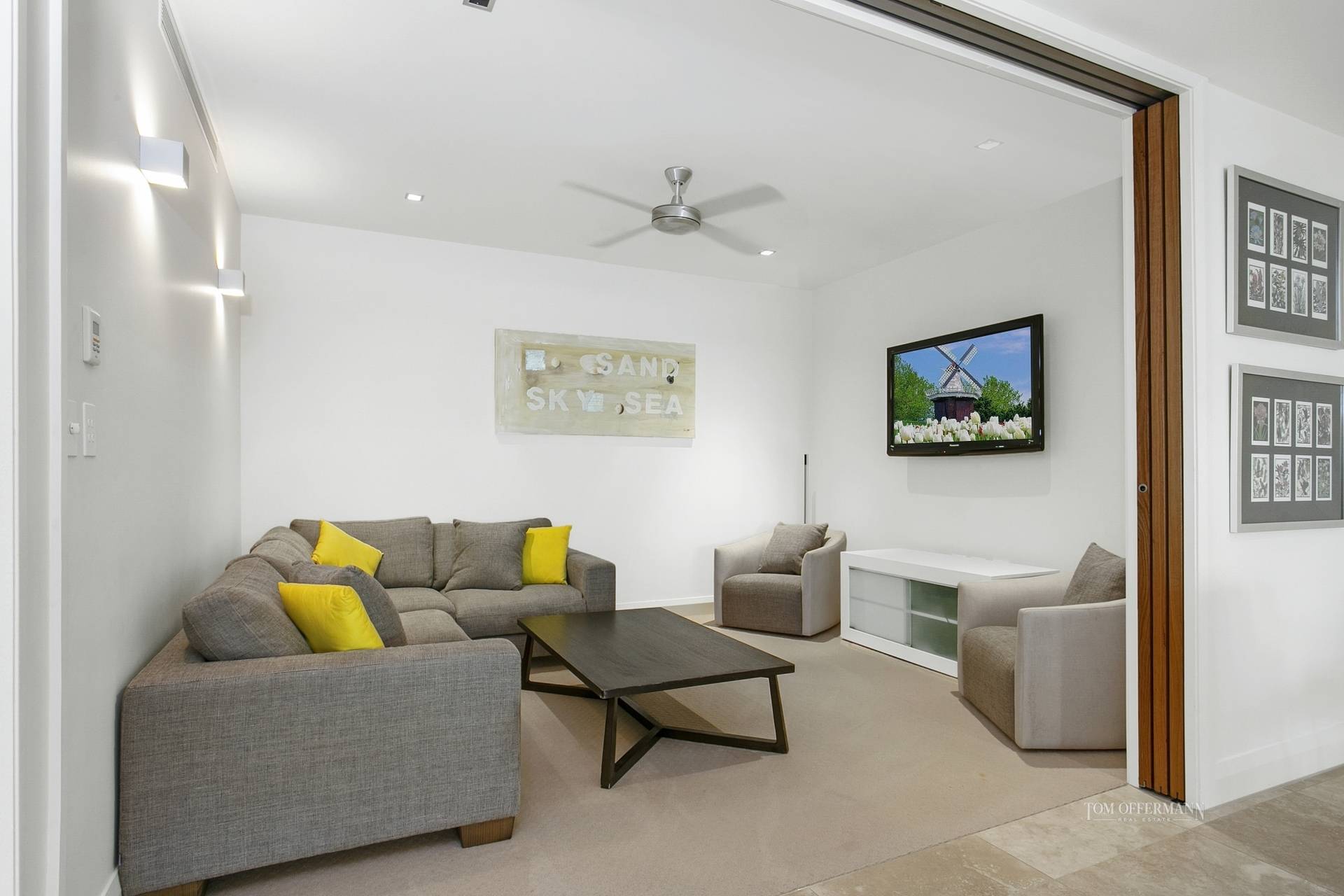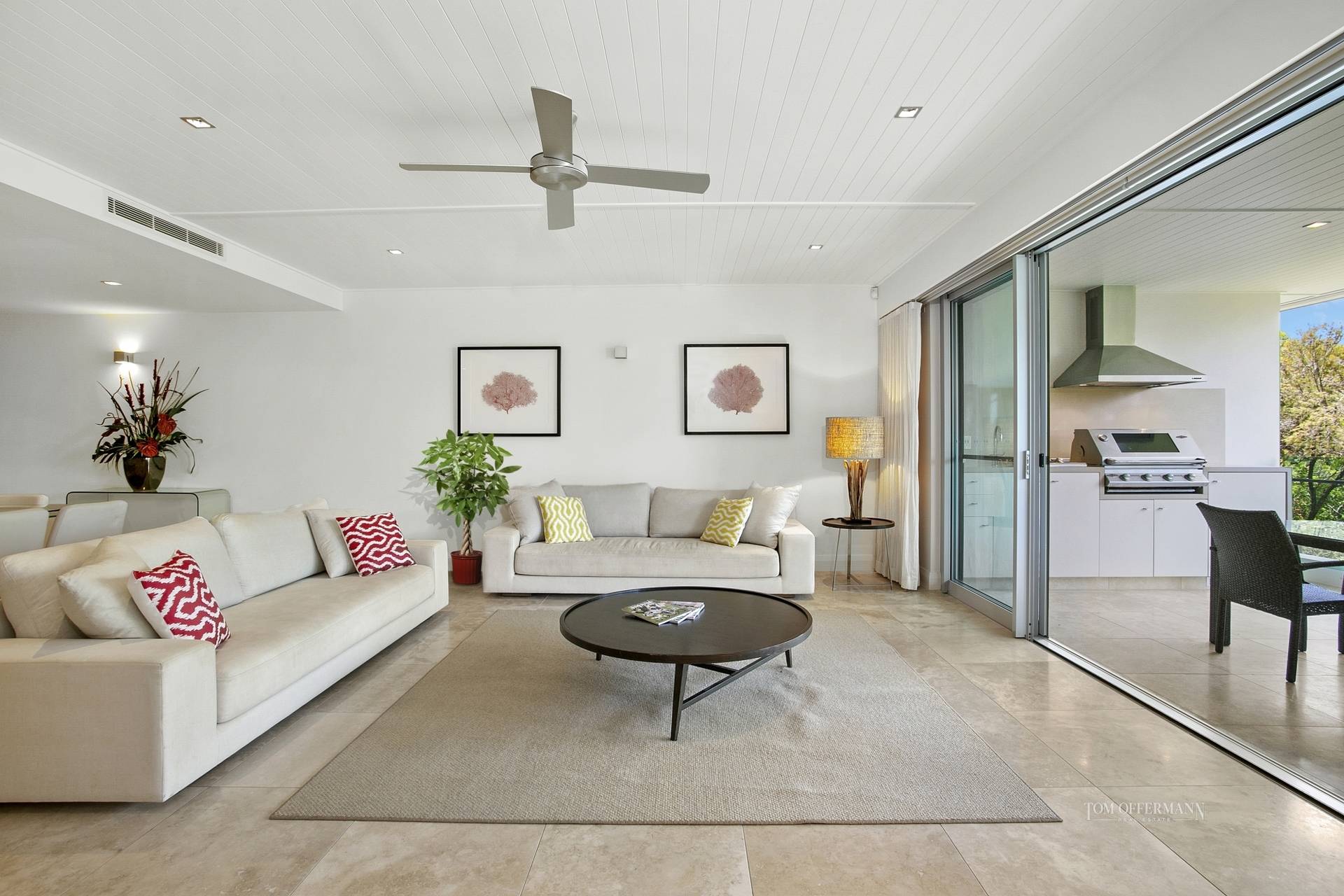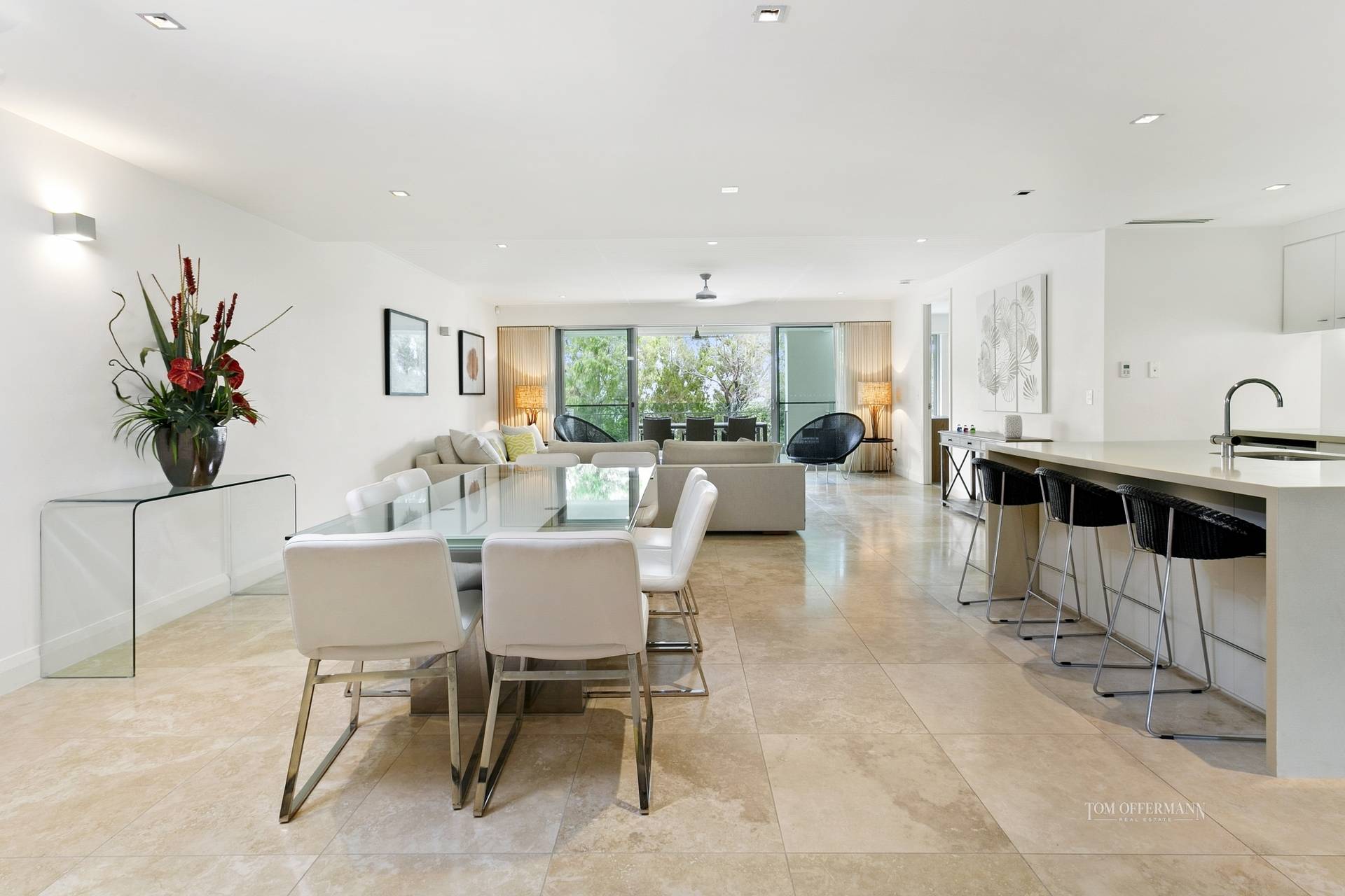 From the front entrance the strong contemporary albeit vivacious interior and overall neutral palette is obvious. Ditto quality features and fixtures which speak for themselves, such as the travertine floor tiles and high ceilings with VJ-profile, especially in the over-generous living and dining spaces, also the media room which has smart fold-away timber doors.