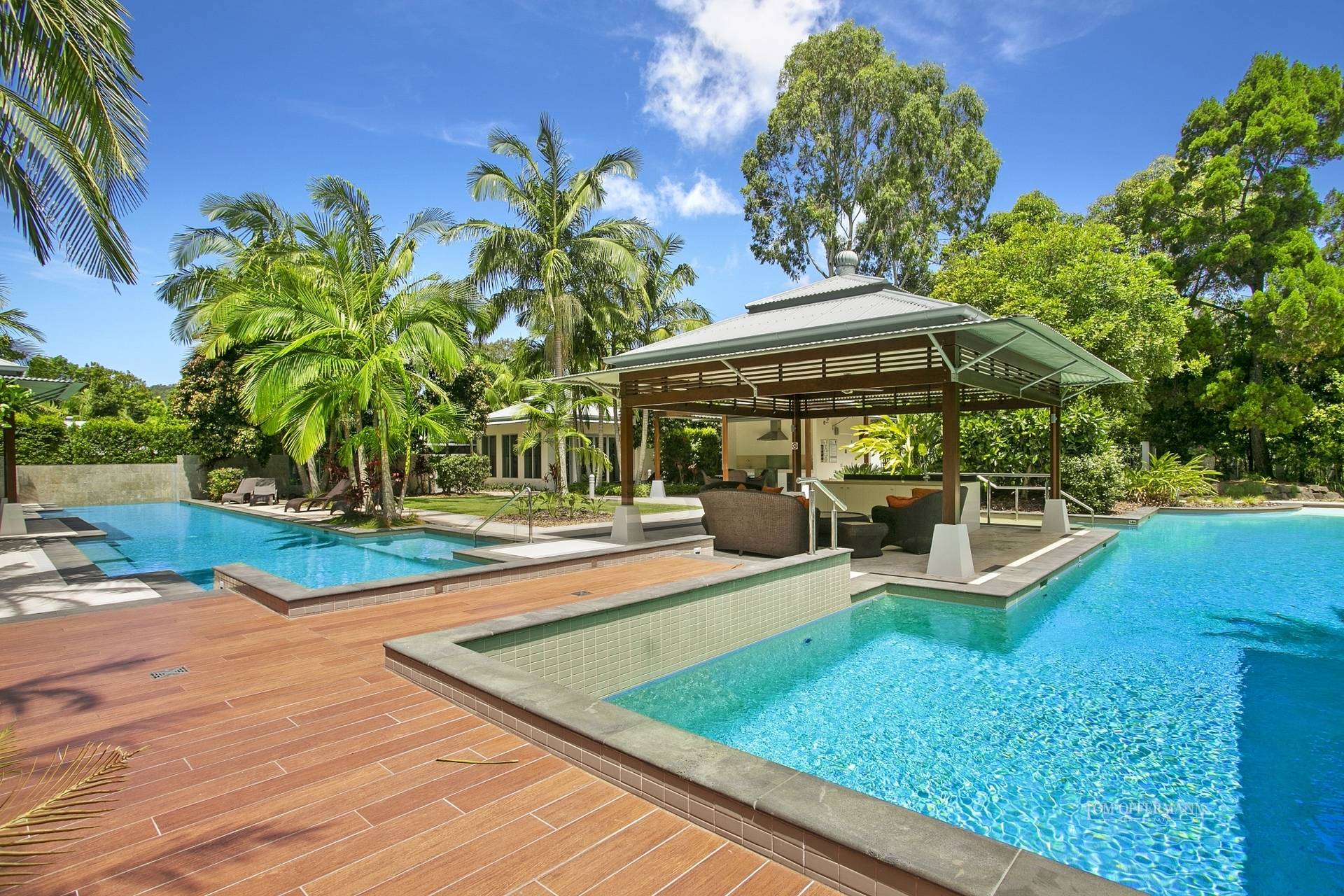 In the south wing the munificence of space continues. The office has purpose-build cabinetry including a wall-to-wall desk, and two queen-size bedrooms (one currently used as a kid's domain),have large ensuite bathrooms. All three open to a balcony where afternoon tea could be de rigueur. It also looks over the 5-star resort-like residents-only, immaculately maintained gardens. The decision to use the heated lap pool, beach pool, gymnasium and spa or the barbeque/dining and sun lounge areas is all yours.
