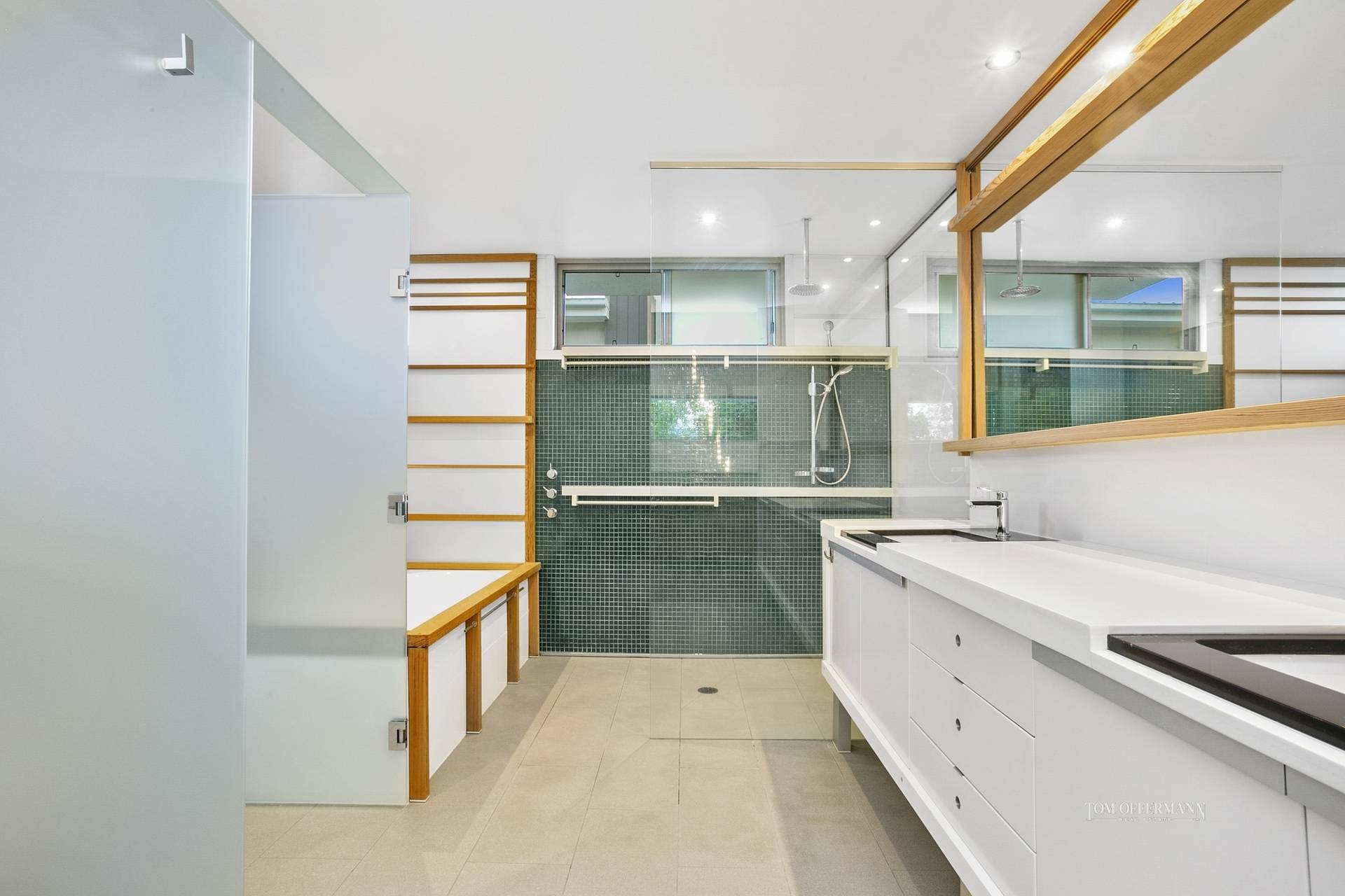 Lustrous spotted gum floors are complemented by polished concrete walls, various timbers, white Corian tops including an ever-so-long island bench and high-end Gaggenau appliances, in the kitchen. Beyond, a wide Japanese-style glass and timber door opens to a library/office and next door is a massive living/family space. It has access to a quiet pool-side patio, also heated pool and spa.
