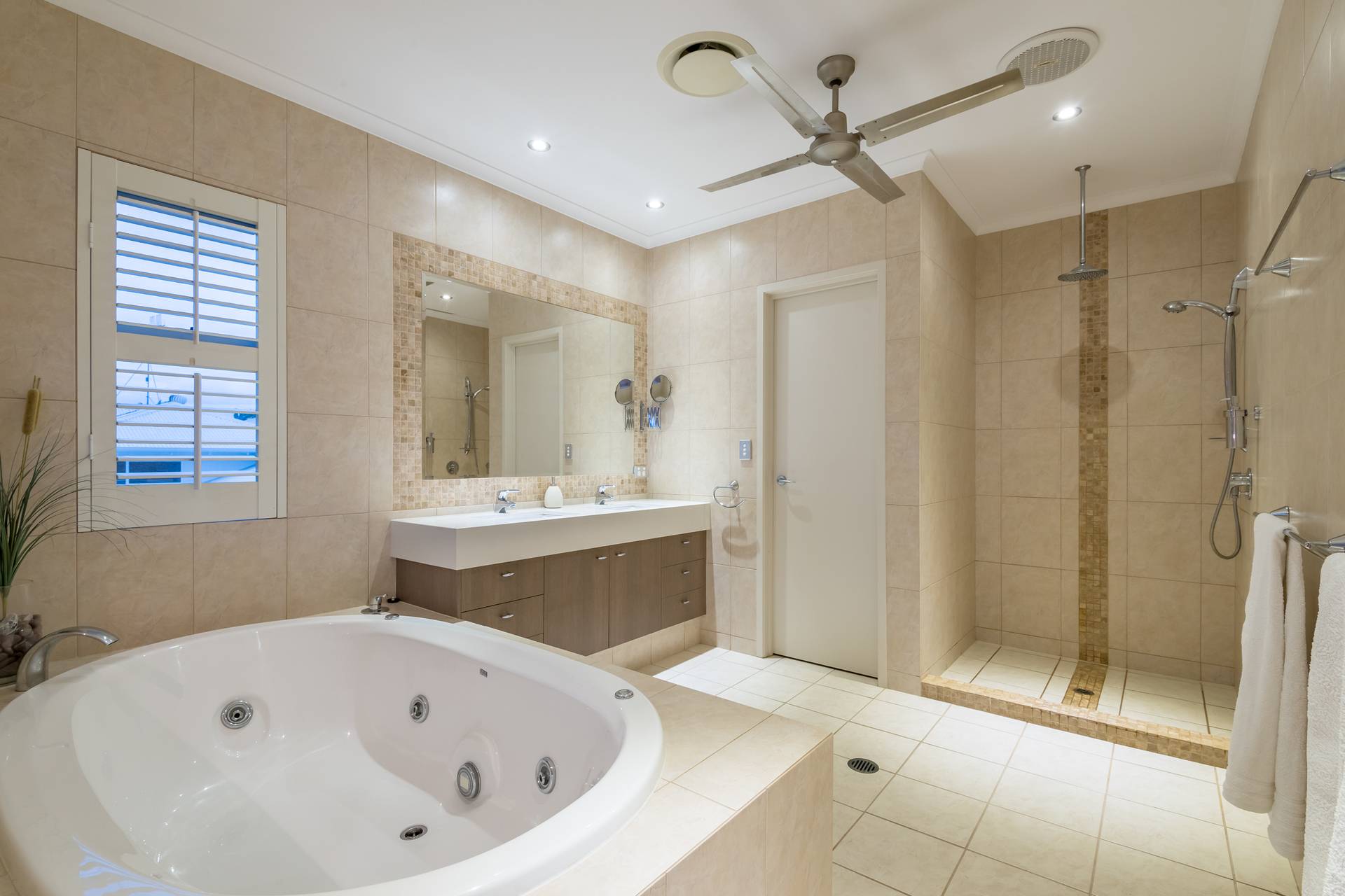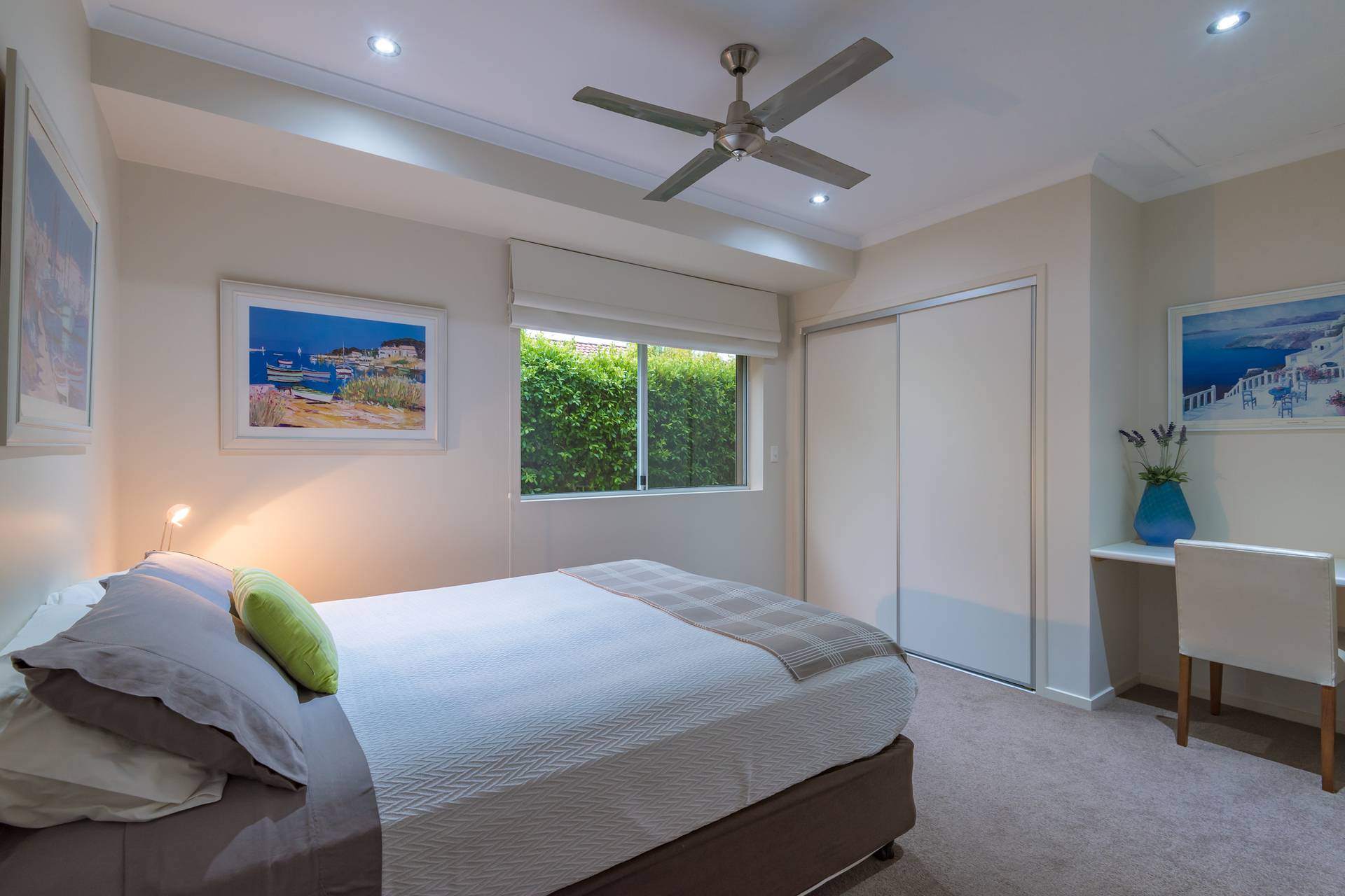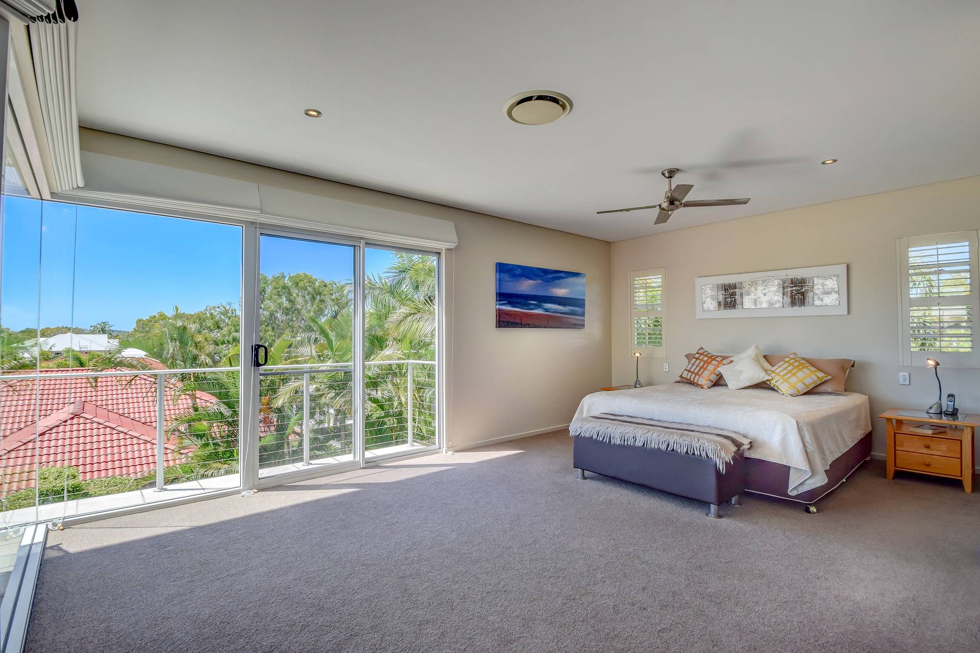 Upstairs is lavish. The master suite is more like a retreat with a sitting area and large balcony suitable for morning yoga, also checking out the views to Noosa Hill. The huge walk-in robe will suit a fashionista and the bathroom has an over-sized spa bath and walk-in shower.