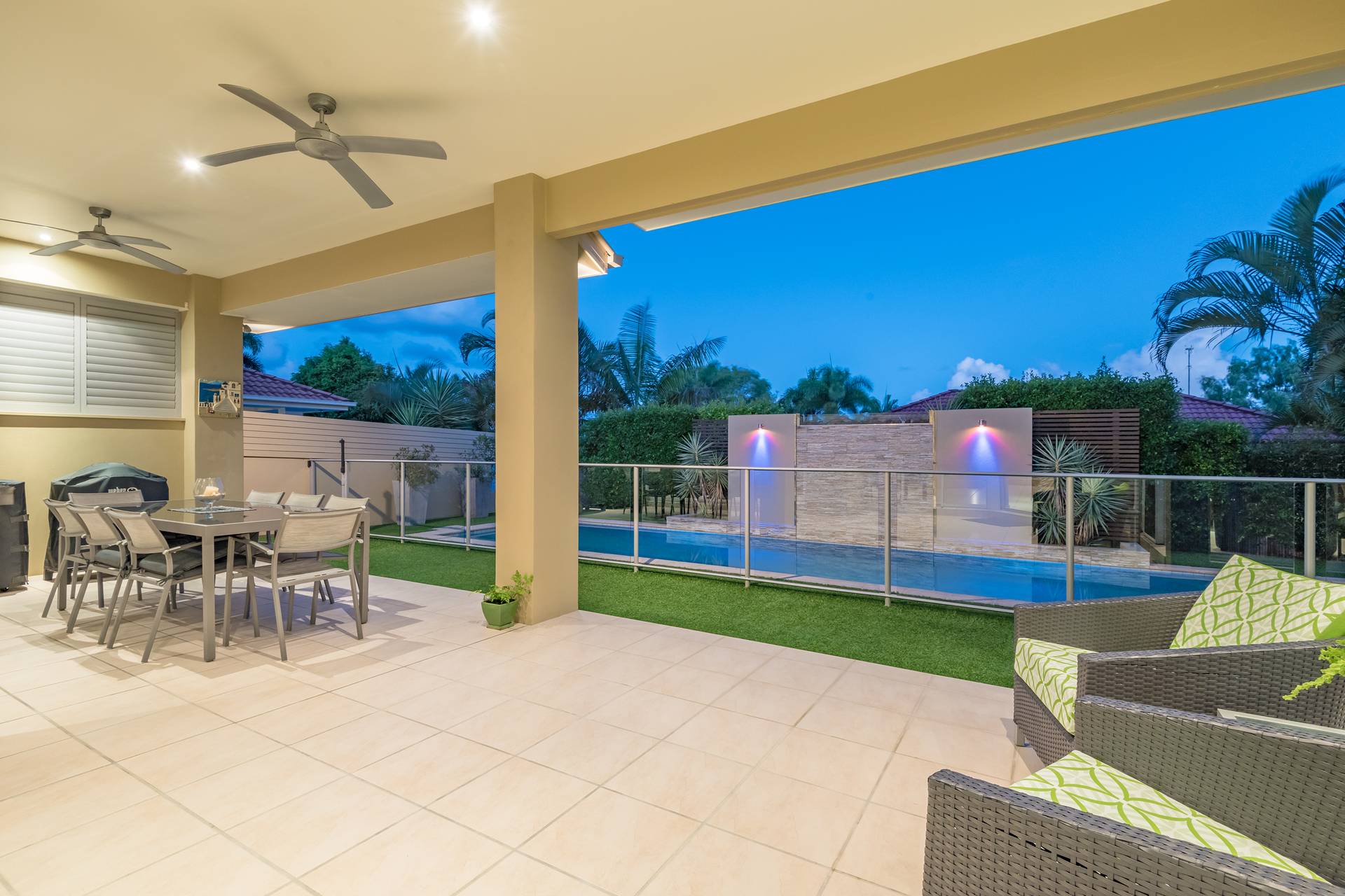 The pared-back approach has cool-look porcelain tiles, glass louvres to capture every cooling breeze, banks of glass sliders to blur the lines between the open plan living and dining spaces plus a covered paved terrace to relax the day away. Adding to the forever magic of a private alfresco lifestyle is a dazzling pool with stone-walled water feature. It is surrounded by a neatly manicured garden with a backdrop of Australian natives.