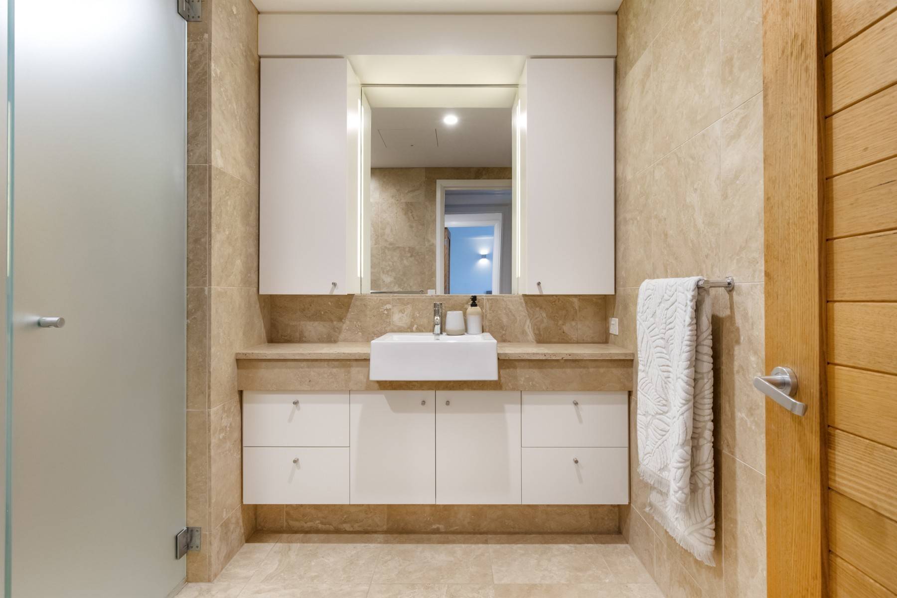 Take the elevator from a glass security door lobby, swing the solid timber door and a world of refined luxury draws you into wall free living areas anchored by a Meile equipped island kitchen, with pale stone benches, nearby scullery with dishwasher, soft close systems and a satin two pac finish to cabinets. A full width balcony with large stacker glass doors links to an indulgently large main bedroom with dressing room, walls of cupboards and a gorgeous floor to ceiling tiled bathroom with frosted glass door shower, toilet,/bidet. Travertine floors, pale honey timber doors and a soft white colour scheme capture light from the northern aspect. There is a large laundry, powder room off the vestibule entry and a media room with concertina privacy doors. A hall door isolates two ensuited bedrooms in the southern wing overlooking the pool deck and gardens. Each of these beautifully detailed bedrooms steps onto a balcony. This is a Noosa Heads apartment you will be proud to call home.