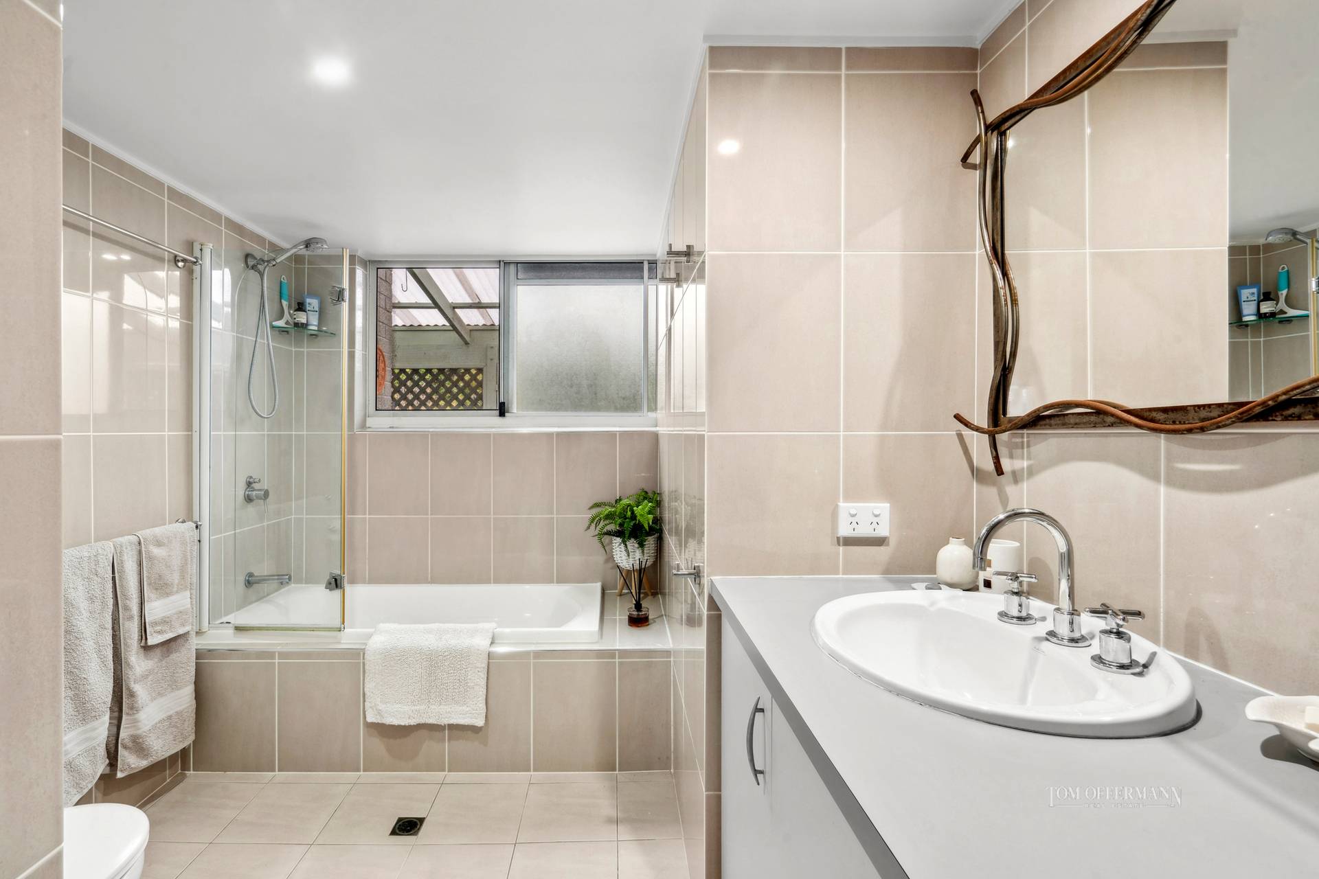 There are two spacious bedrooms and two generous bathrooms. Both bedrooms enjoy access out onto the back veranda which is sundrenched in the afternoon and leads directly to a spacious level grassed yard ideal for children or pets to play. This veranda is covered and fully weatherproof so it's an ideal protected indoor/ outdoor additional living space. Both bathrooms have been renovated with a lovely mocha and white coloured tile. They are both a great size and the 2nd bathroom also has integrated laundry and bath.