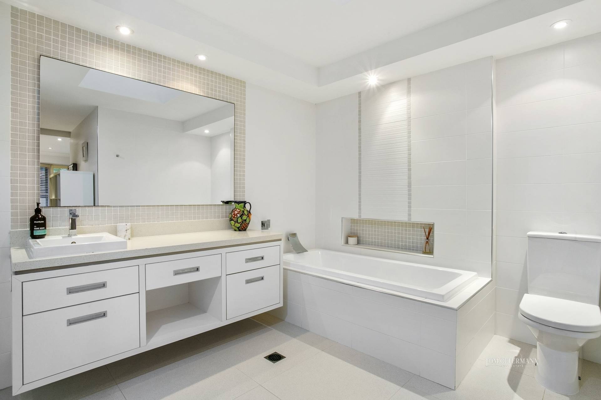 Slide back the shoji-style doors and note how the over-generous open-plan living spaces are drenched in bright light due to the northerly aspect and are complemented by a cool palette, banks of plantation shutters, porcelain tiles and pops of colour.