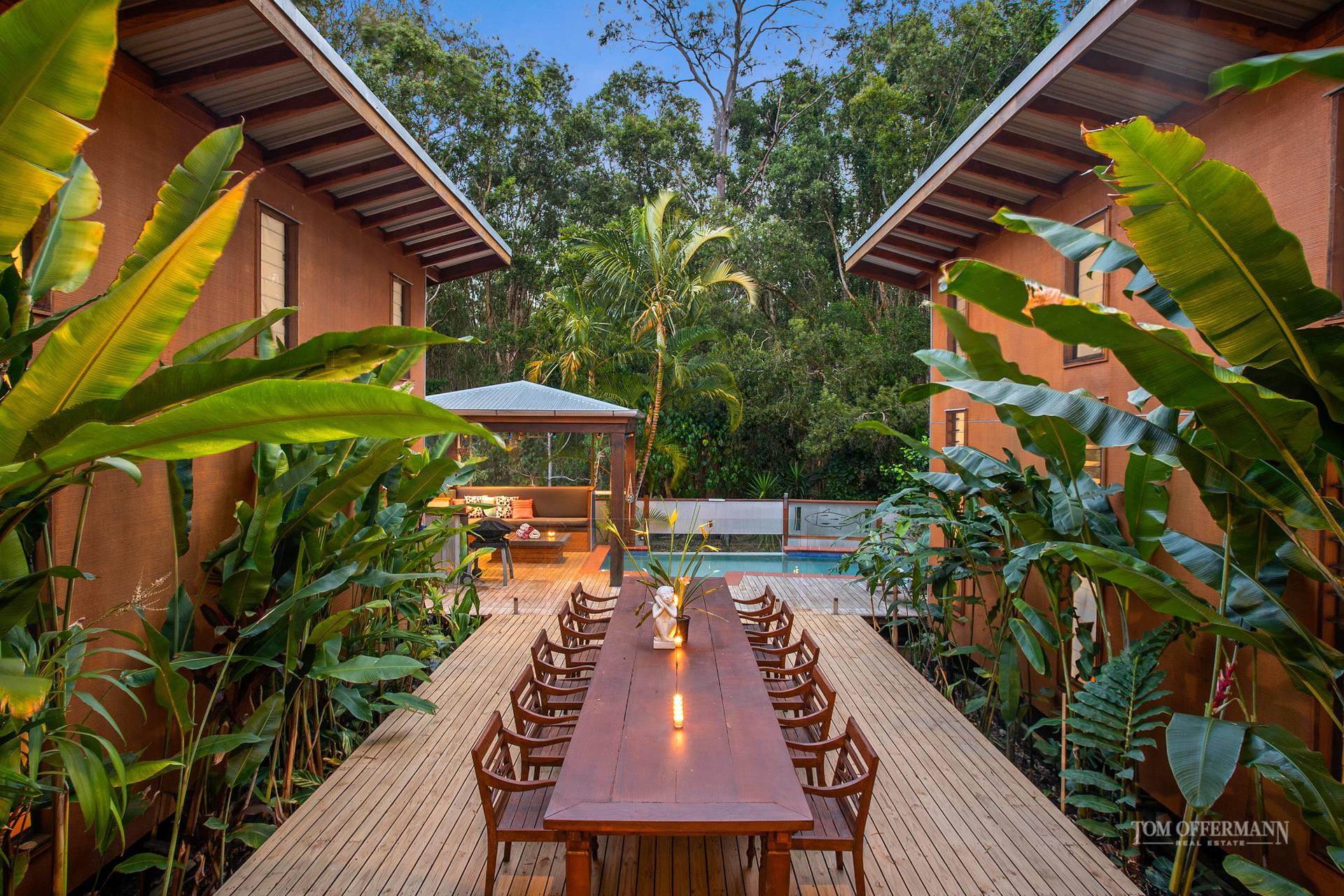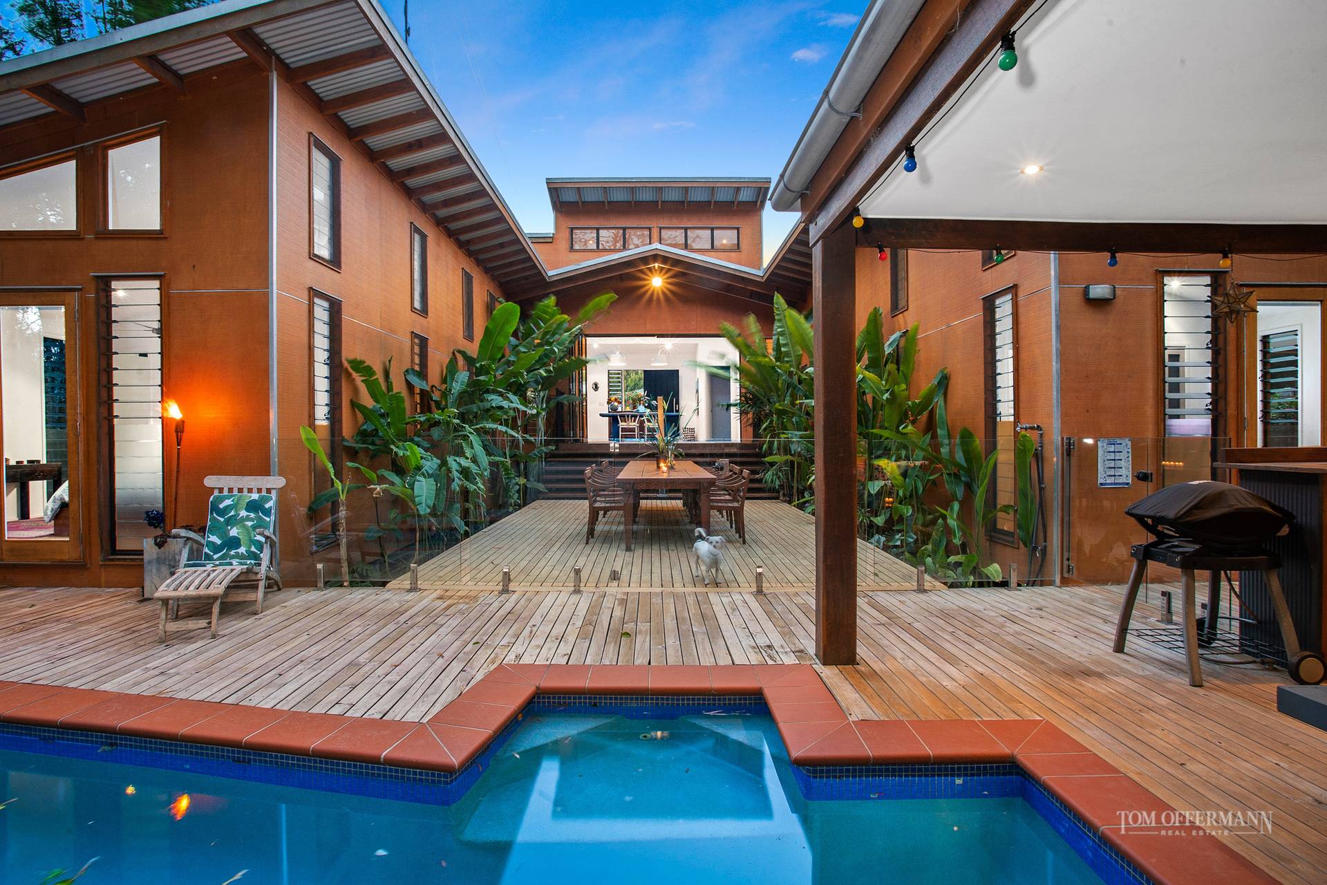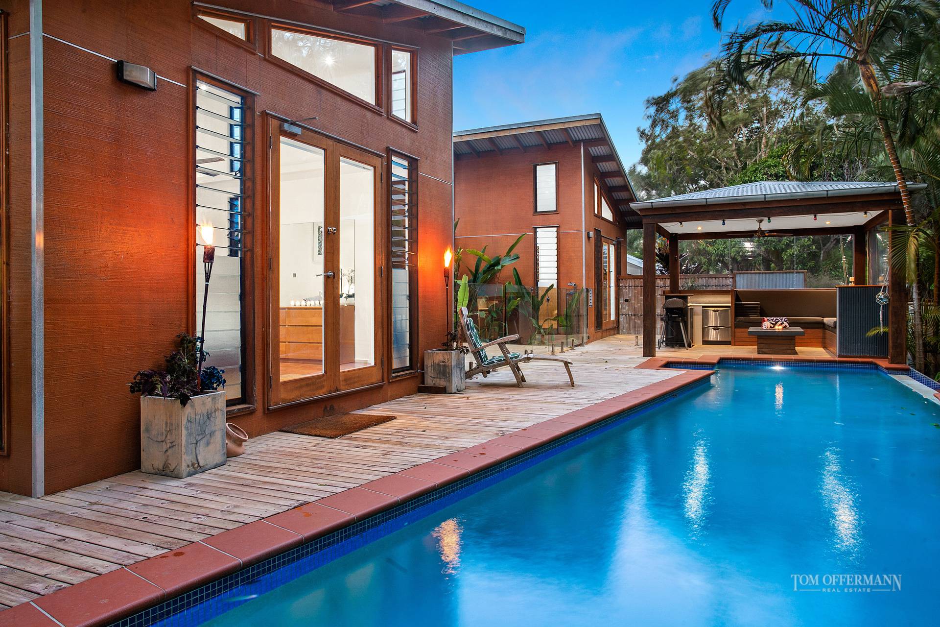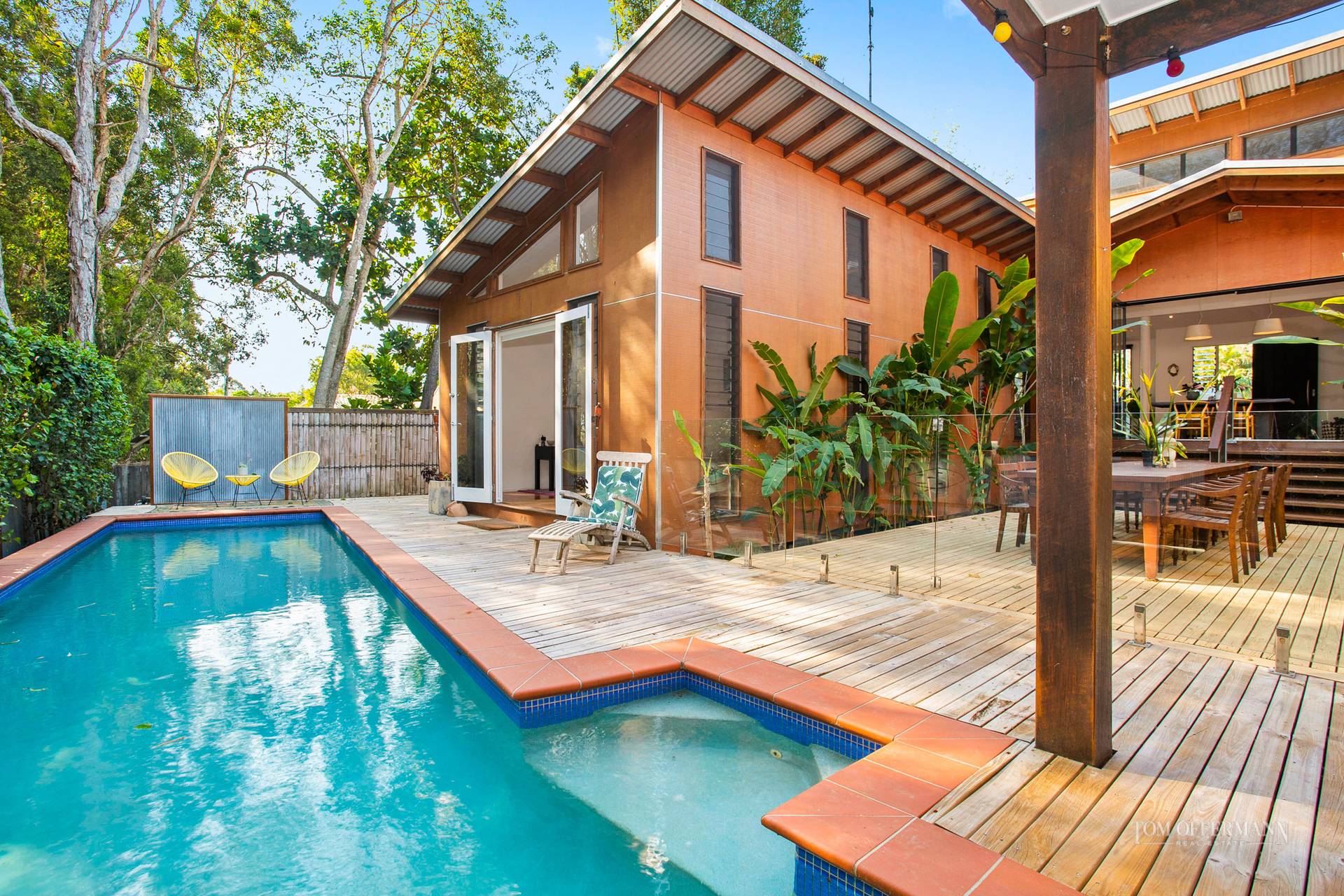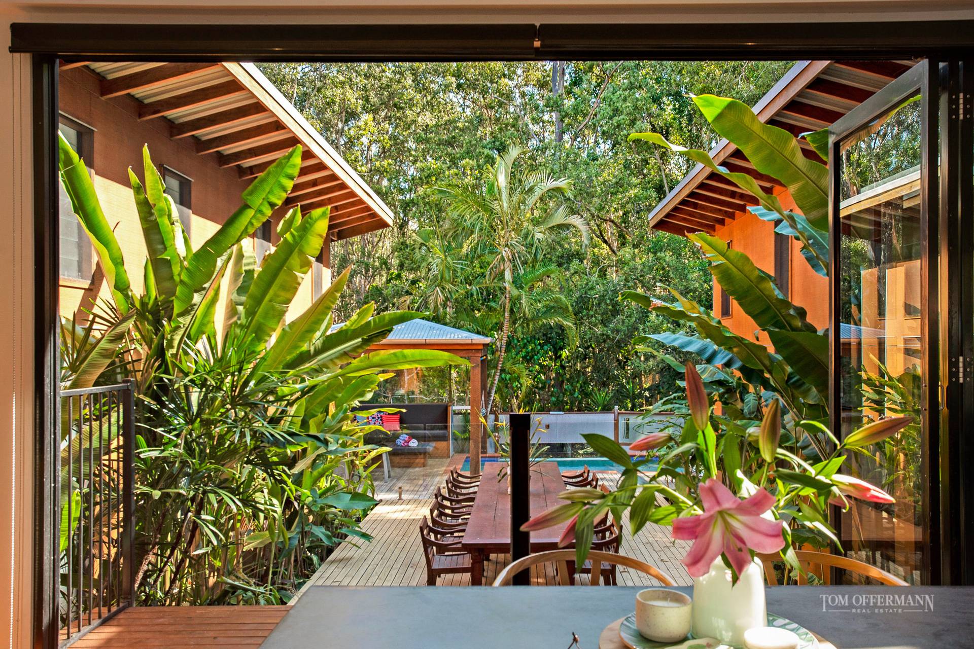 Large banks of glass bi-fold doors peel away to the north and south elevations, while a central breezeway of timber decking draws your eye to the coped tile edge of a very inviting eleven metre pool ideal for a few laps and perfect for lazy summer days. Brilliant flowering heliconia and lush Rhapis palm shoulder a dinner table ready to seat ten or entertain a rollicking get together of thirty.