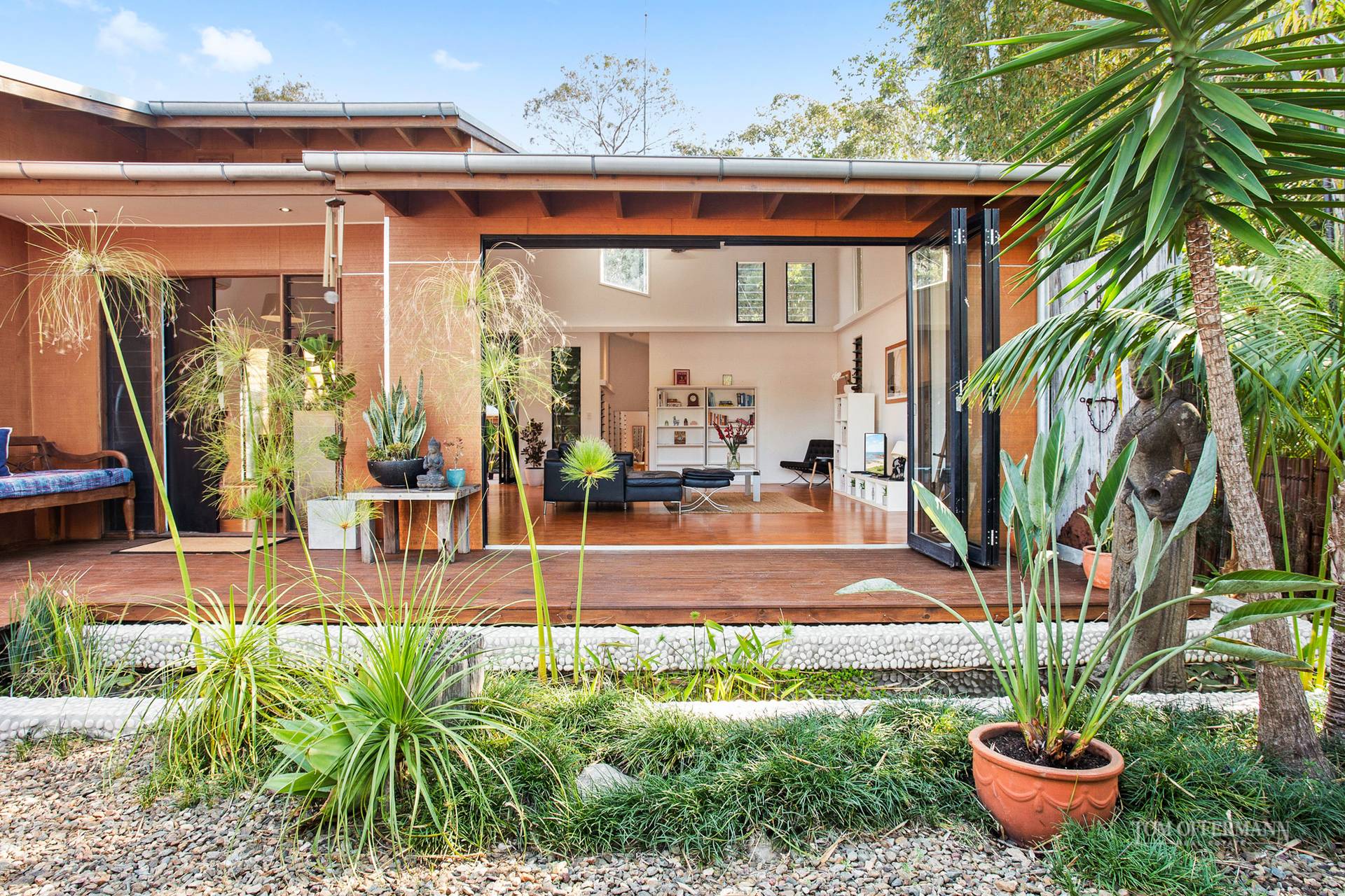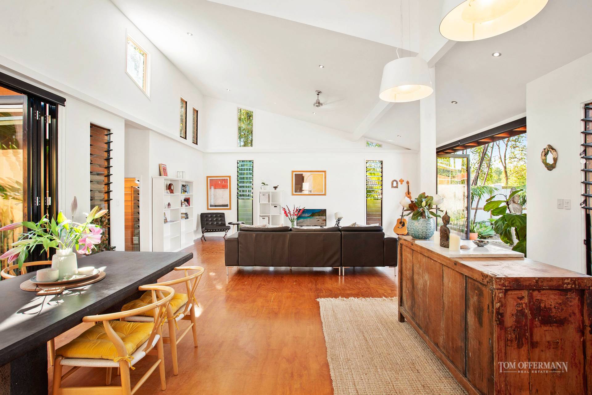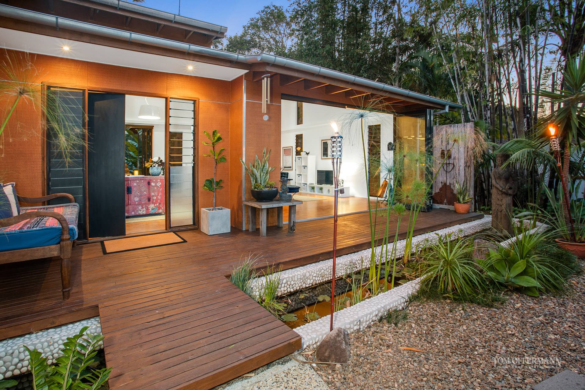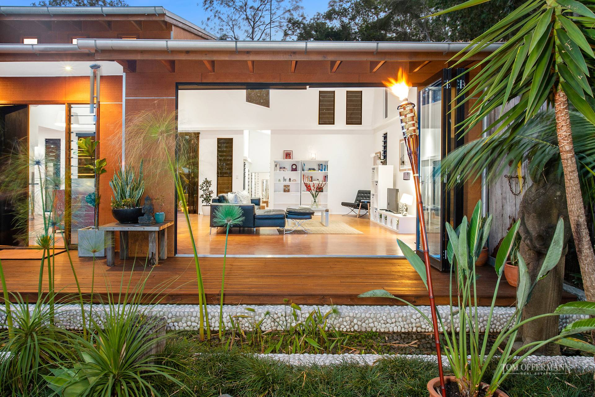 Large banks of glass bi-fold doors peel away to the north and south elevations, while a central breezeway of timber decking draws your eye to the coped tile edge of a very inviting eleven metre pool ideal for a few laps and perfect for lazy summer days. Brilliant flowering heliconia and lush Rhapis palm shoulder a dinner table ready to seat ten or entertain a rollicking get together of thirty.