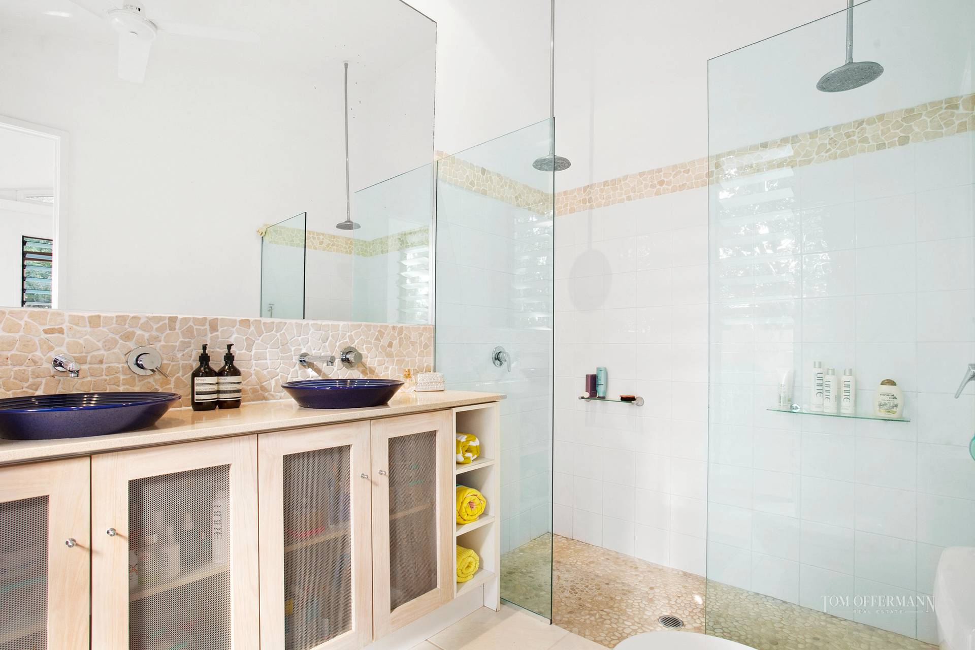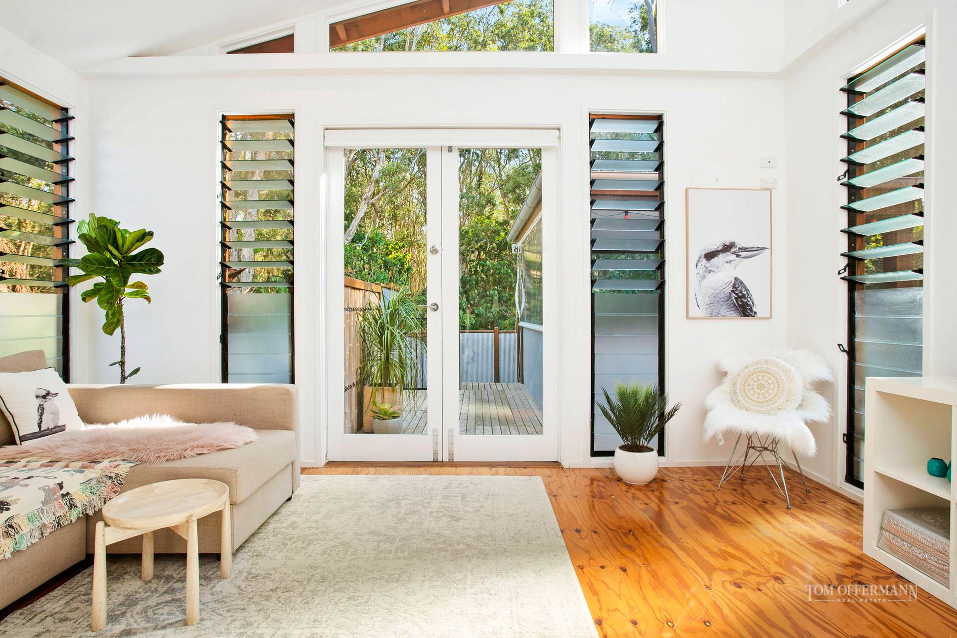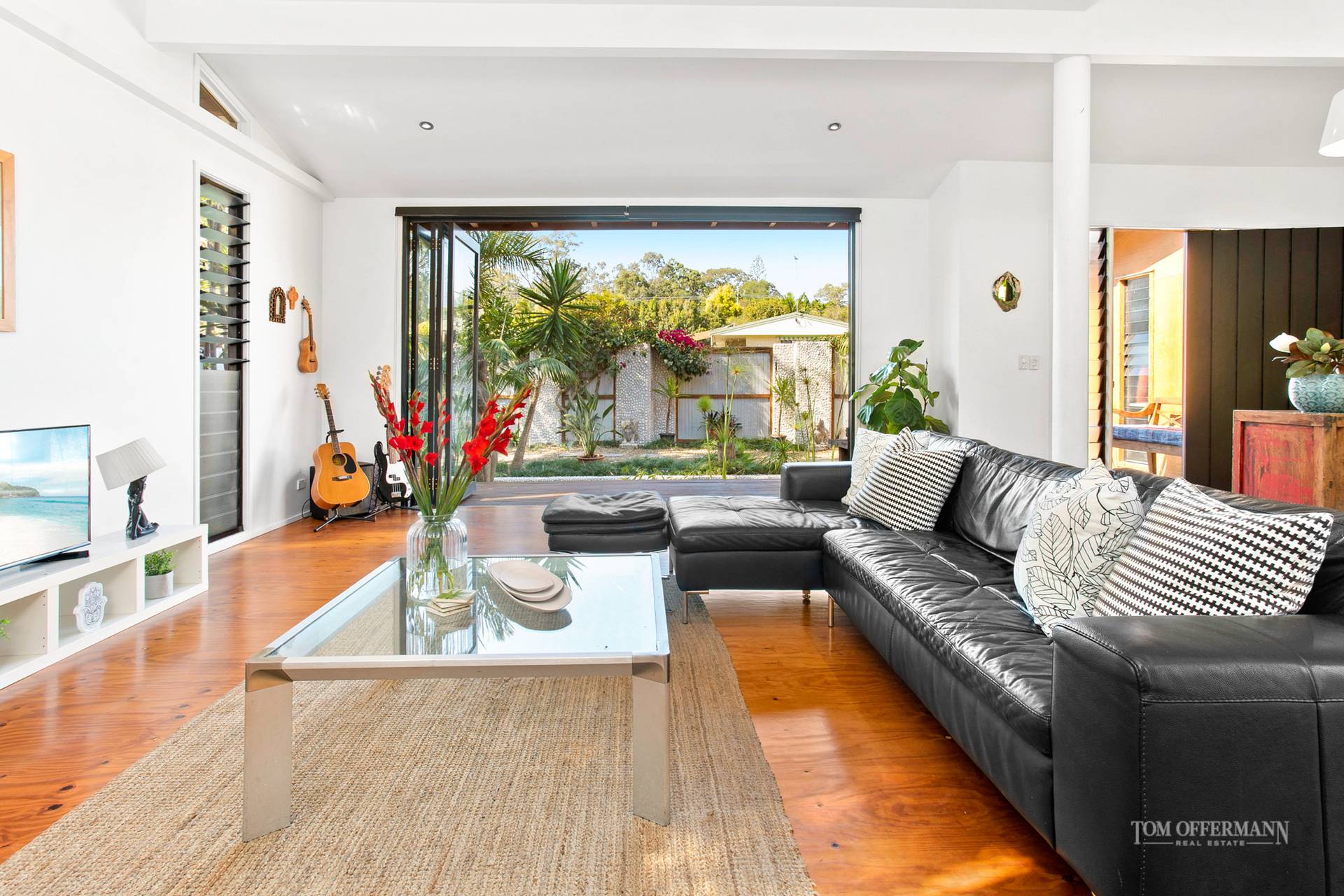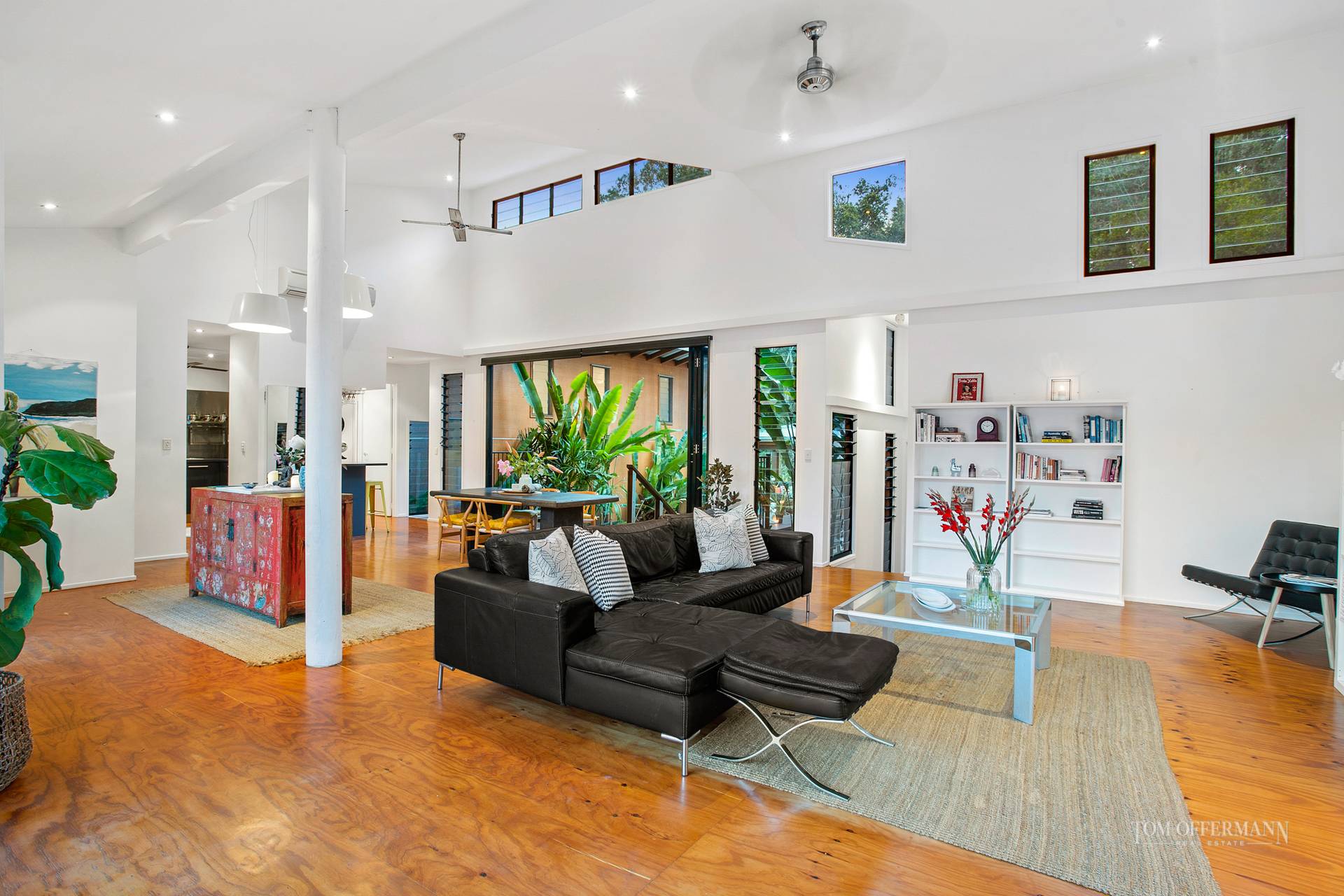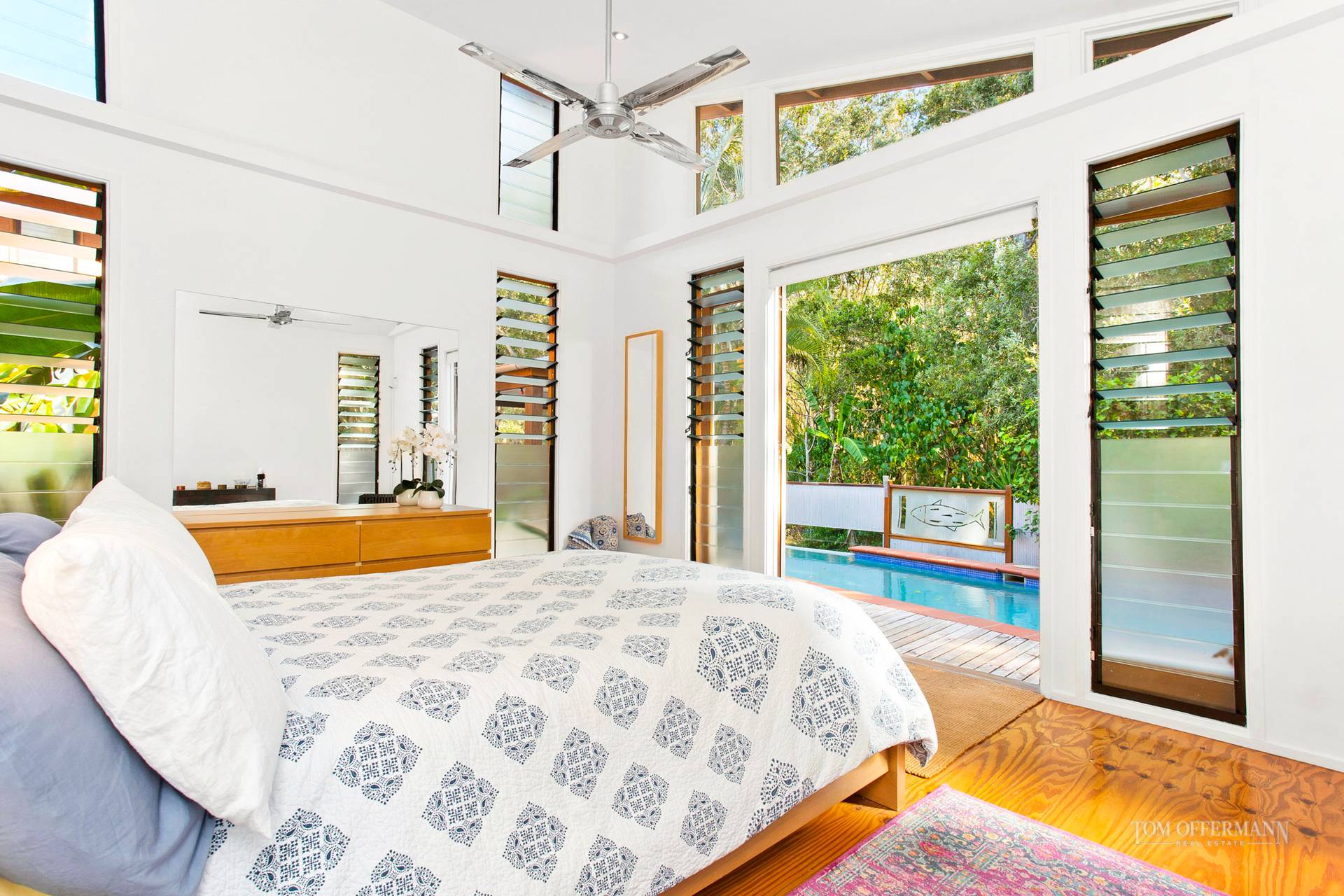 Large banks of glass bi-fold doors peel away to the north and south elevations, while a central breezeway of timber decking draws your eye to the coped tile edge of a very inviting eleven metre pool ideal for a few laps and perfect for lazy summer days. Brilliant flowering heliconia and lush Rhapis palm shoulder a dinner table ready to seat ten or entertain a rollicking get together of thirty.