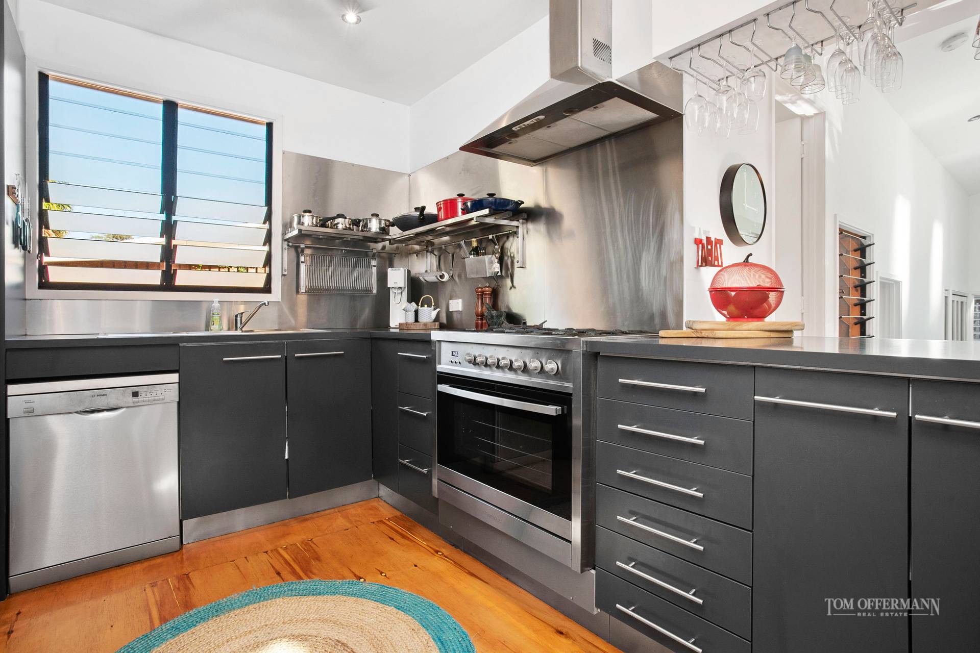 A deep petrel shade in cupboards and bench tops is reflected in the stainless backsplash of a well set out kitchen with large five burner gas and electric range, open servery, dishwasher and plenty of cupboard and preparation space to suit the budding home chef.