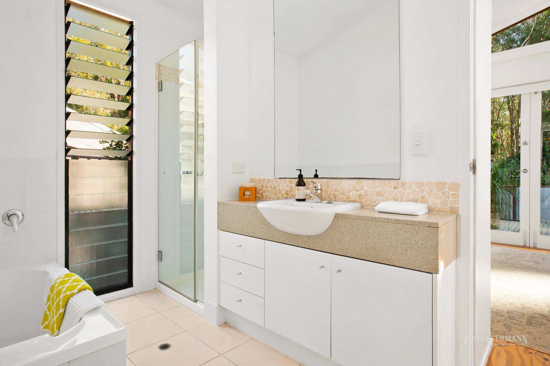 The main bedroom is a haven of tranquillity, with twin rainwater showerheads in a large ensuite, French doors to the deck and concertina door cupboards featured uniformly throughout the house. A private office/4th bedroom, with side access would meet the requirements of a home based professional person. In the other wing two further built-in bedrooms share a two-way bathroom and there is a powder room nearby.