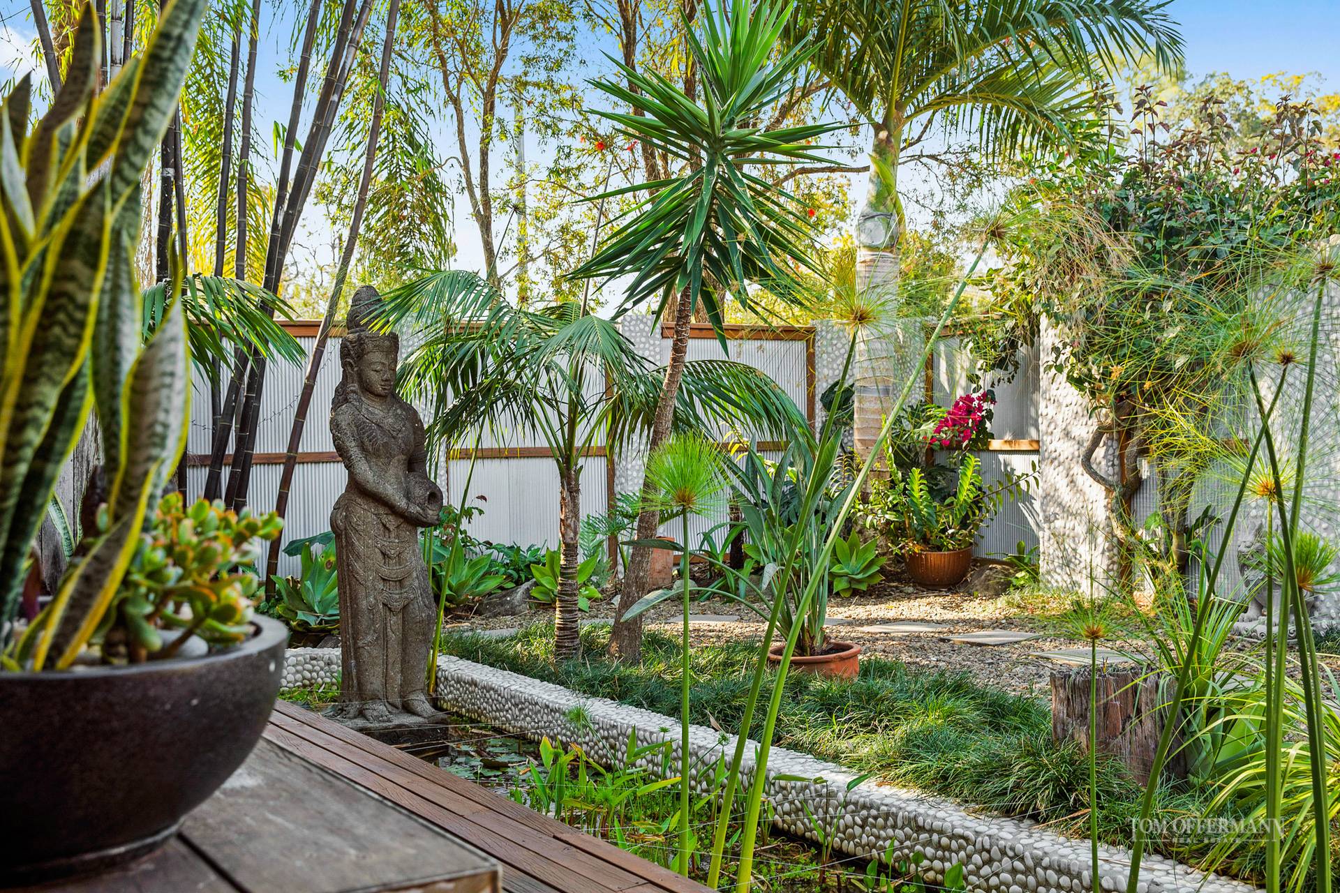 There is a sense of anticipation and surprise the moment you step through the keypad security gate and enter this oasis of calm and light. Amidst the sway of exotic palms and towering bamboo you are transported to the island of your dreams. A life-size Buddha smiles serenely over the length of a beautifully designed fish pond running parallel to the north facing timber deck. A large pivoting timber door swings wide to reveal wonderfully open spaces under soaring ceilings and walls interspersed by fixed glass panels and lofty adjustable louvres.