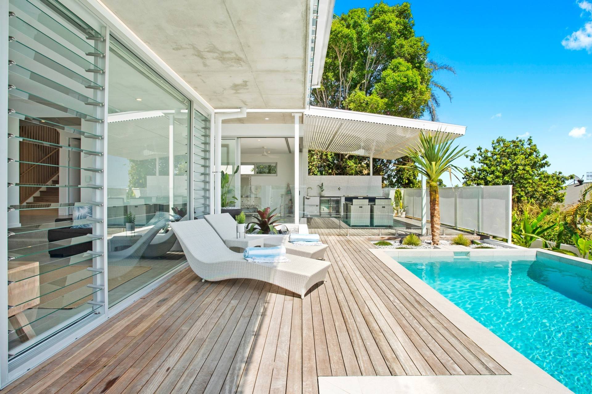 There is a large laundry room, drying deck and privately situated study to one shoulder as the home links to a slightly removed children's wing of two bedrooms and lounge facing the aquamarine waters of an inviting seven by three metre pool. Spotted gum decking wraps the pool and extends to frame a fantastic games room and sundeck where walls of glass doors peel away and a translucent roof filters light atop a built-in outdoor kitchen. Entertainment central is where poolside parties, latest release films and the grand final match of the day are on the menu.