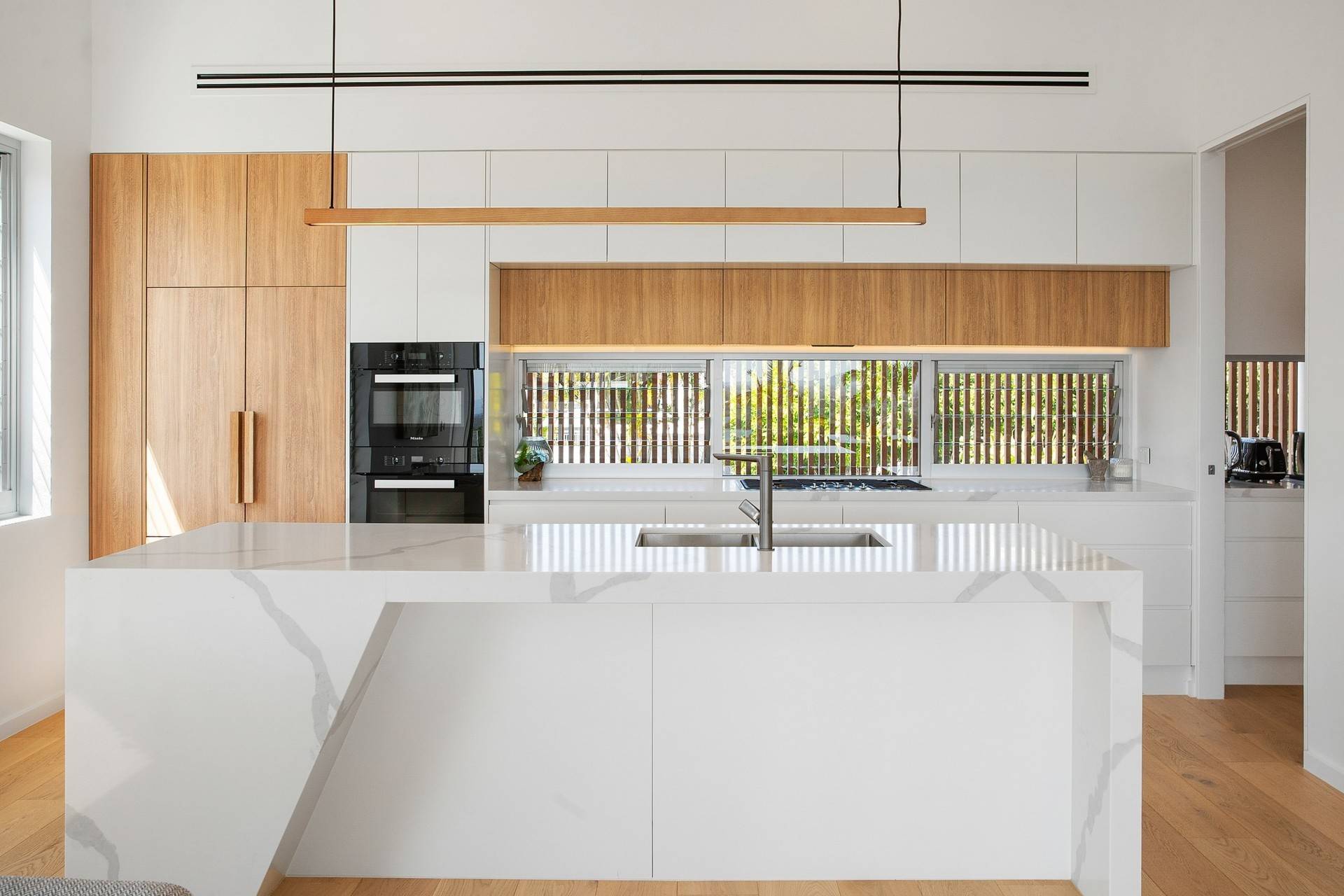 Upstairs awaits in all its glory. The jaw dropping views are enhanced by tactile finishes to superb joinery and wide profile oak flooring that invites a shoes off experience. A large lounge in the east wing connects to a powder room catering to dinner parties and family. The oak floors are an absolute knockout. Addressing this level is a waterfall island bench wrapped in white stone in a kitchen that displays the elegant simplicity of quality appliances, soft close drawers, integrated ice maker fridge, dishwasher, walk in pantry and upper cupboard silent extraction fan.
