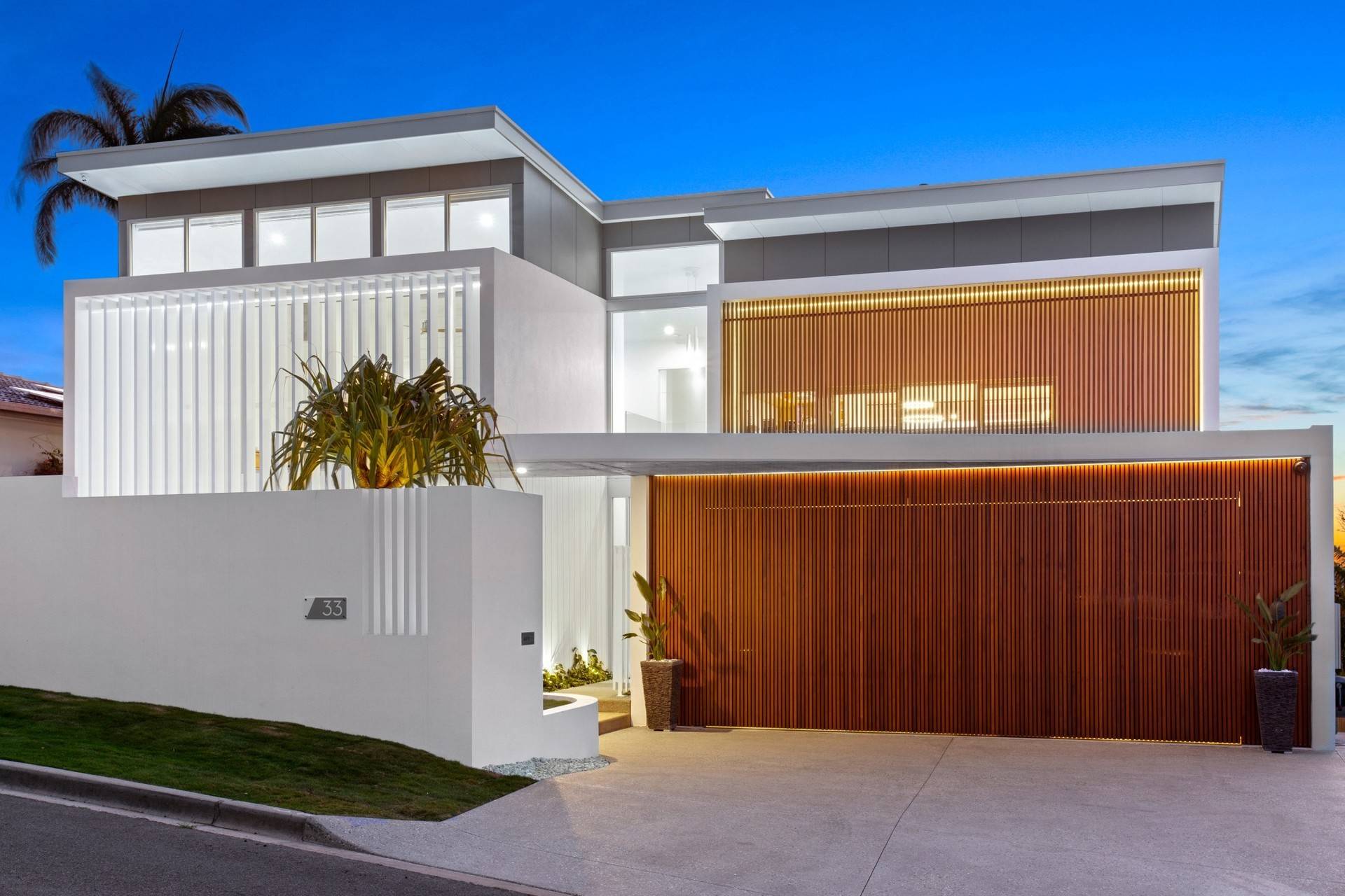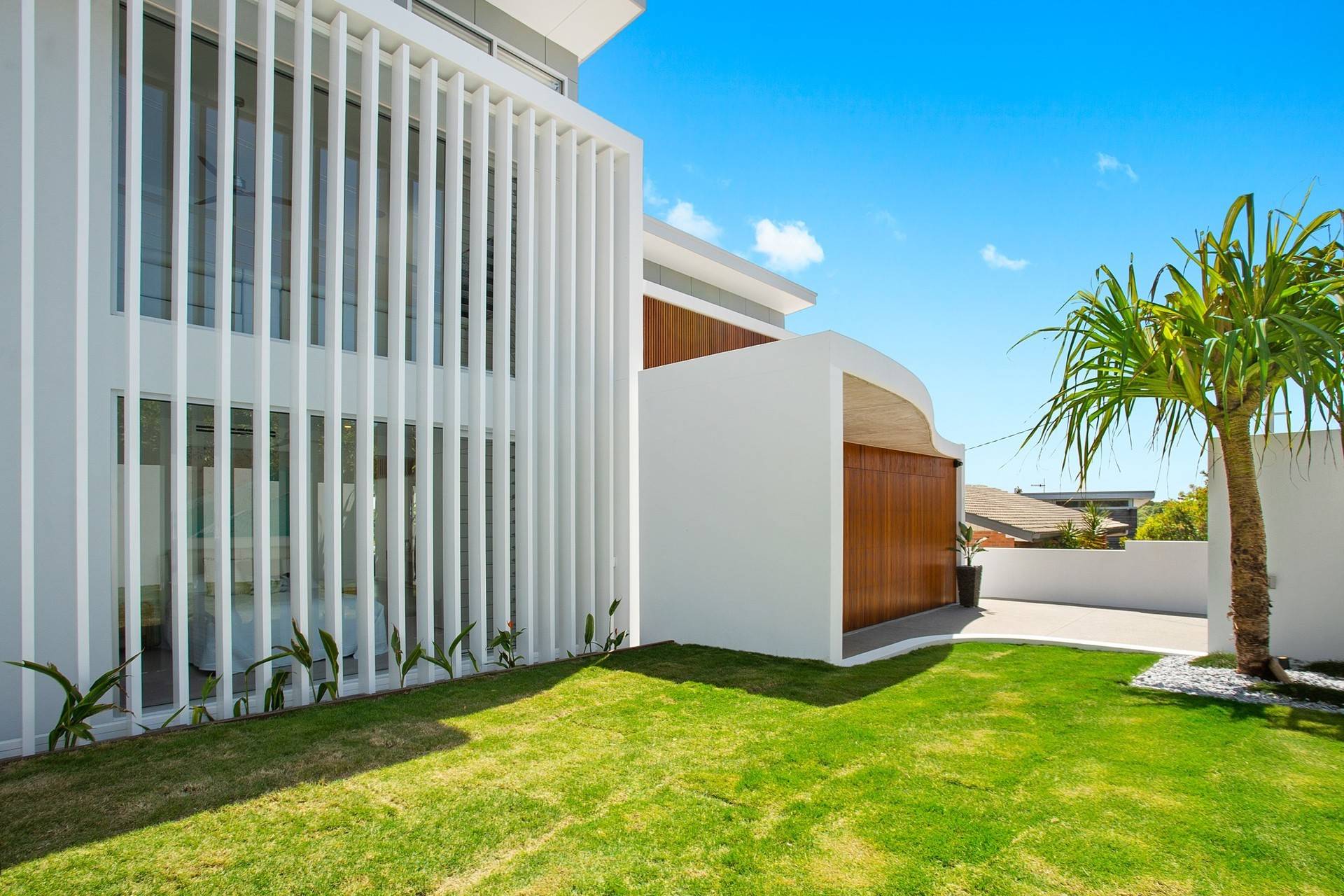 A glorious white rendered finish to the exterior walls of the suspended slab construction is framed by a solid boundary wall to an eastern courtyard and the lush green of Augusta Zoysia grass. The curve of the boundary wall and the solid concrete flyover announce an intercom security gate entry and pathway approach to an oversize glass door. Step into a wondrously open foyer and overhead a picture window on the second level greets the day.