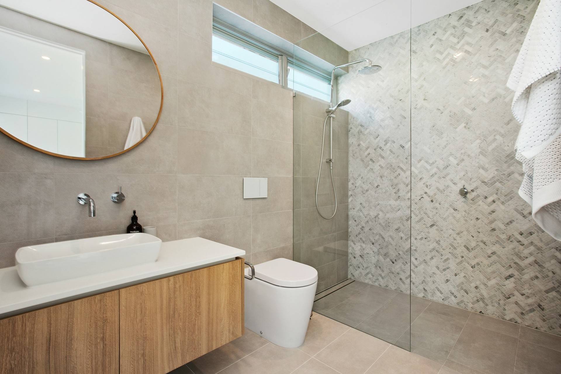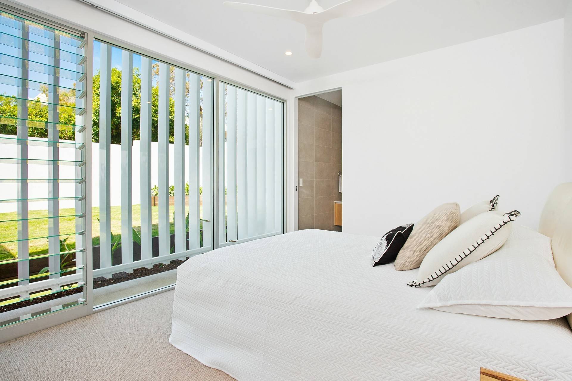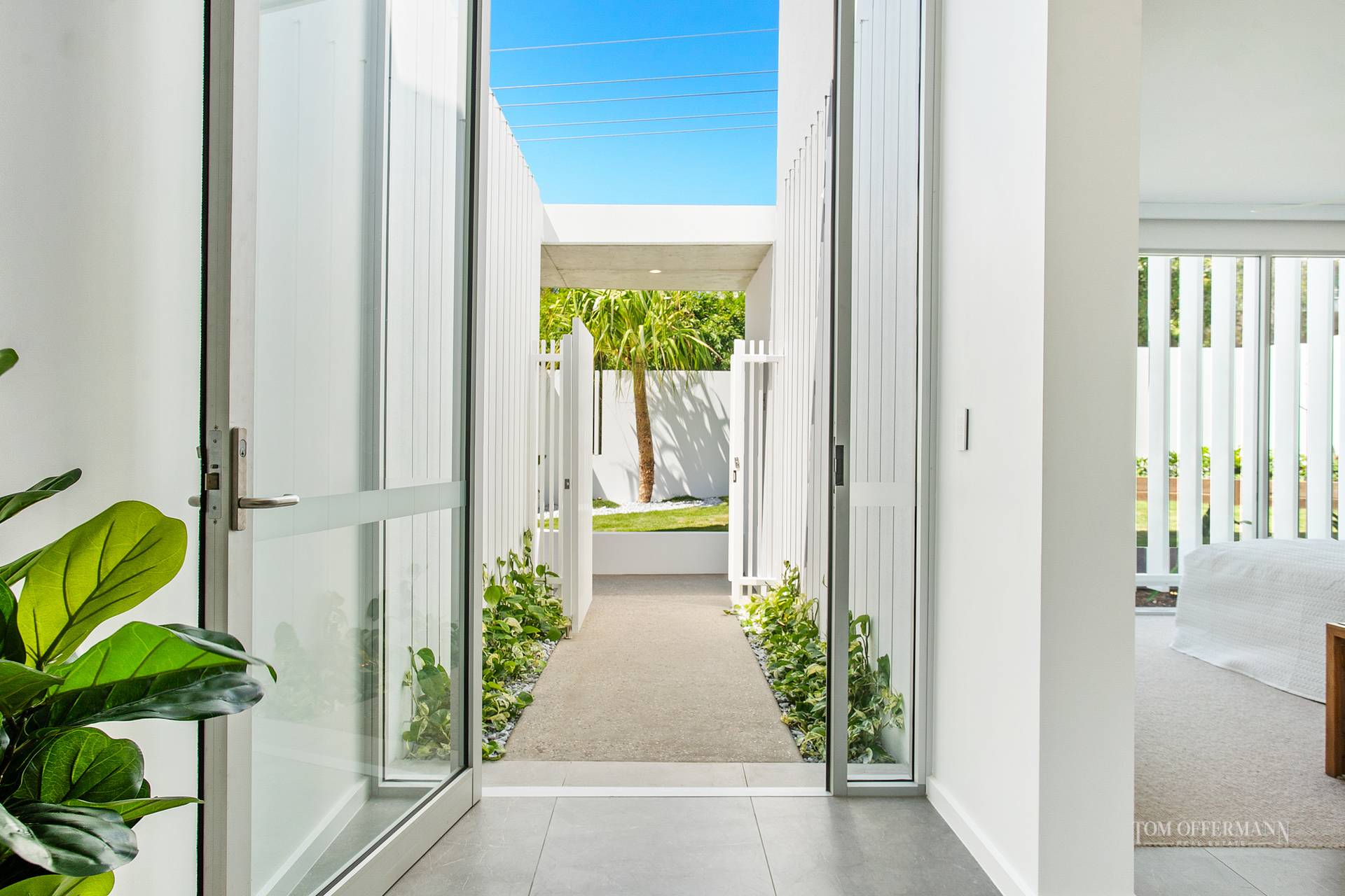 There is internal access to a large garage built wide to accommodate a cedar clad automatic door. Large format tiles in a soft grey are perfect companions to a pure white palette broken only by vast expanses of floor to ceiling glass either butting corners, sliding away or louvred to catch a sea breeze. Pale honey toned vertical timber slats and handrail grace a handsome staircase. Your eye is drawn to a light well, while the home branches to a serene guest bedroom facing the eastern courtyard and individually styled ensuite.