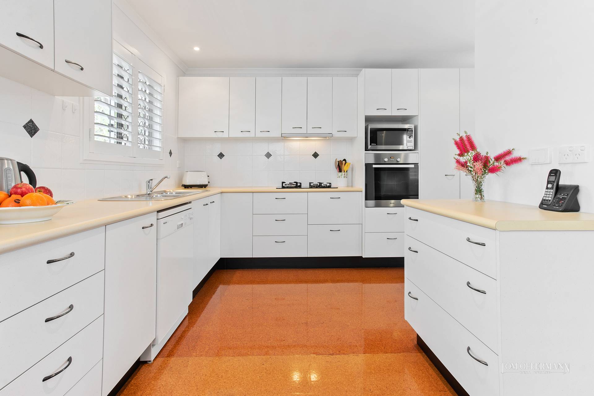 The sparkling kitchen is open plan and has quality Miele appliances and Blanco gas cooktop for those who prefer to cook with gas. It is a spacious kitchen with good amount of bench and cupboard space.