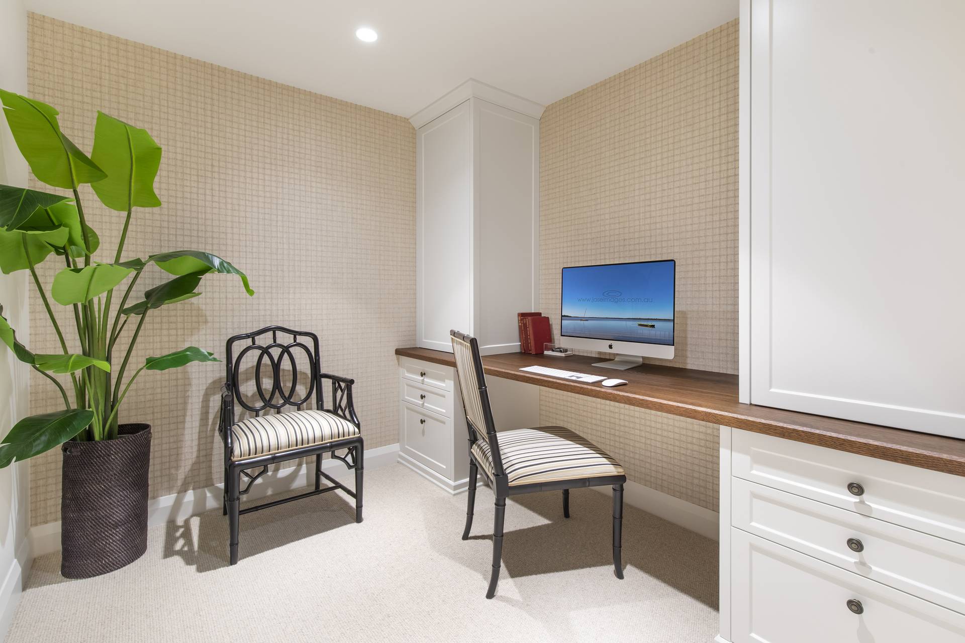 From the kitchen, glance to the media room with custom designed furniture, a state of the art Wallpaper TV and sound system. A beautifully fitted out office will make any work from home a pleasure.