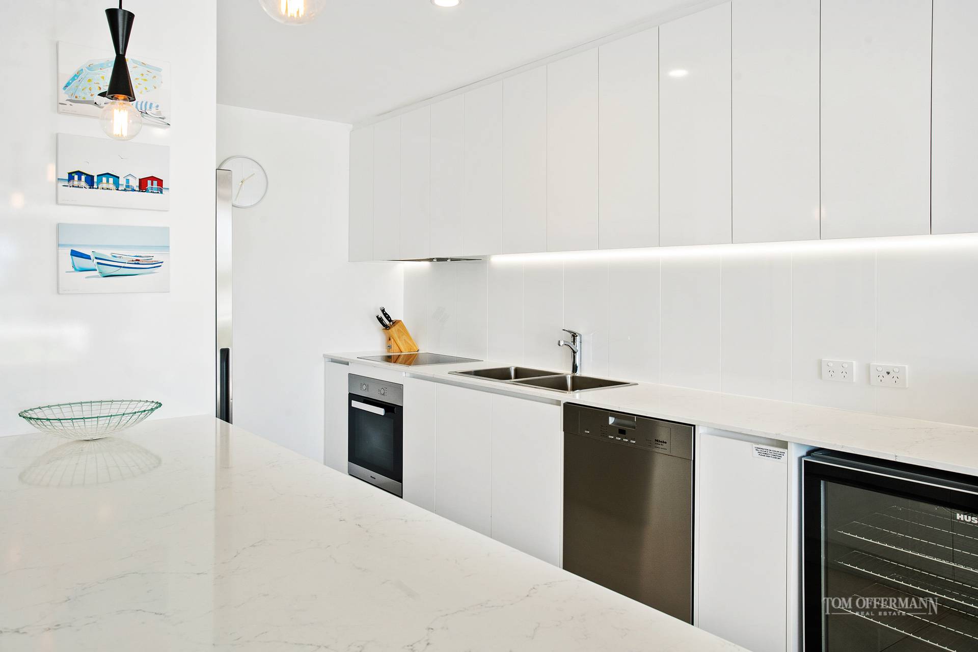 Kitchen has stone bench tops and Miele appliances and a view to inspire any cook, open plan to a casual living and dining area flowing to a large alfresco patio. The perfect place to relax and watch the ever changing waterfront vista.