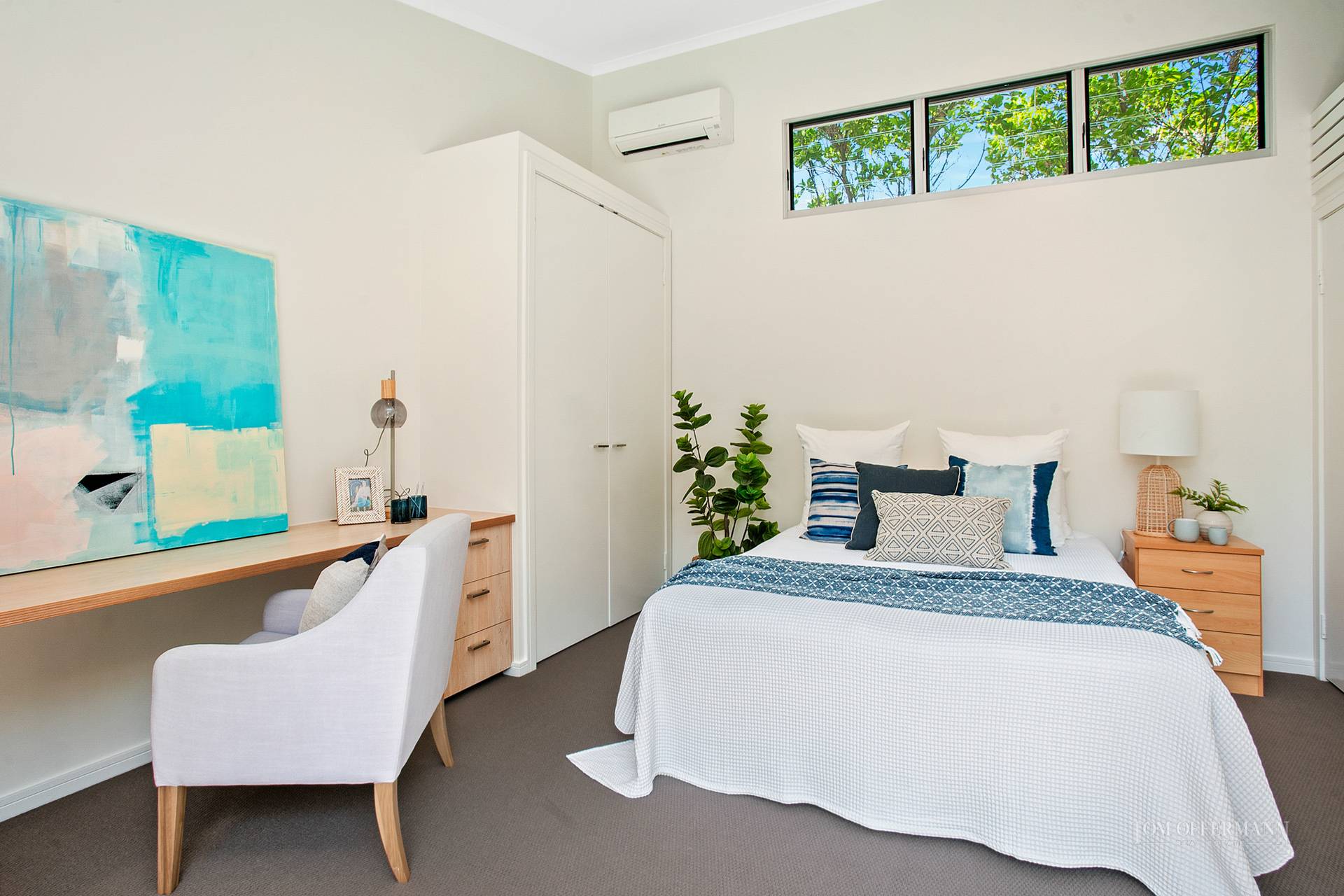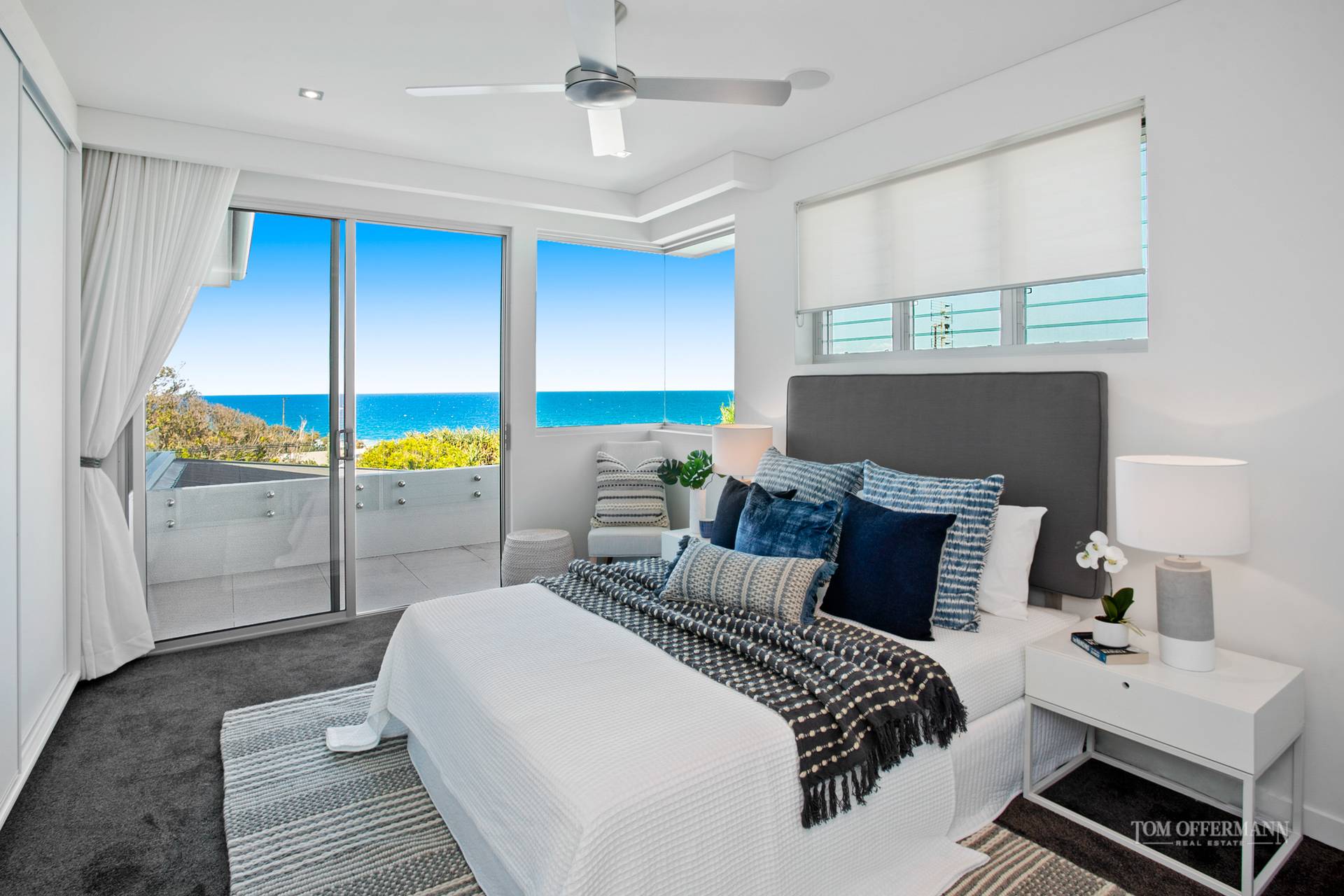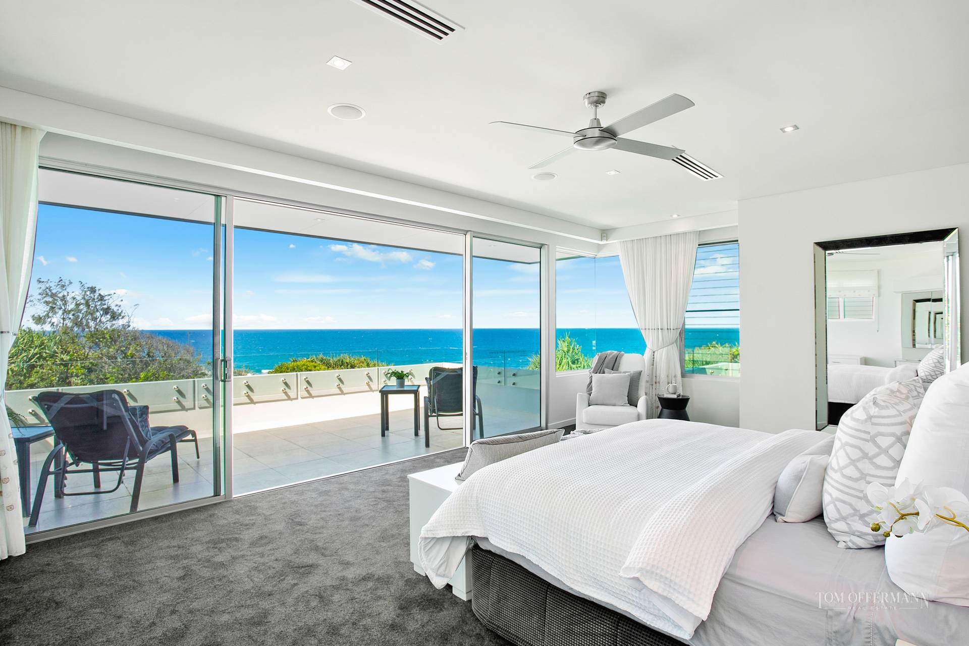A mighty staircase turns through a floor to ceiling light well and carries you to an extraordinary main bedroom suite taking complete advantage of endless ocean and white water views. Plush carpets, luxuriously styled soft furnishings and walls of glass frame a deliciously private terrace room in the sky. Backed by walls of wardrobe and drawer space an elegant flourish of a leaf fresco is a deft touch. A serene bathroom looks down over the pool courtesy of a perfectly placed glass panel edges a deep free-standing bath. A walk around frameless glass shower sports no less than three shower heads. With twin vanities, sandstone tiles, bidet and linen closet, this indulgent ensuite takes languid bathing to another level. A second bedroom with built in cupboards and nearby bathroom also captures a dreamy view down the coast.