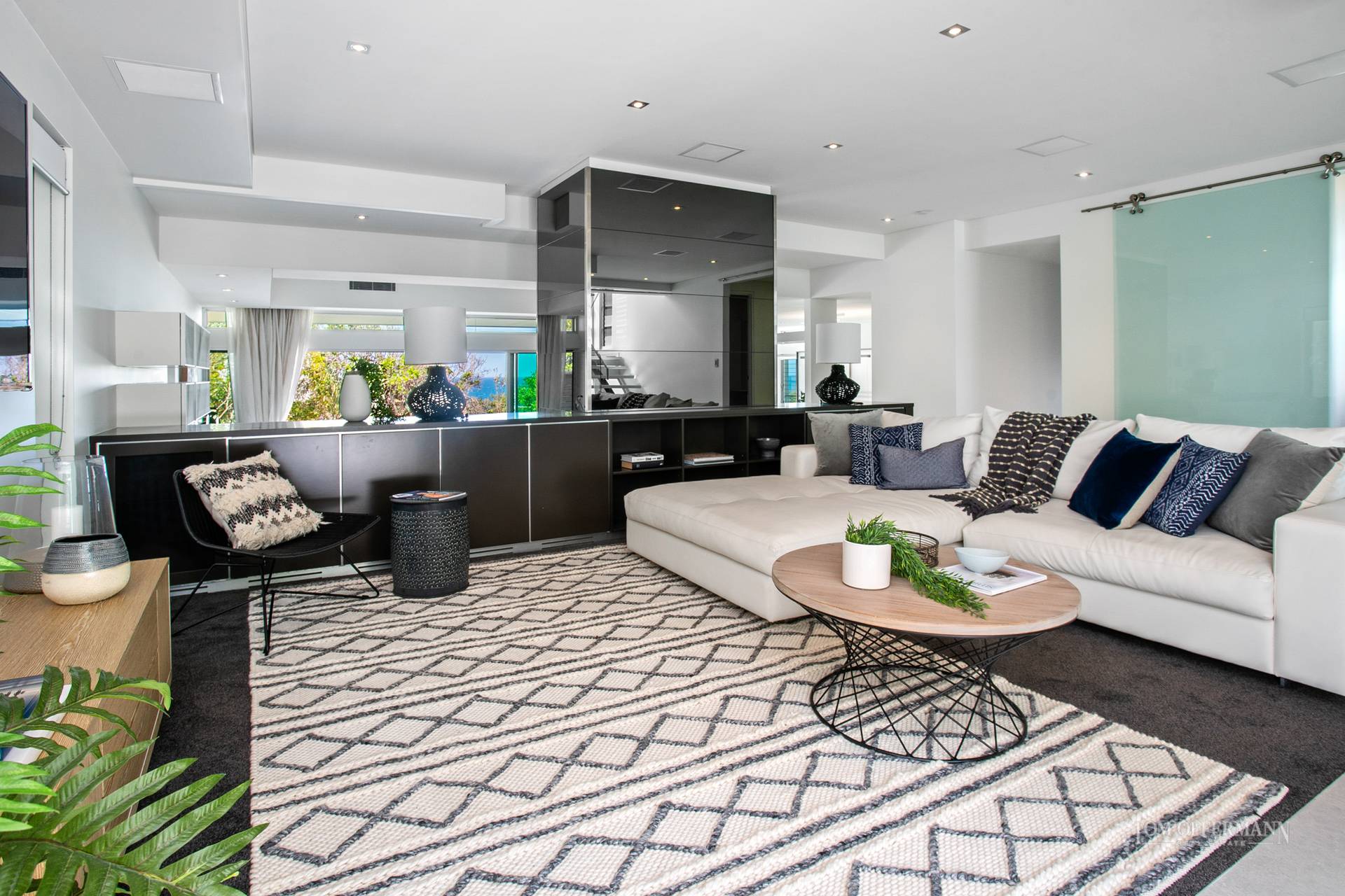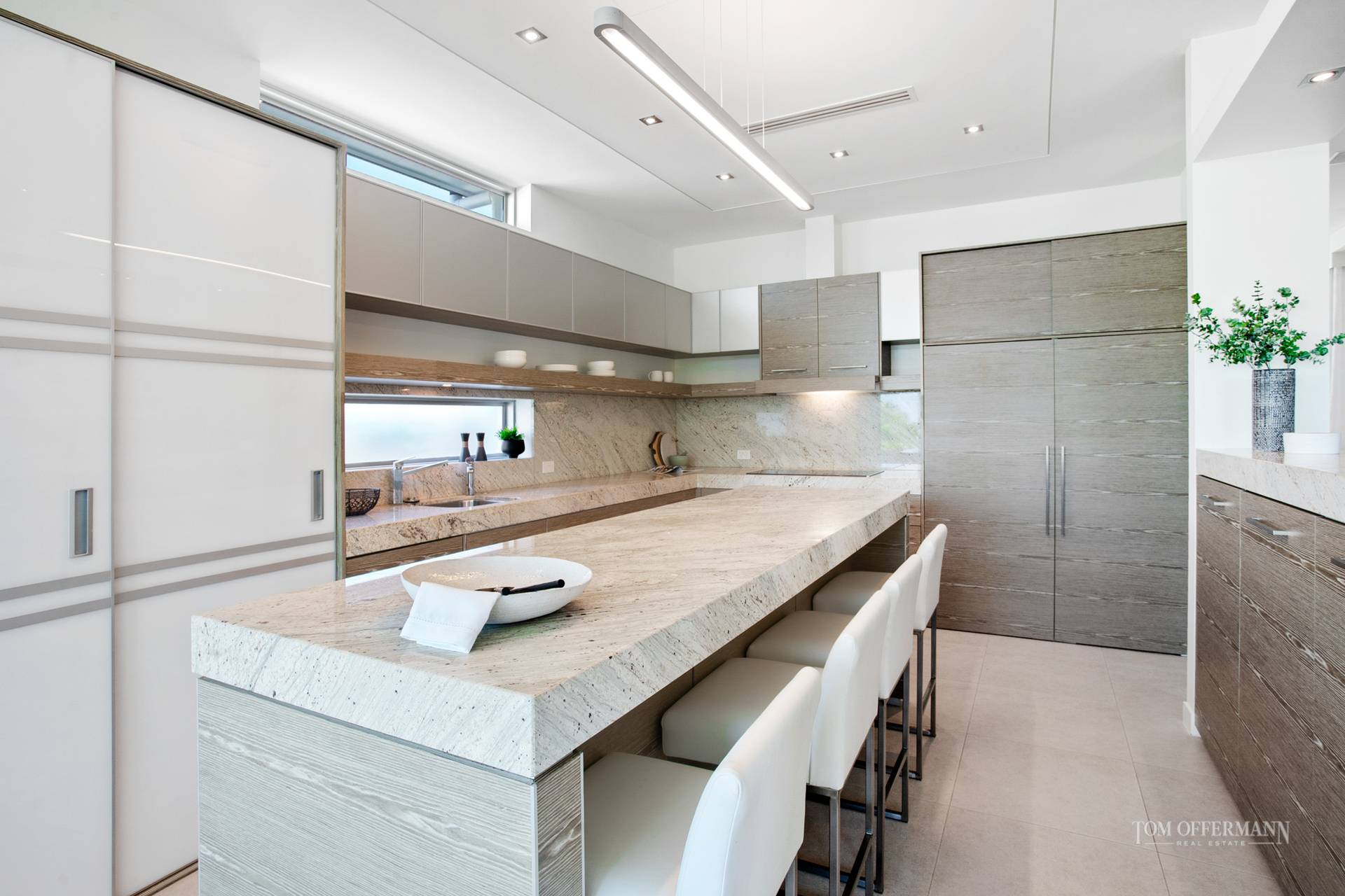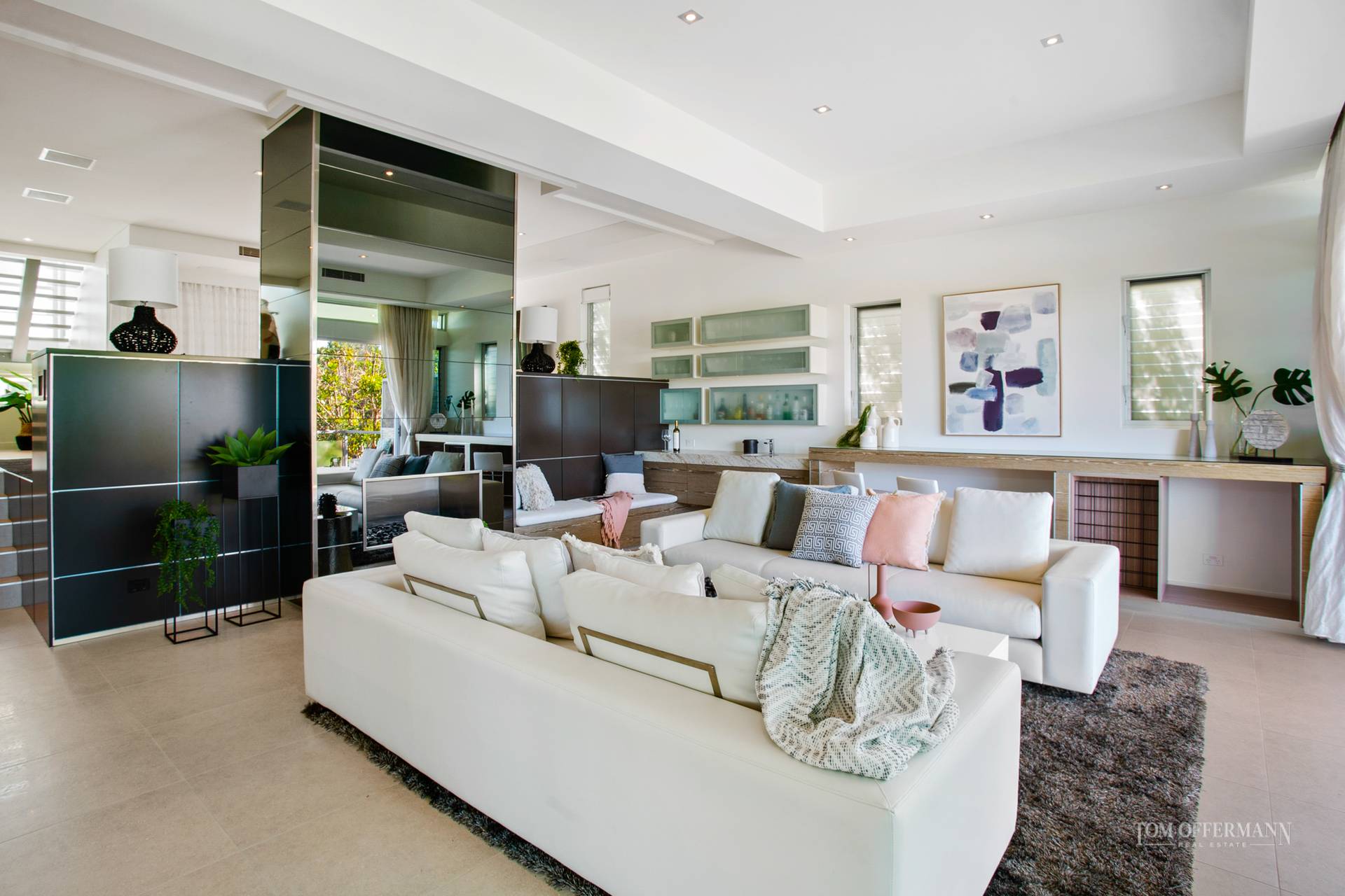 Entertain year round in the micro-climate rewarded by the homes position in the landscape. A second casual lounge where you control music and media faces glass doors that concertina to the terrace and pale blue waters of the pool. A massive frosted glass door slides to a computer office hub, large laundry and separate powder room.