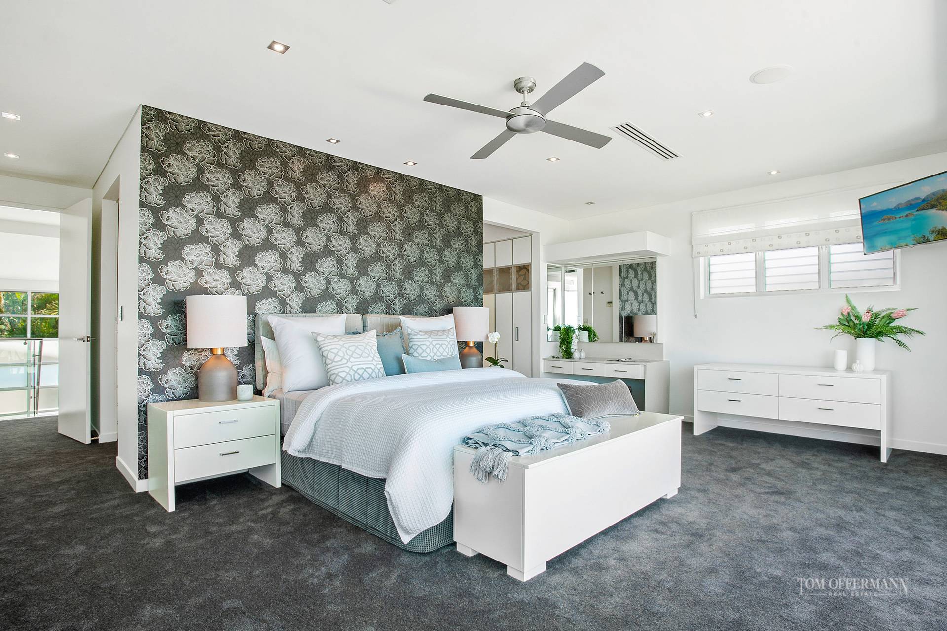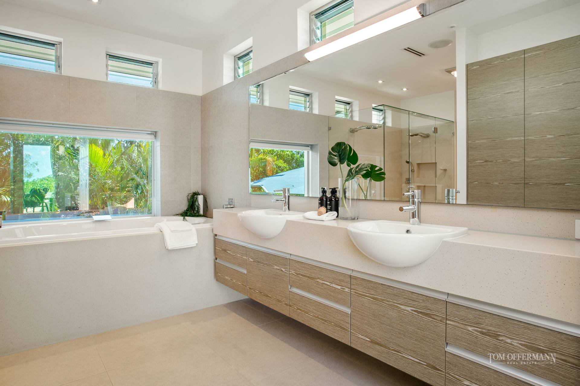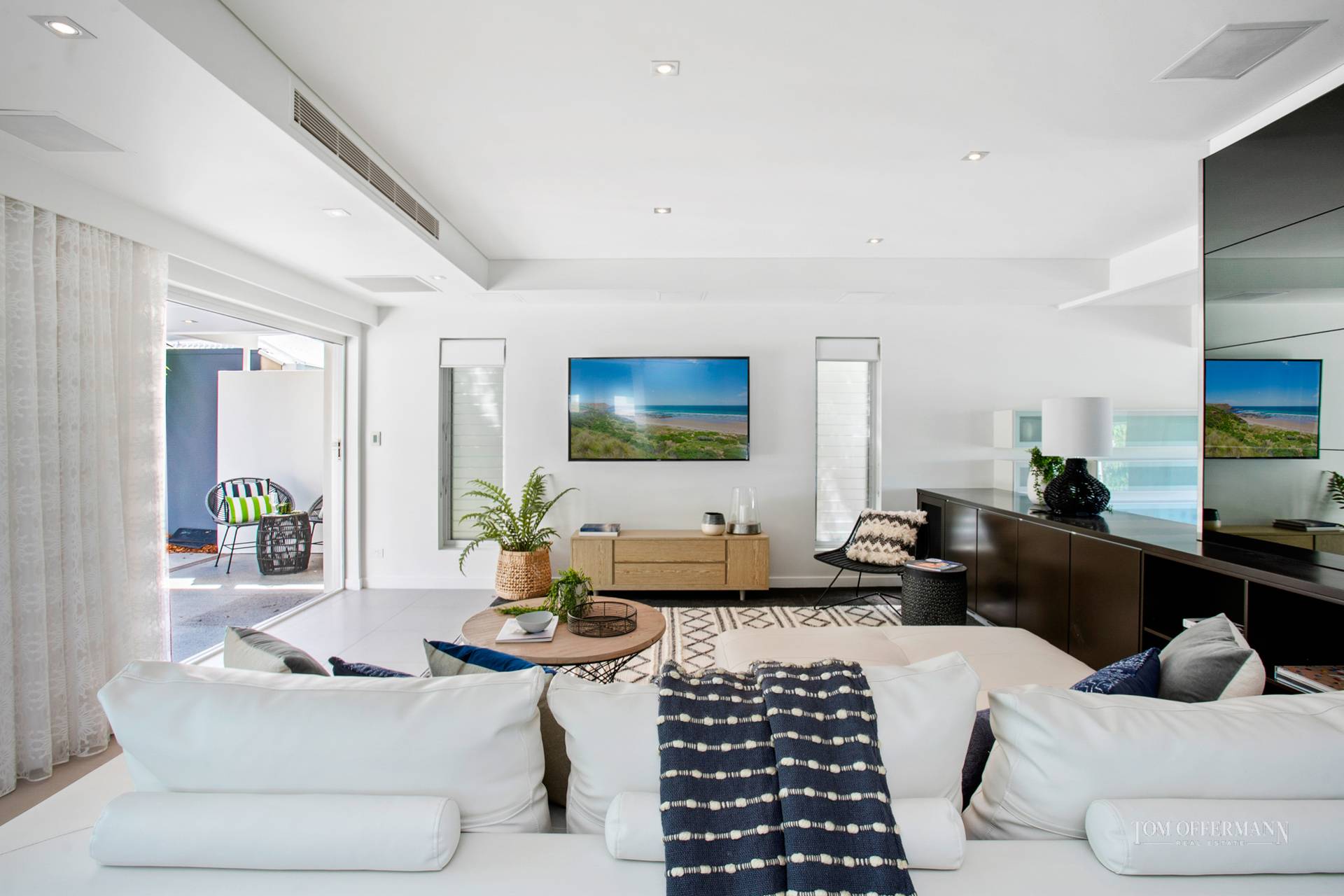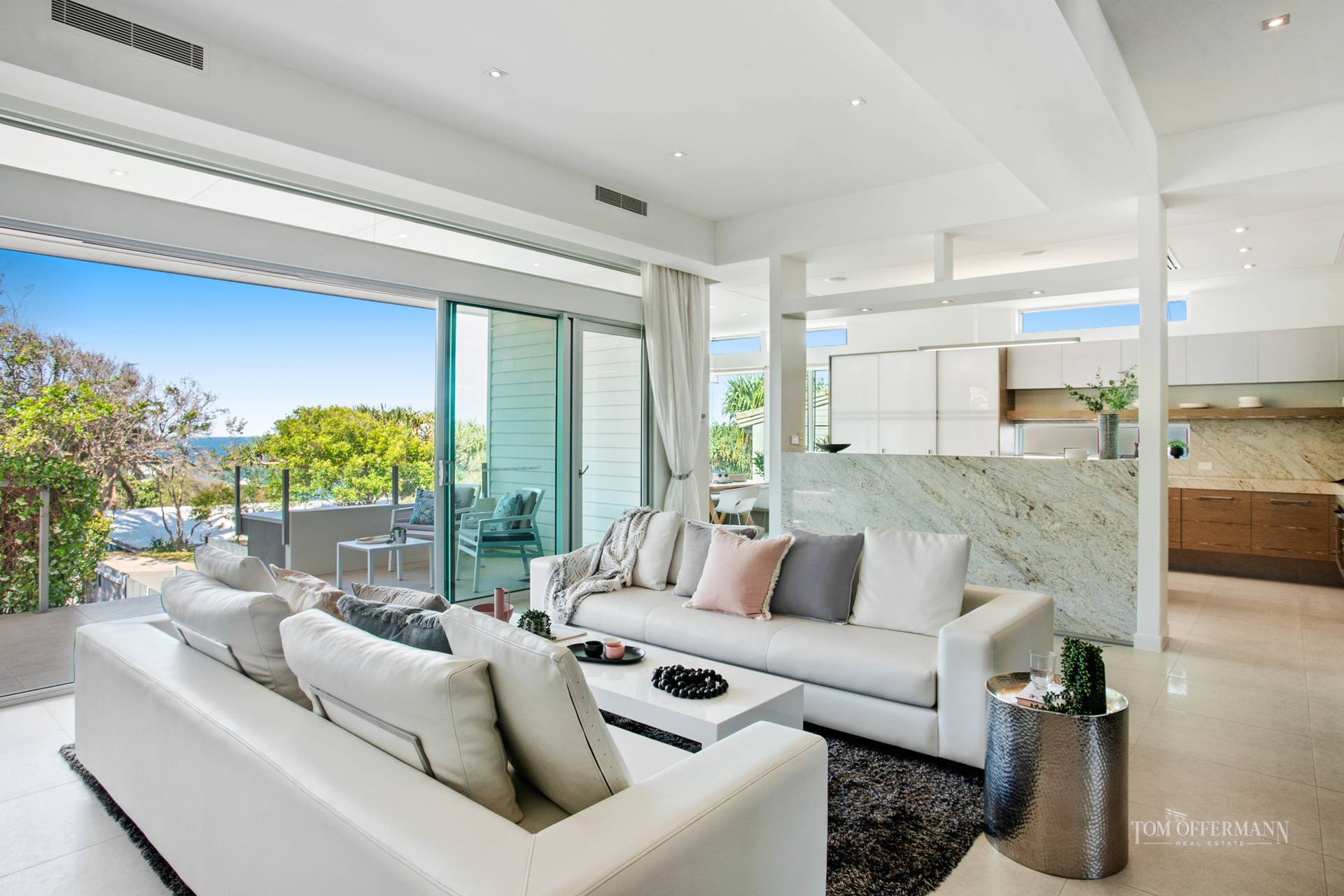 Entertain year round in the micro-climate rewarded by the homes position in the landscape. A second casual lounge where you control music and media faces glass doors that concertina to the terrace and pale blue waters of the pool. A massive frosted glass door slides to a computer office hub, large laundry and separate powder room.