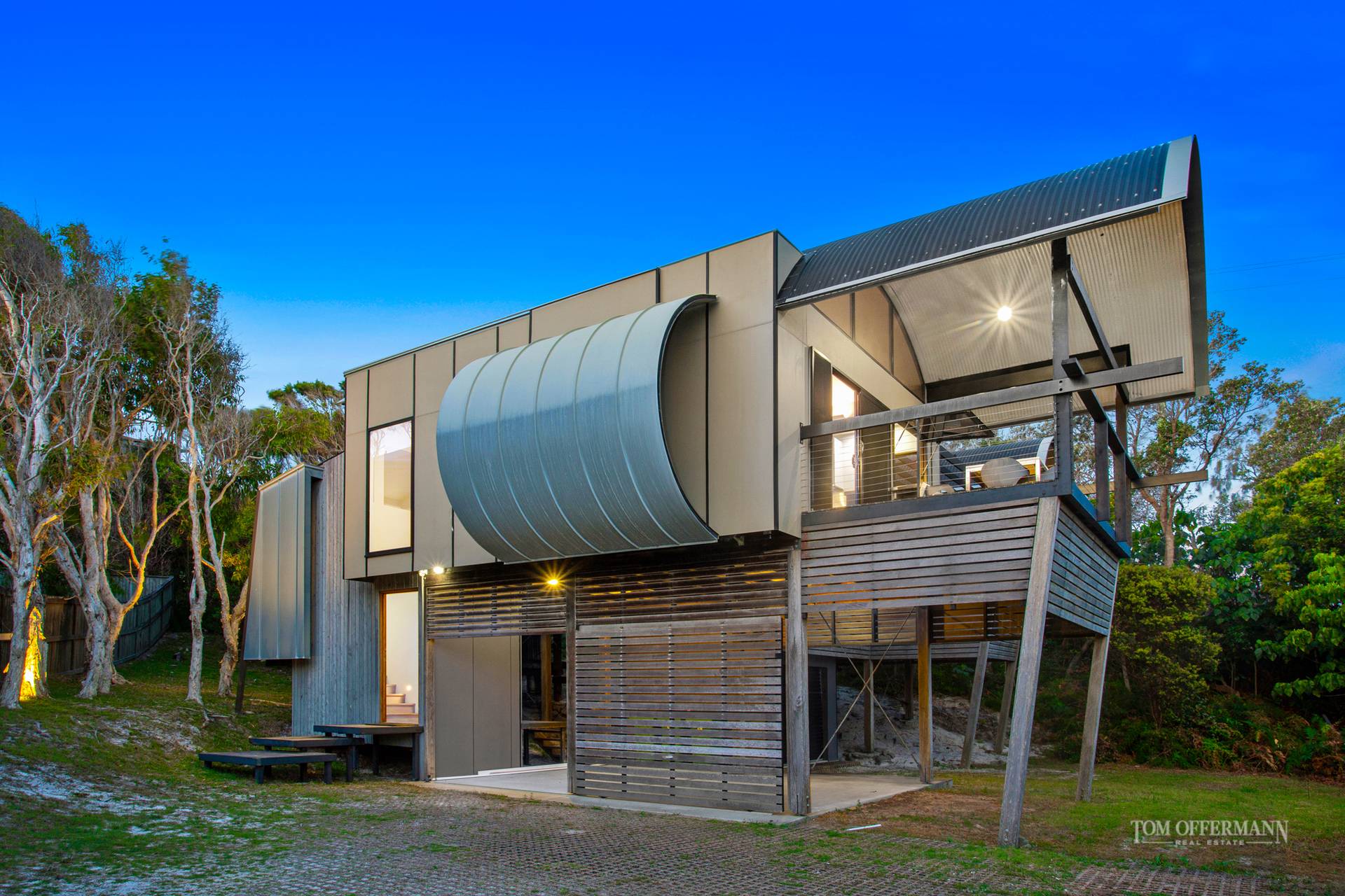 A concrete slab has a lock up roller door storage for bikes, boards and wet gear. There's a sliding gate hardstand to suit two 4WD height vehicles. This is your island-like escape where you can grab your swimsuit, stroke for the wave of the day, enjoy an enriching walk on the dog-friendly beach and as the sun sets, finish with a cocktail of choice and shot of sea breeze for good measure. The curve of the zinc aluminium roof and weathered nature of the exterior timber and metal lend credence to a beach house that's lived well within its environment. With very little effort and a reliable handyperson with an eye for quality, it will become your dreamy window to the sea as a permanent, part time, or let's go-to-the-beach weekend escape.