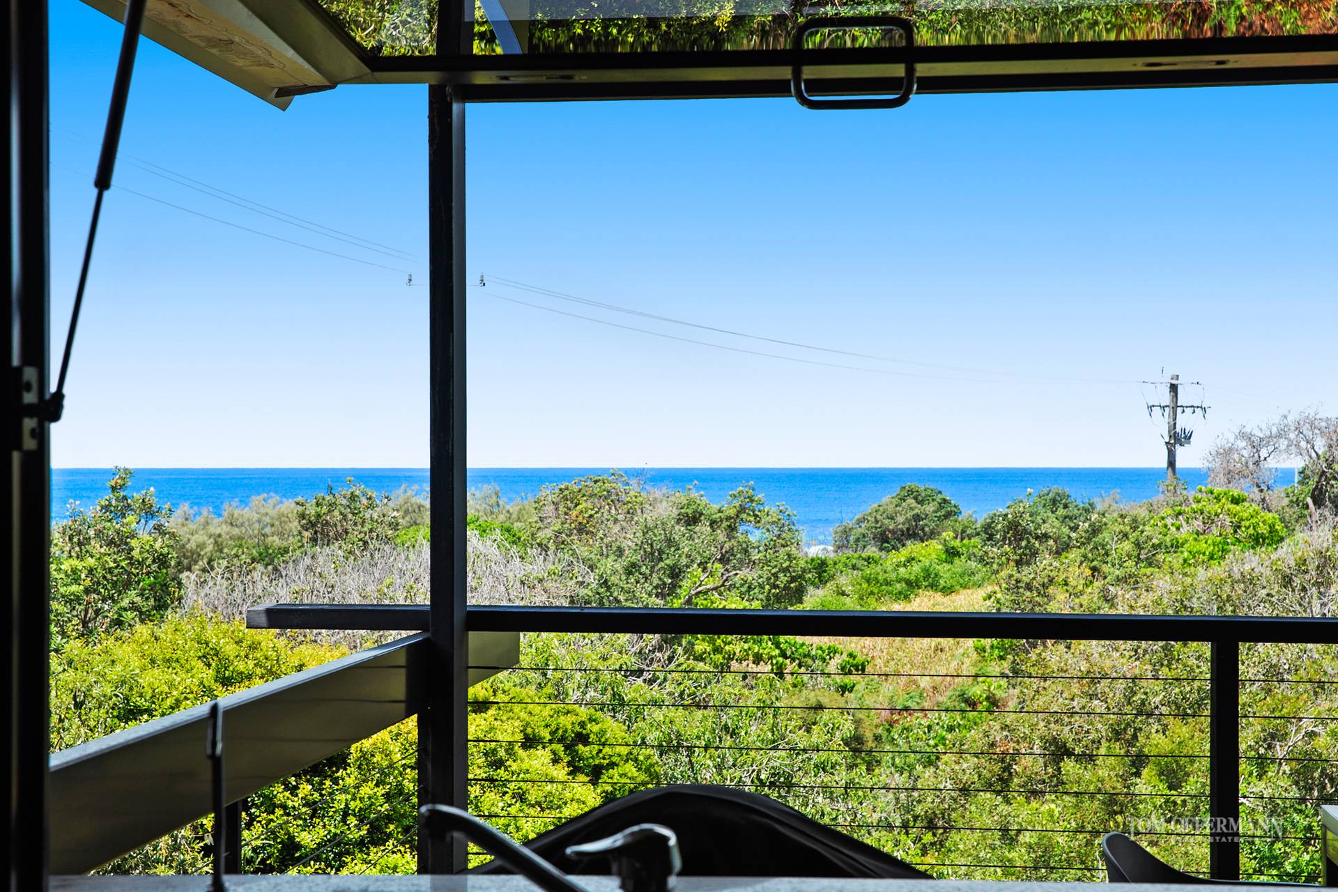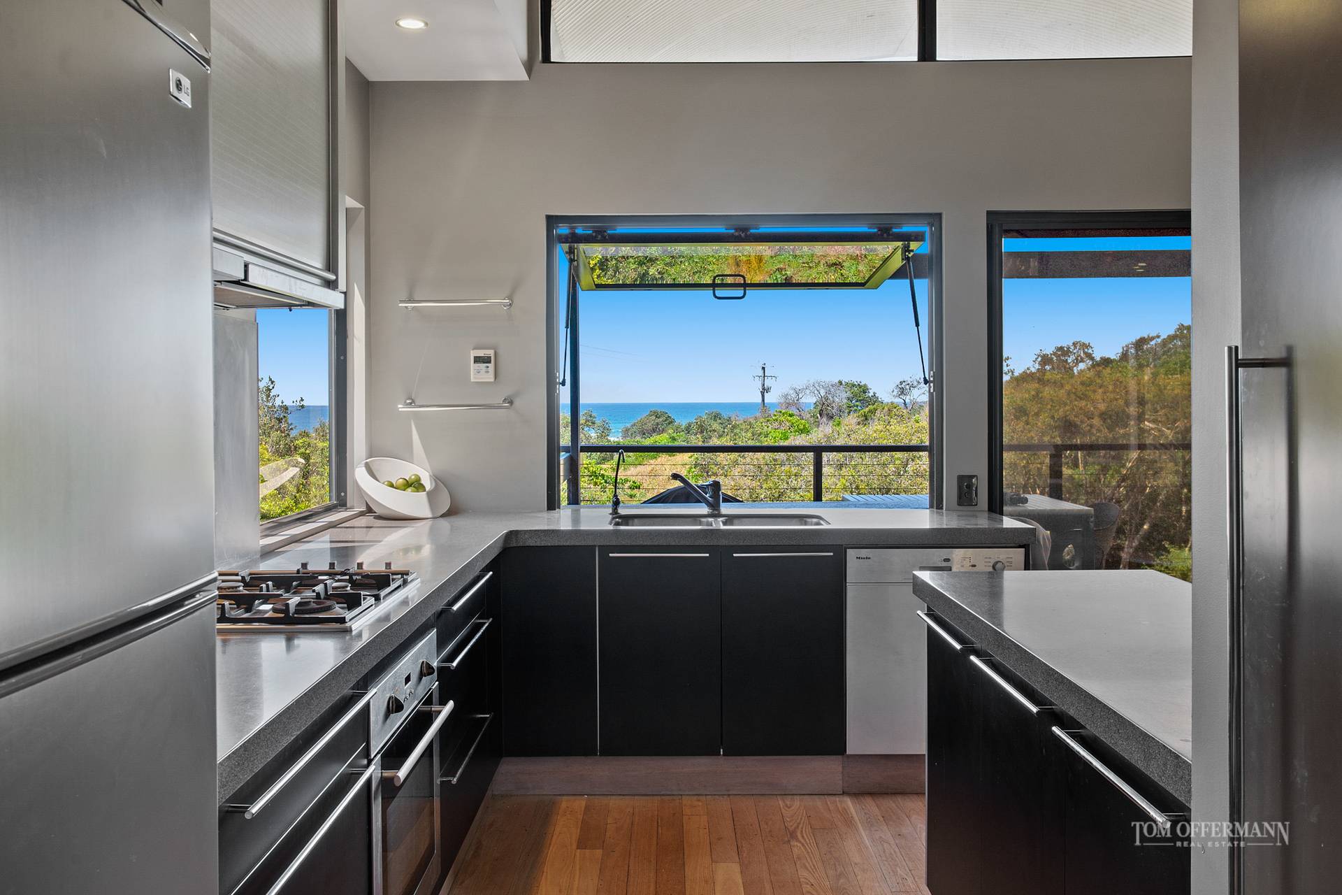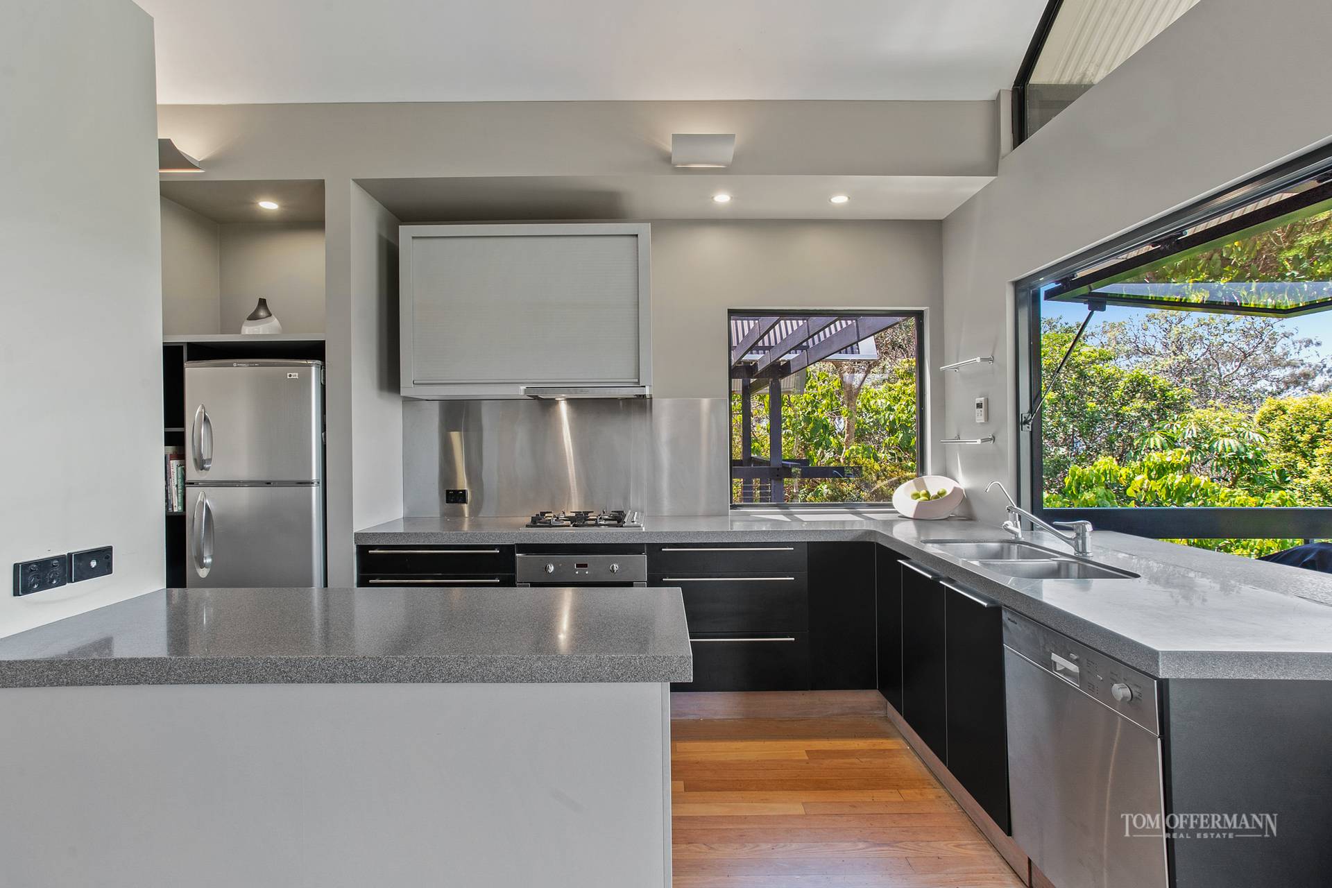 There are two bedrooms along the eastern elevation. The main and second bedrooms have floor-to-ceiling built-in cupboards and the laundry is well set up behind concertina doors in the bathroom. A robust galley kitchen has four burner gas hob, under bench electric oven, dishwasher and gas strut window servery. Timber beams extend the ships prow-shaped verandahs, with a mix of hopper, sash and sliding glass doors and windows are fitted with screens for open window nights and a soundtrack of the sea for company.