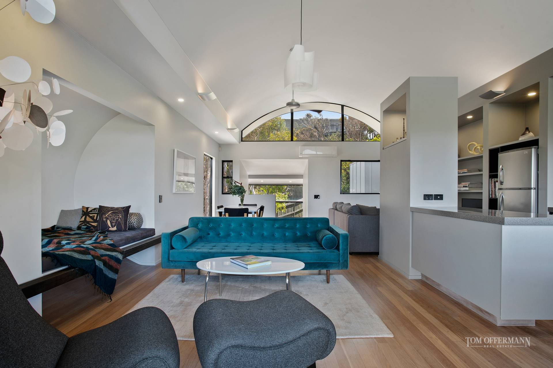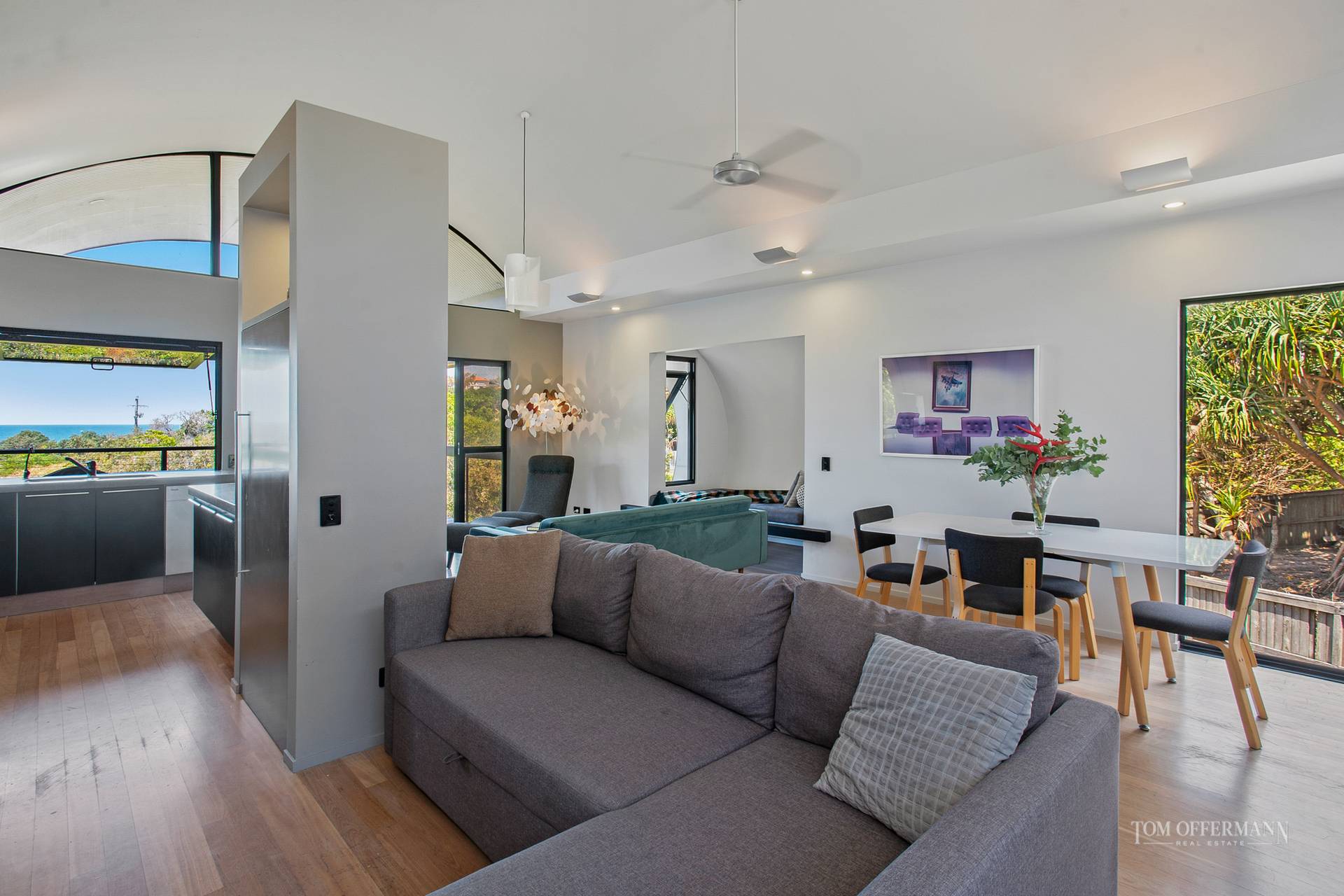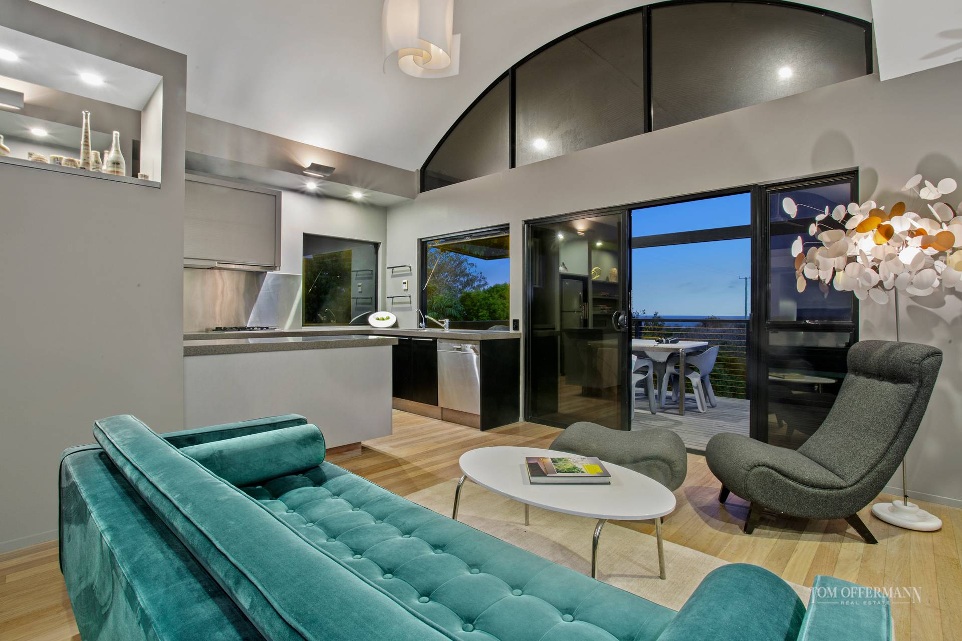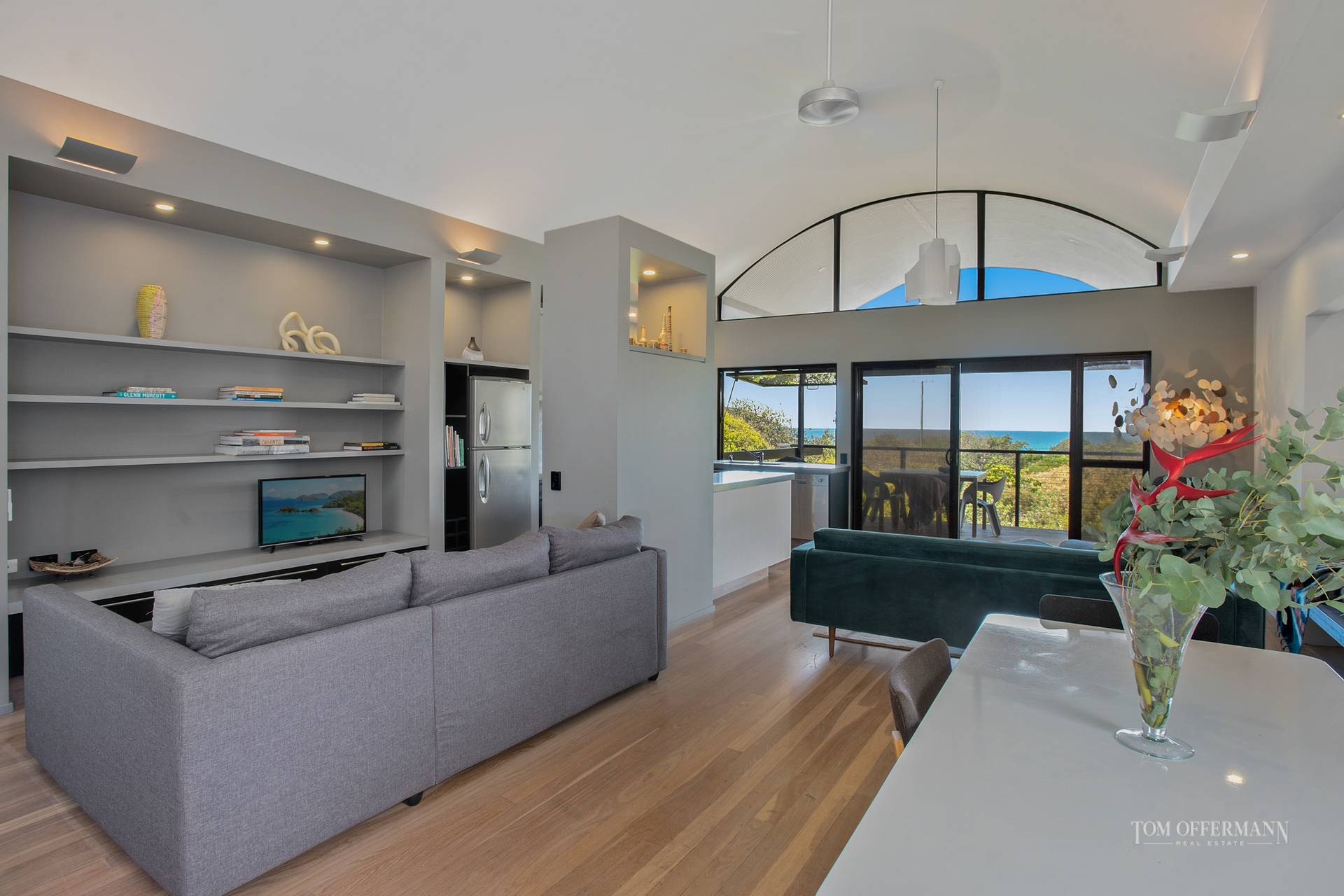 There are two bedrooms along the eastern elevation. The main and second bedrooms have floor-to-ceiling built-in cupboards and the laundry is well set up behind concertina doors in the bathroom. A robust galley kitchen has four burner gas hob, under bench electric oven, dishwasher and gas strut window servery. Timber beams extend the ships prow-shaped verandahs, with a mix of hopper, sash and sliding glass doors and windows are fitted with screens for open window nights and a soundtrack of the sea for company.