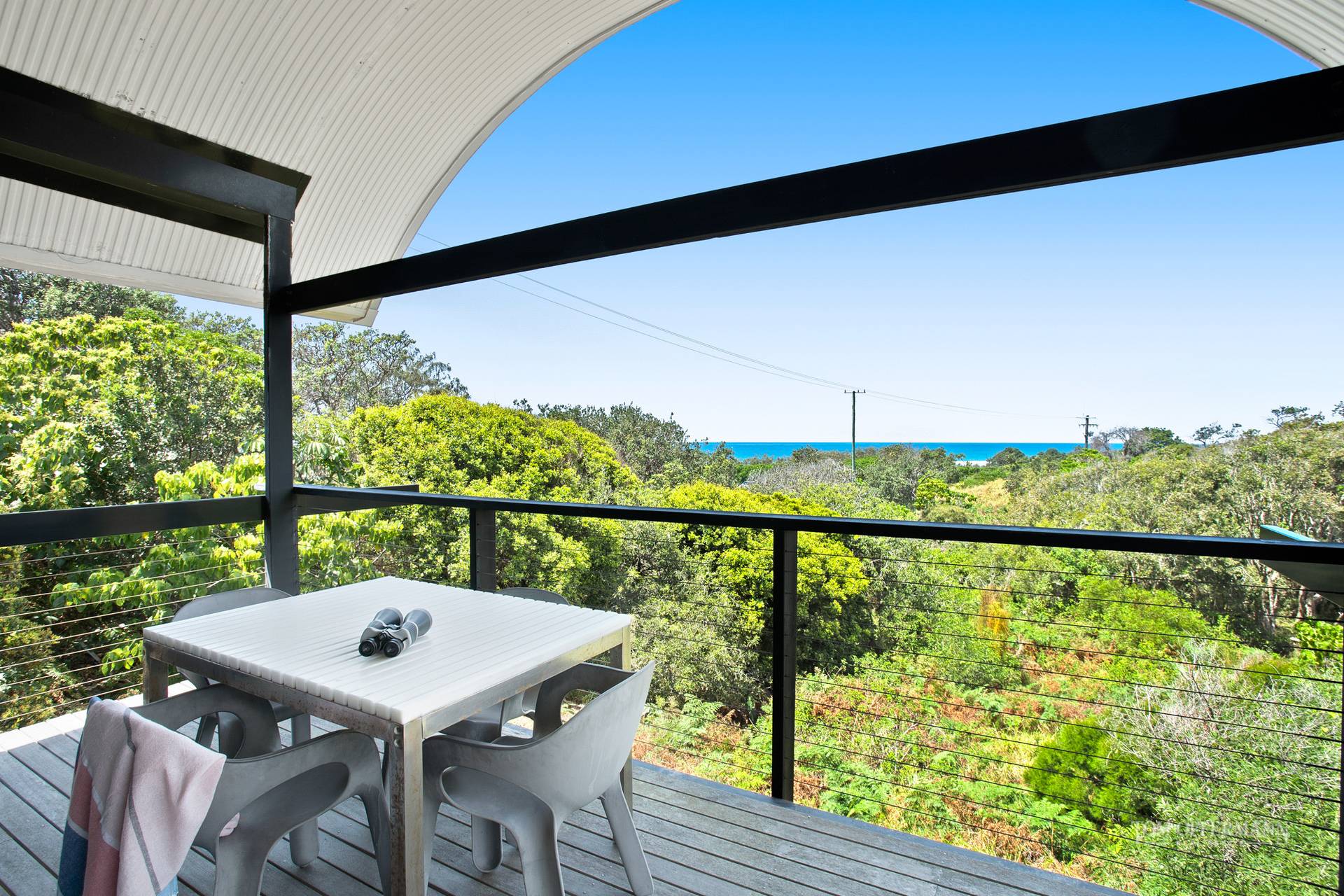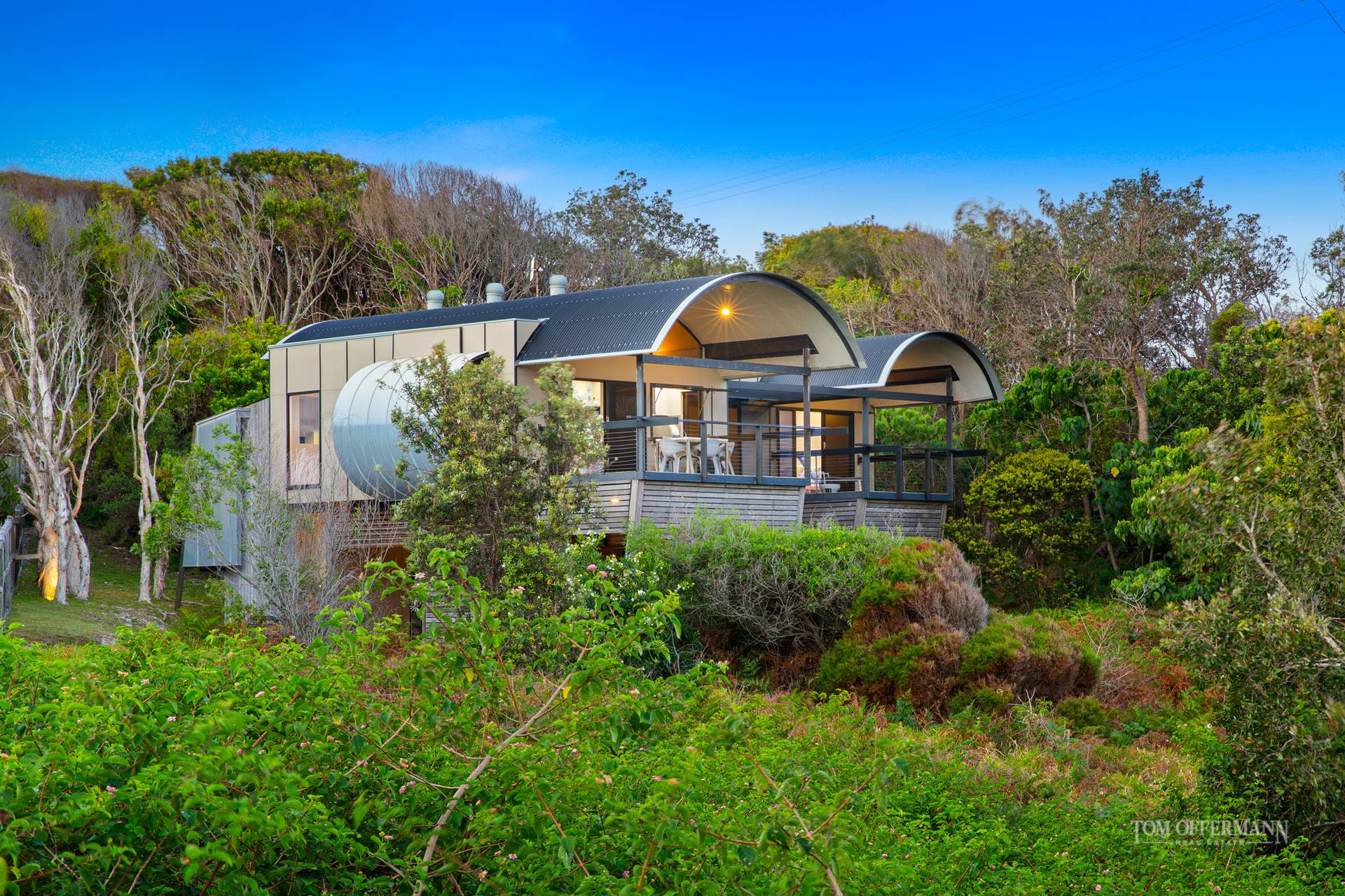 Approached by a long private driveway and with a nearby path to the beach in sight, the topography and position in the cup of the valley, delivers a half moon ocean view from either of the two eastern decks, main bedroom and living room. No need for a mower or leaf blower in this coastal habitat. This is a beach retreat of the highest order. Ironbark .2m square posts sit in steel stirrups and concrete footings anchor a beachcomber's haven seemingly floating in the landscape.