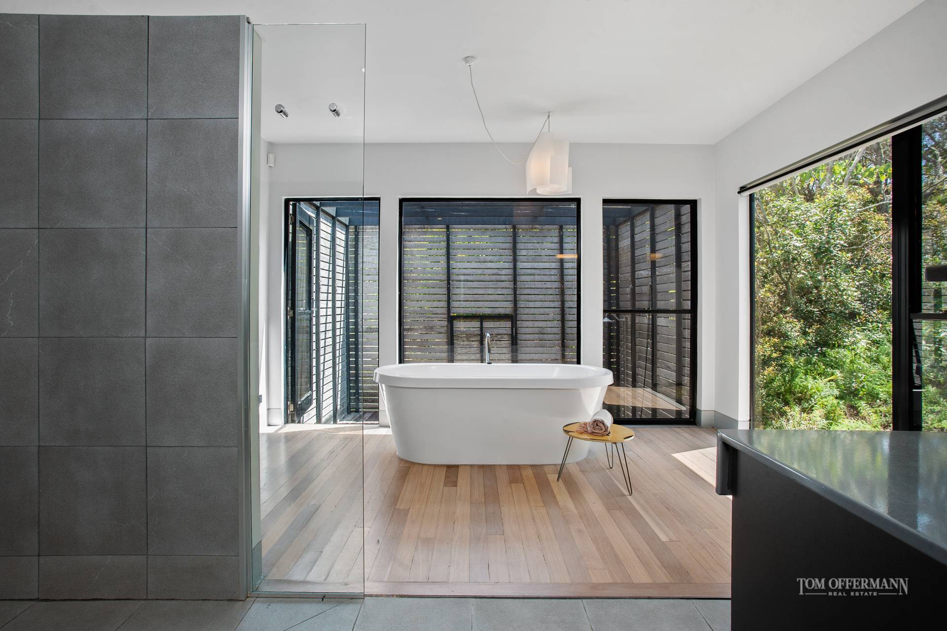 An enclosed stairwell has twin door access and a wall of angled glass draws light to a timber stairwell. Everything is subdued yet structurally underlined by integrated furnishing, timber ventilation panels, sash windows, fixed glass lining curved roofs skillfully framing the native vegetation of the fence free land. A large timber slatted open air shower steps to a picture window bathing room replete with stand-alone bath fit for a king or queen and a large waterfall shower head behind frameless glass.