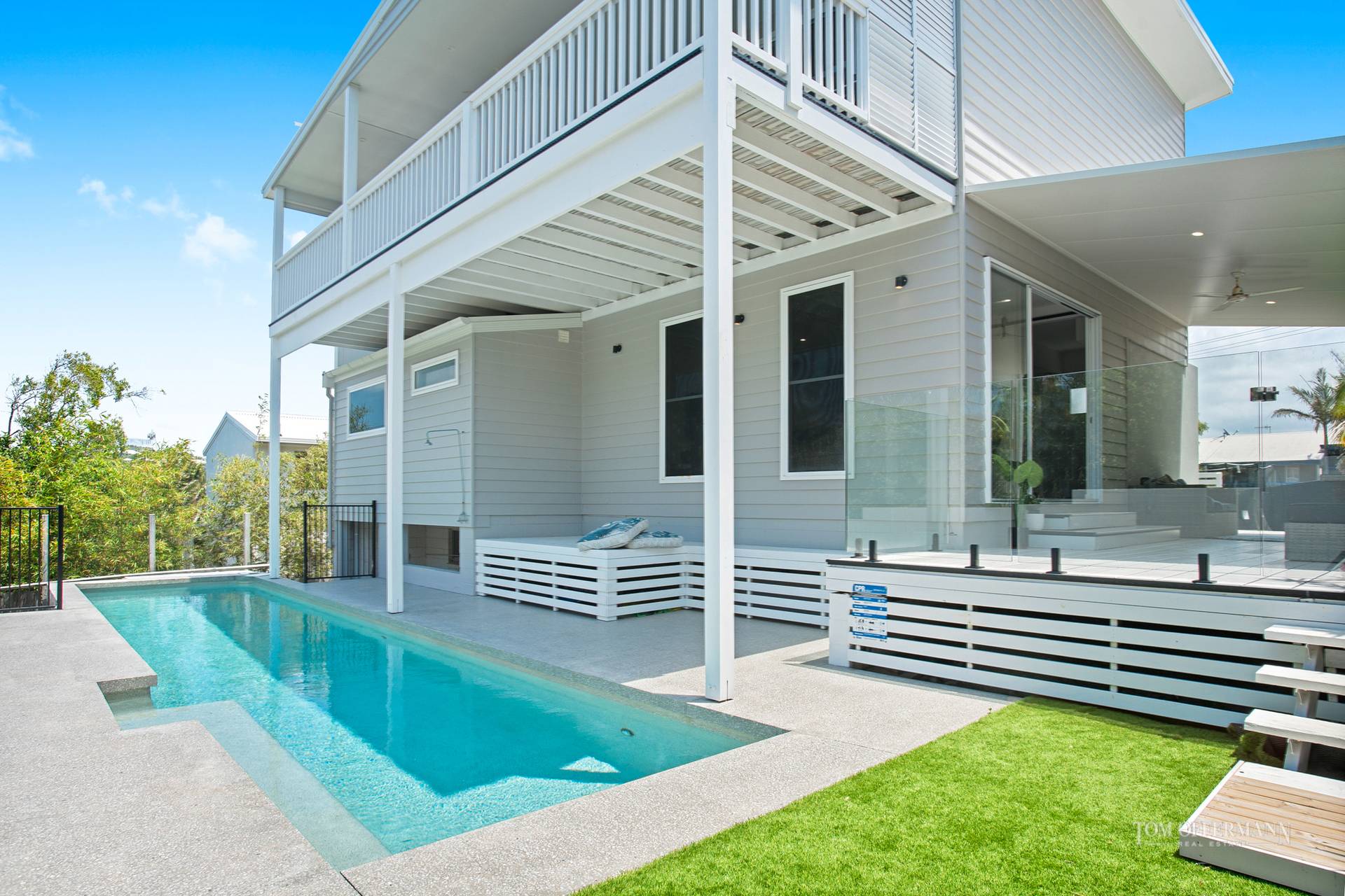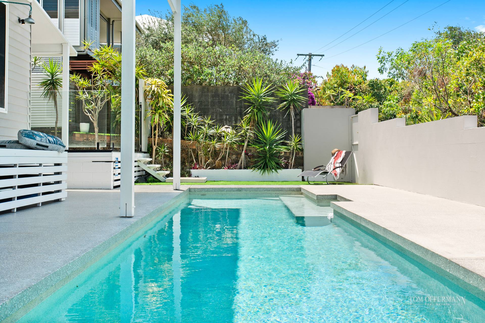 These bedrooms all flow easily onto a relaxed internal living space that leads directly out onto the downstairs deck. Just a few steps is easy access to the sparkling 12.5m lap pool. An afternoon of relaxing or snoozing is just so easy on the large built-in timber poolside daybeds. There's a hot/cold outdoor shower to wash the sand off after the beach and a back gate to the rear which provides easy access to the beach for bus stop.