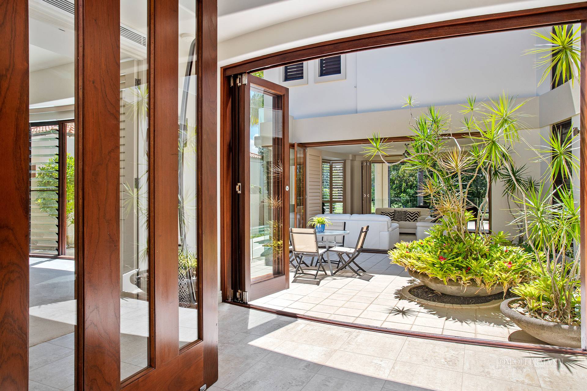 On entering through the wider than wide timber and glass custom made front door, Paul Clout's clever design will instantly impress. Soaring ceilings and multiple Bi-fold doors allow for an airy and seamless flow to the central courtyard and north facing terrace which overlooks a picturesque long water view. A wrap-around-pool with an infinity edge is viewed from most areas of the house.