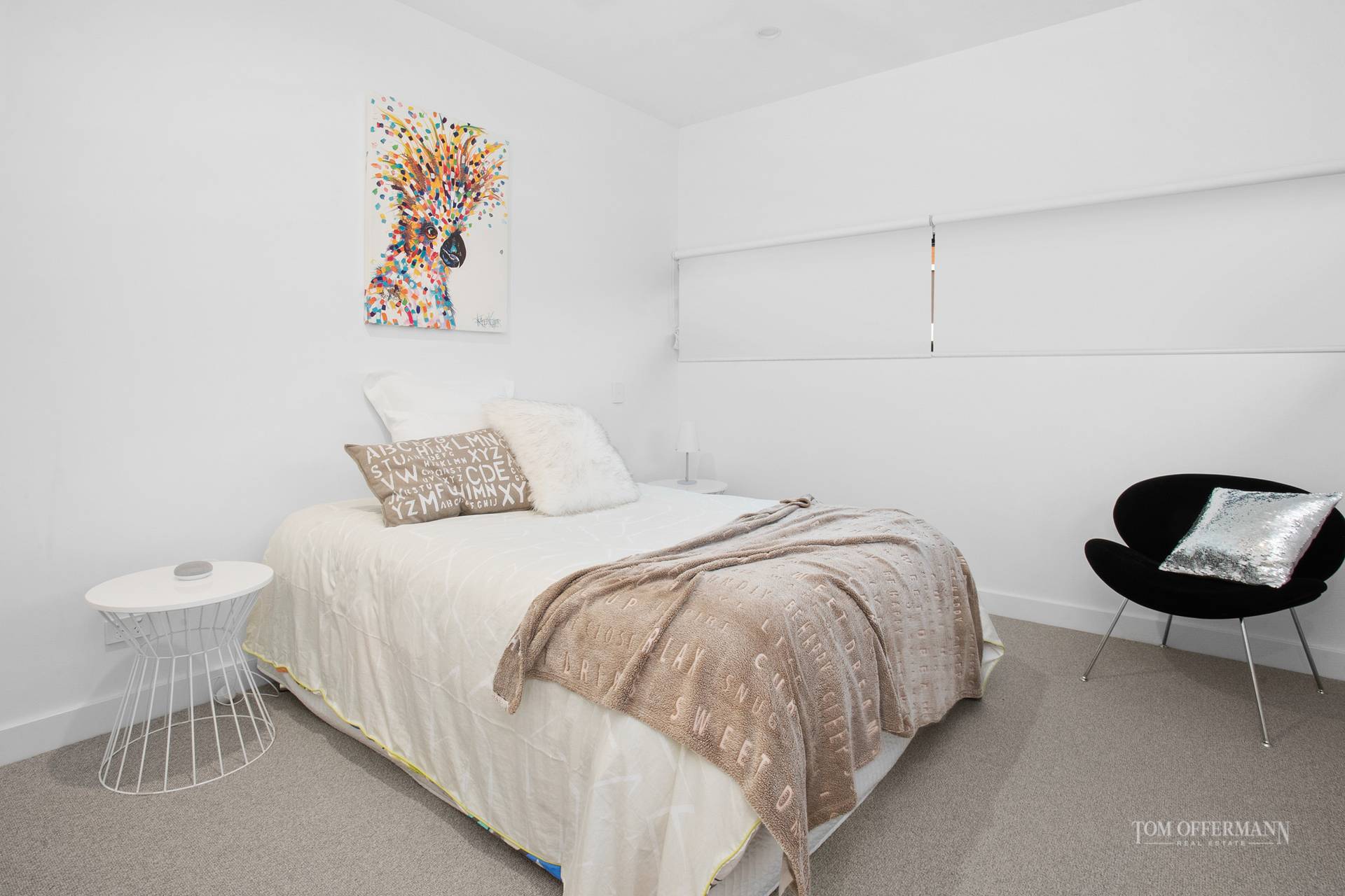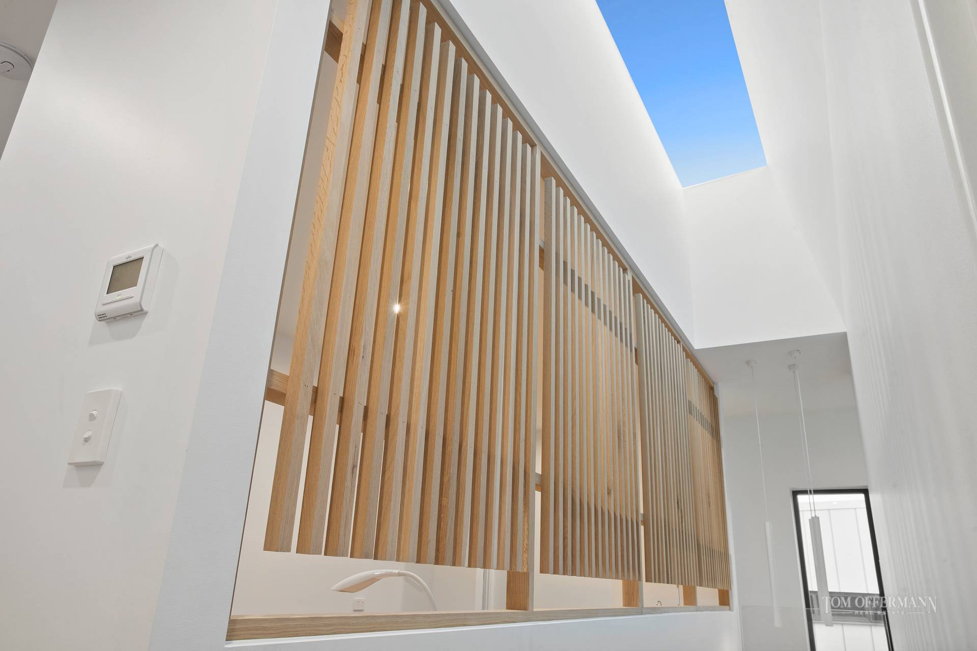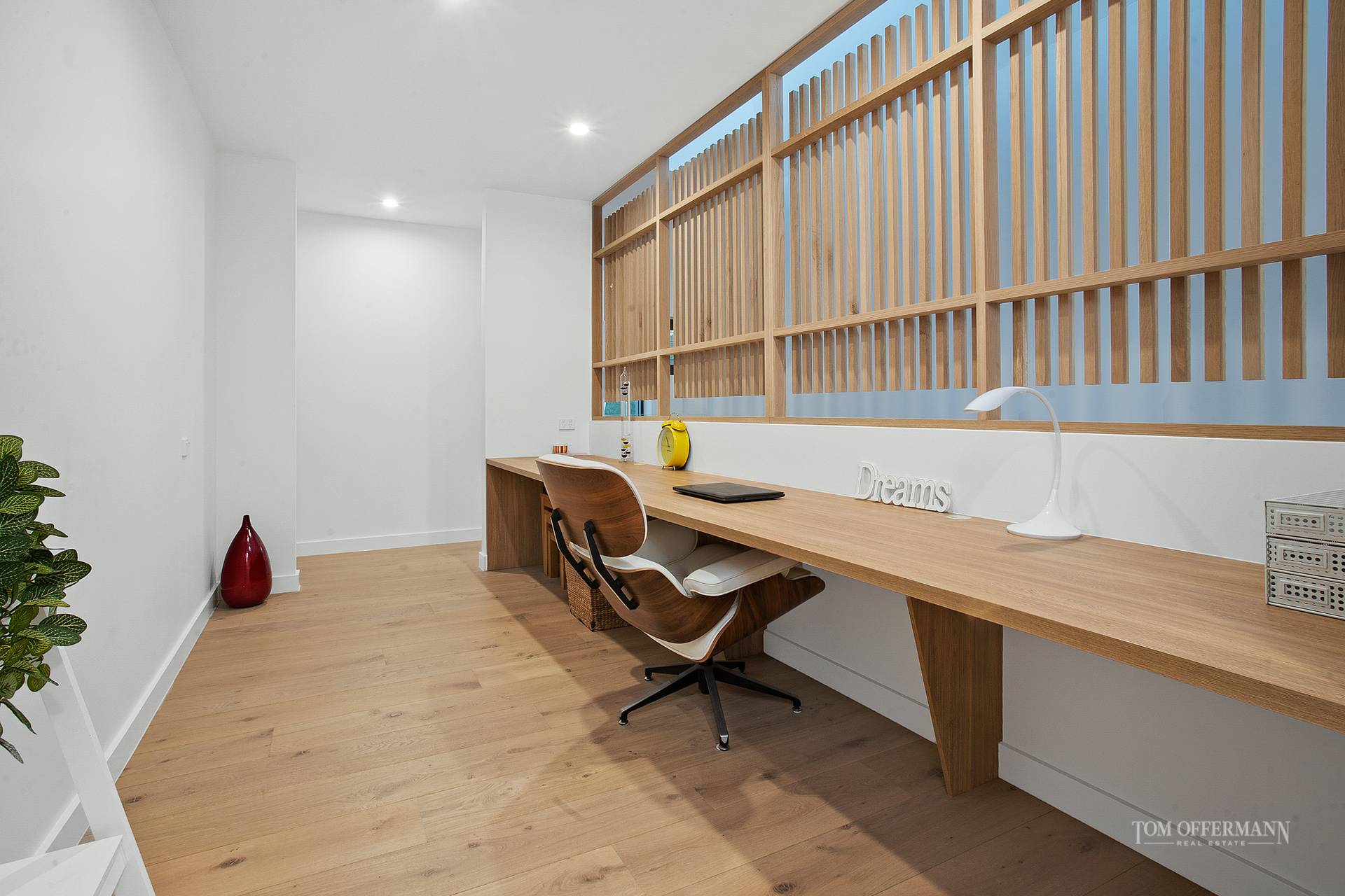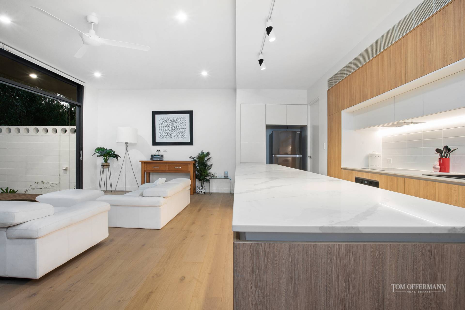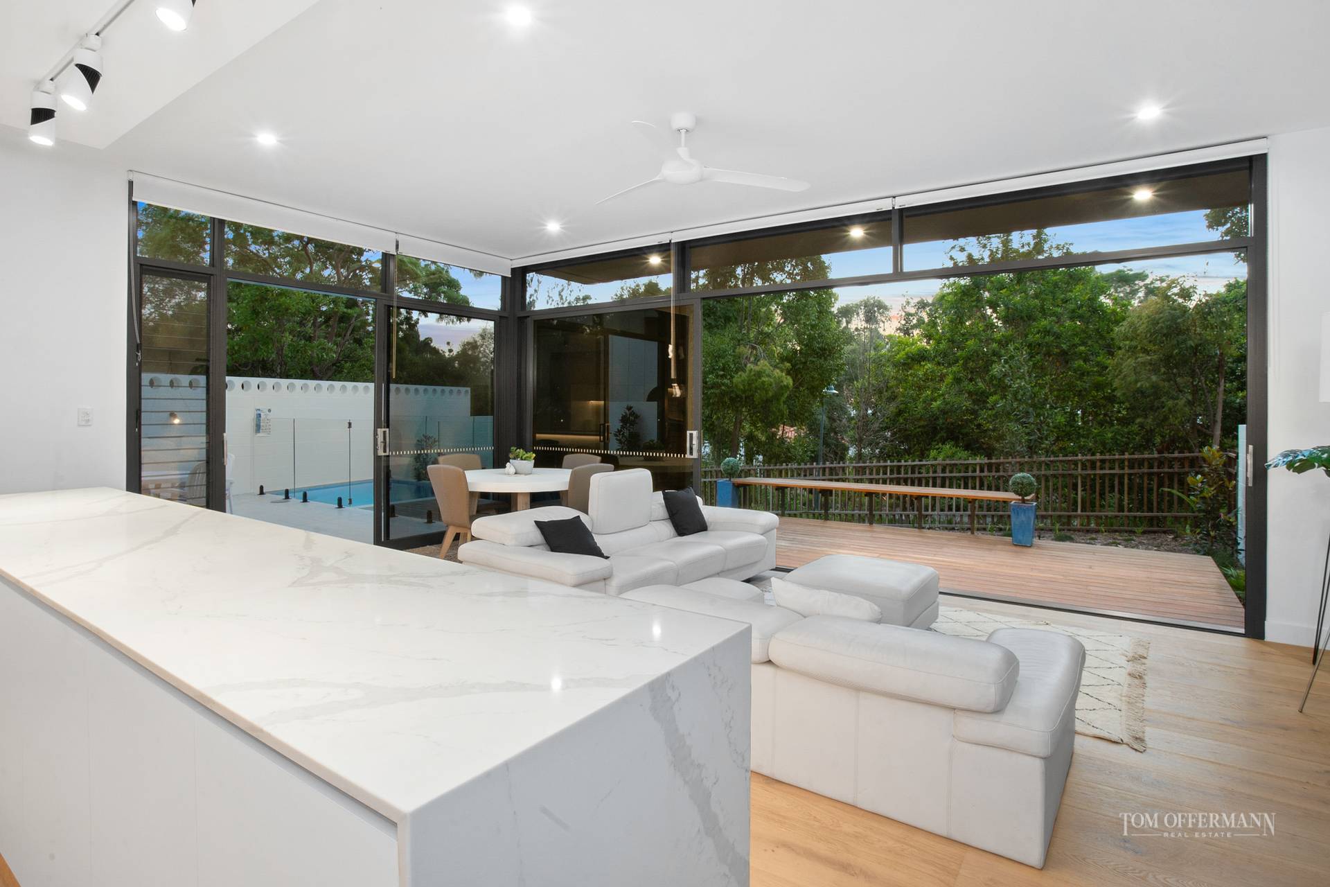 There's a seamless transition from the open plan living and dining spaces. The kitchen has all the bells and whistles including a lengthy island bench, timber and 2-pac finishes, feature LED strip lighting, tiled splashbacks and a very vogue quartz-composite Schock sink.