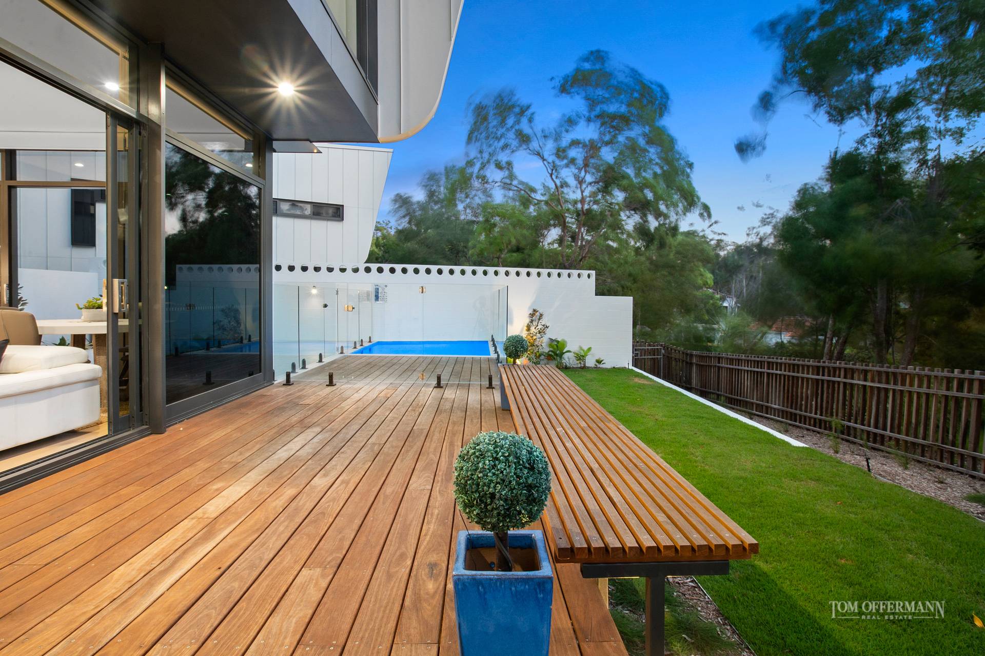 There's a tiled courtyard which partially abuts the pool; a merbau timber deck; part of the lawn area abuts the pool; and stretches the width of the rear boundary.