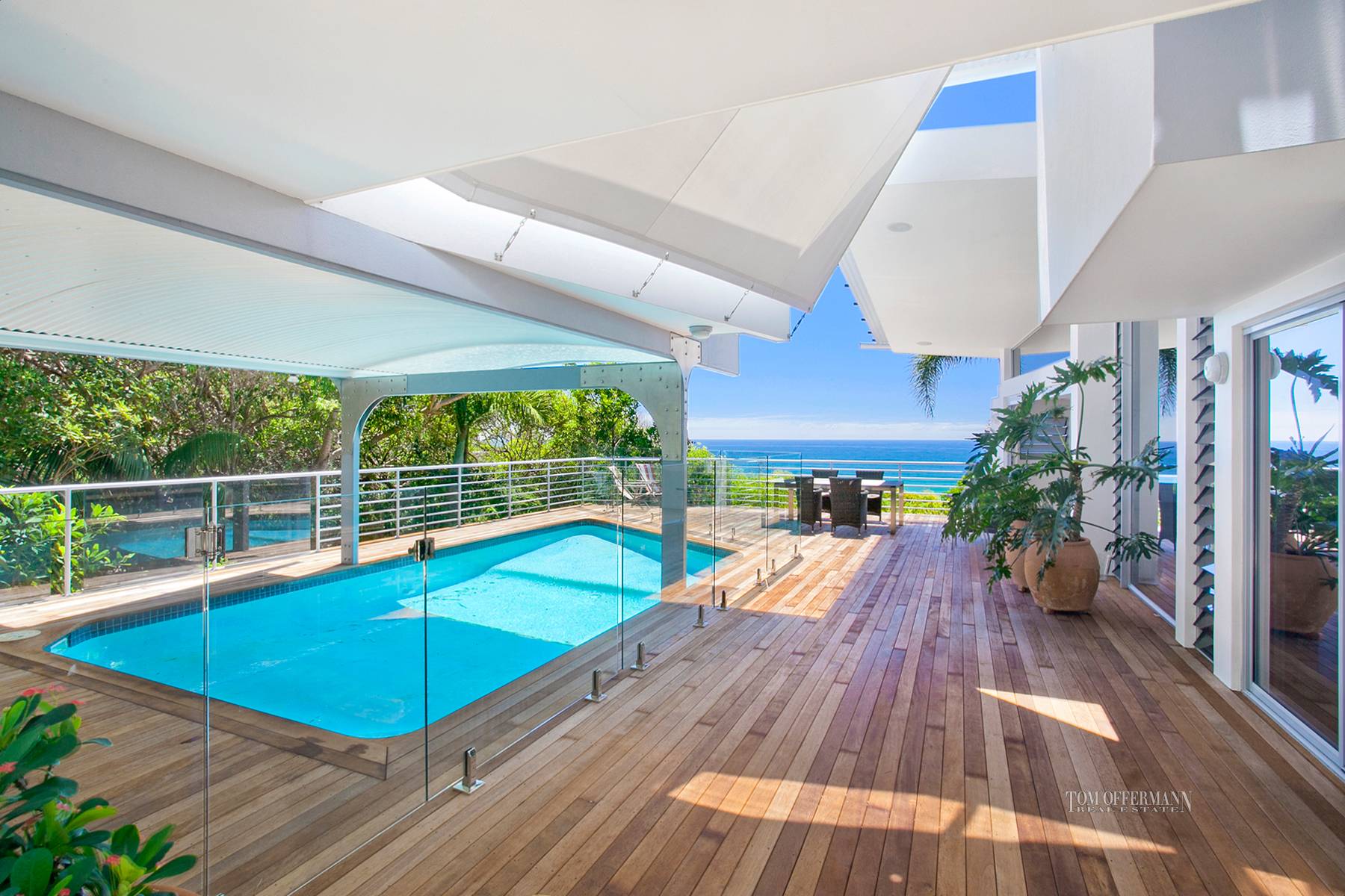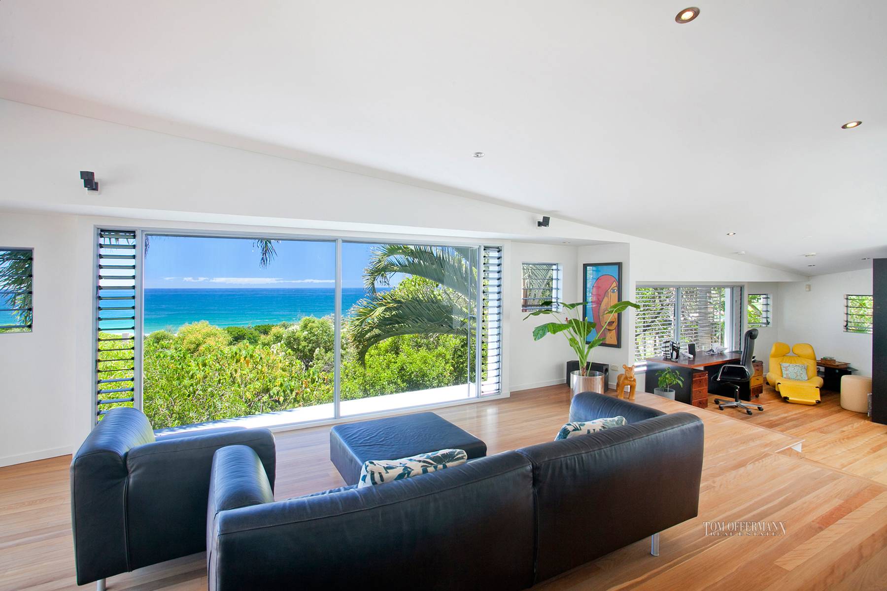 All and more are revealed at the front entrance. Angled roof lines, floor-to ceiling picture windows, playful geometric shapes, polished beachy Brushbox floors and a clerestory of louvred glass with weather sensors, all thoughtfully designed to enhance the generous volumes of space, protect the outdoor living spaces including the pool on the middle level, yet never detract from the magnificent sweeping Coral Sea views.