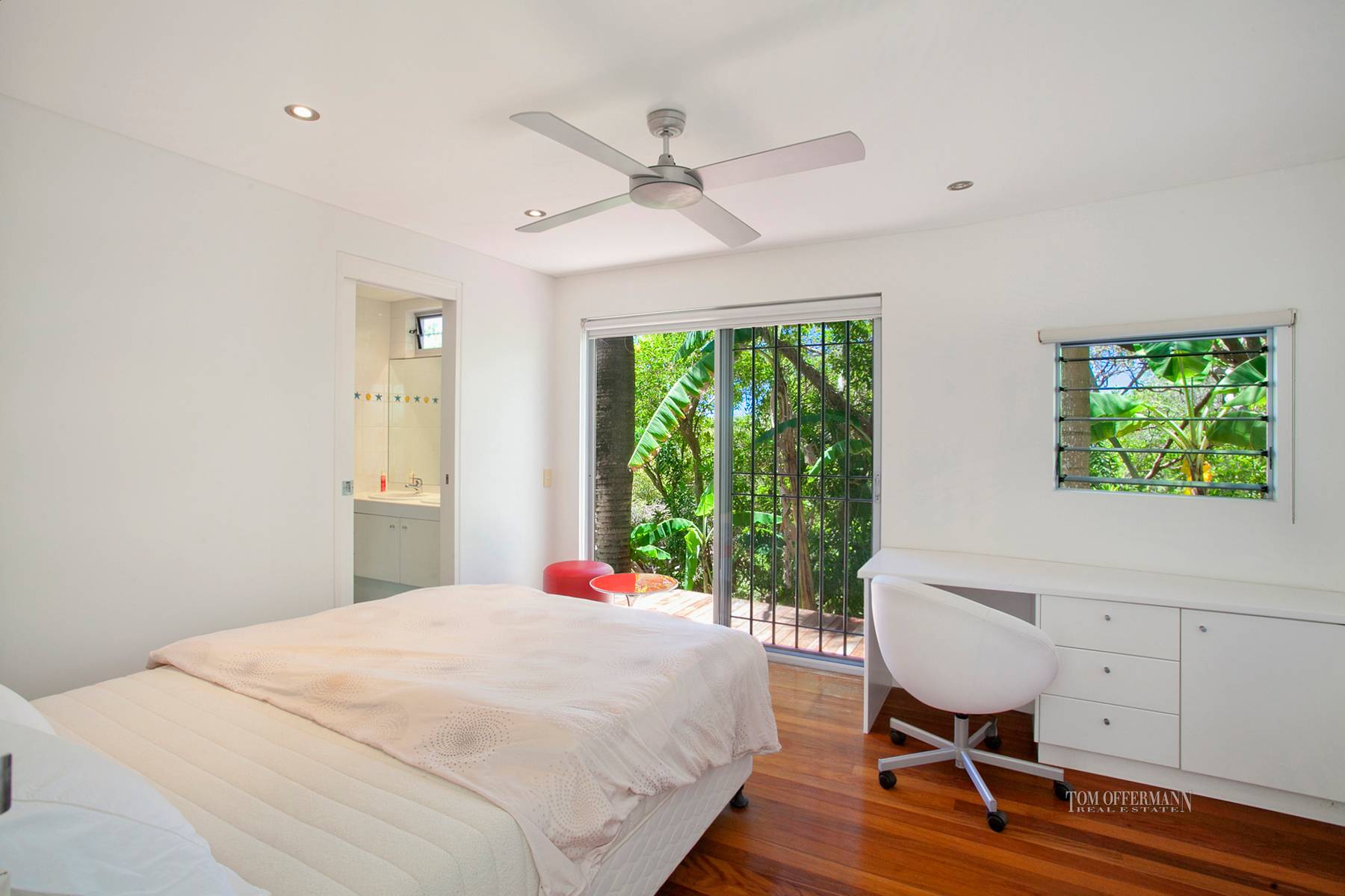 The upper level is a form and function design triumph. The master bedroom with huge walk-in robe and undercover balcony, is cantilevered over the pool so it provides much-needed shade on hot days. The bathroom features bespoke stainless steel semi-recessed basins. A guest master suite in the southern wing has a balcony.