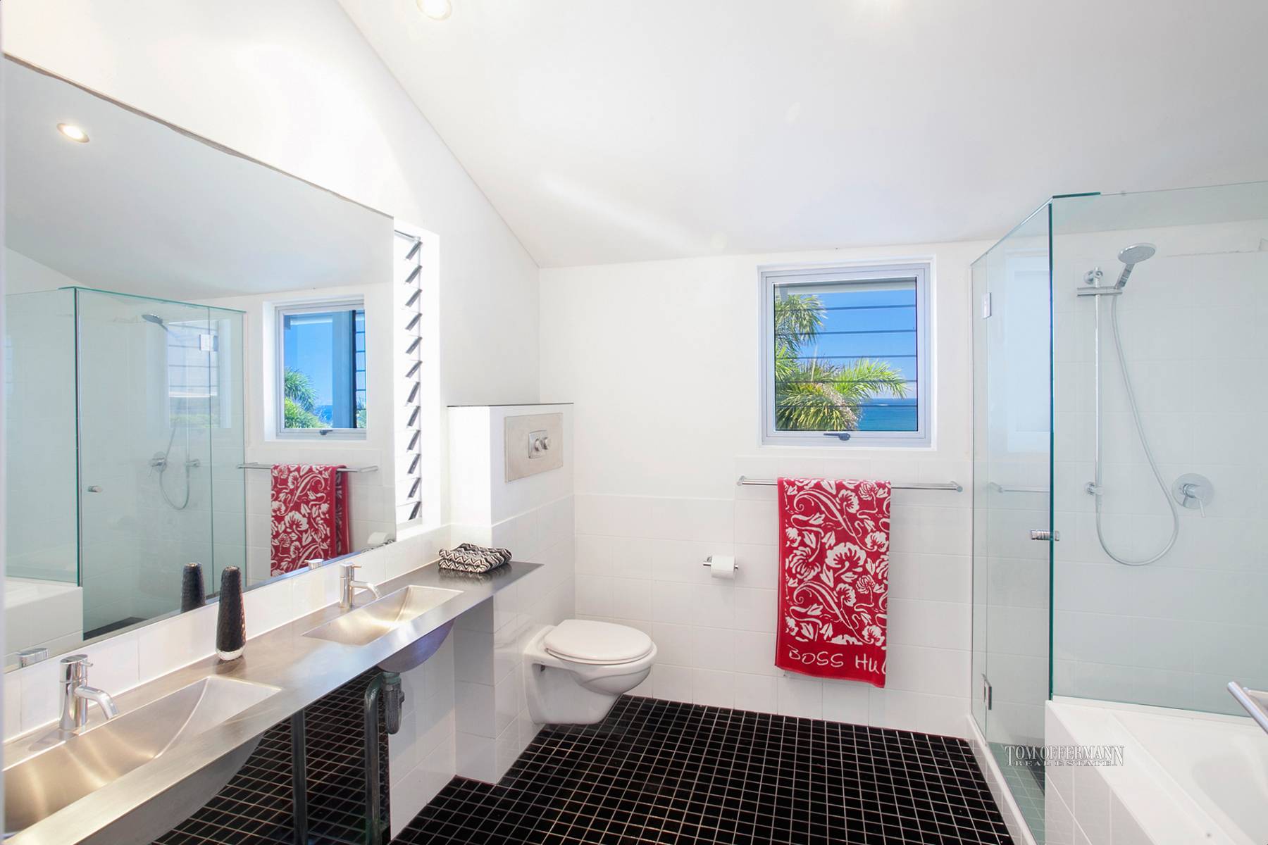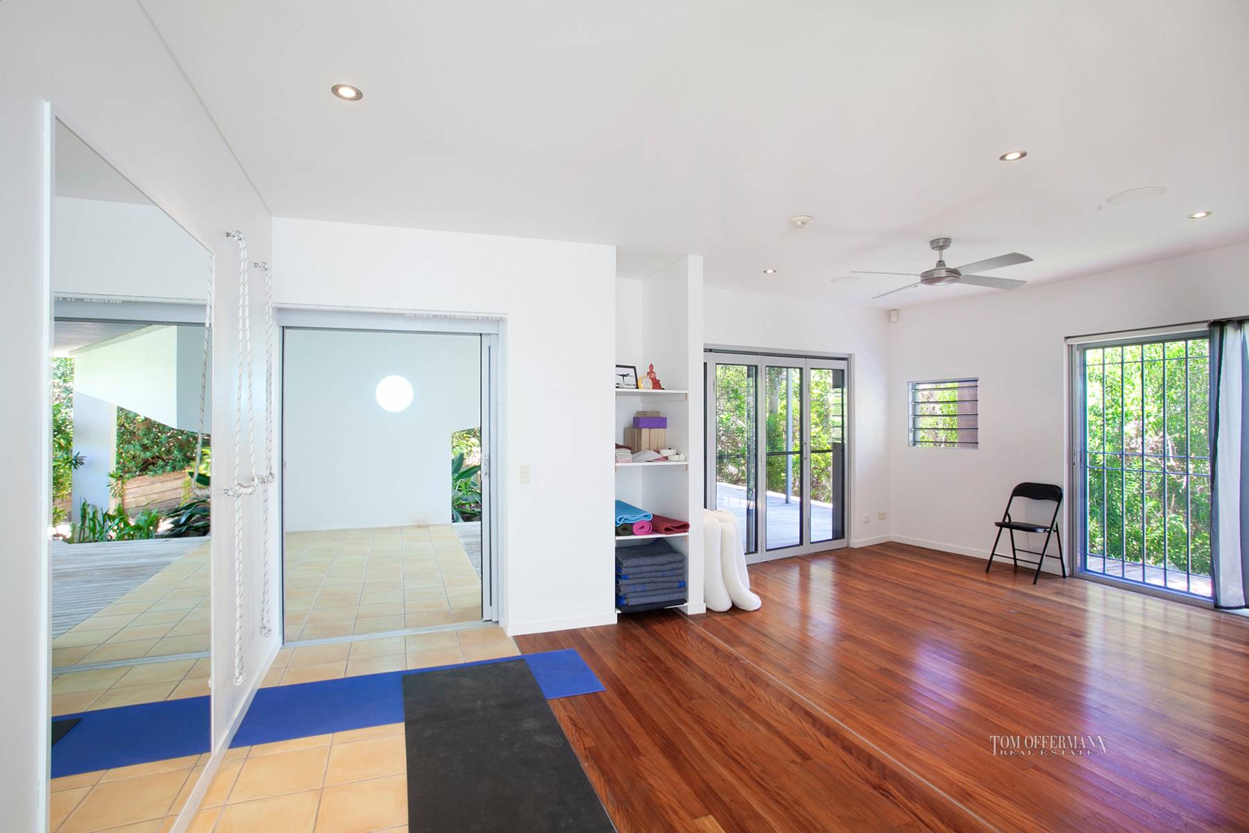 On the lower level ocean-side, are two bedrooms which share a family-size bathroom and deck plus a large family room, which opens out to a partially covered massive deck. It's the perfect 'Zen' spot for meditation, yoga or relaxing after a sauna. The timber boardwalk is the beach access track and it goes past the lawn tennis court.