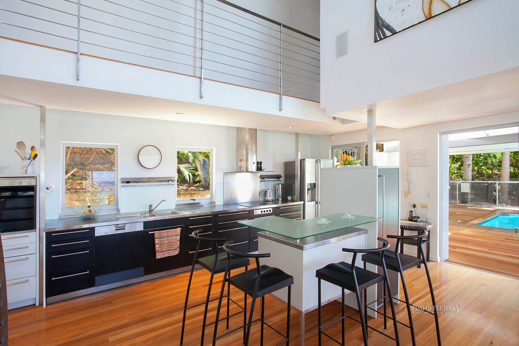 The living space, which has a low combustion fire place ,opens onto the sun and covered entertaining decks encasing the pool, and the Bulthaup kitchen, custom-made in Germany has stainless benchtops and timber drawers finished in black, by Zehentner Stummer.