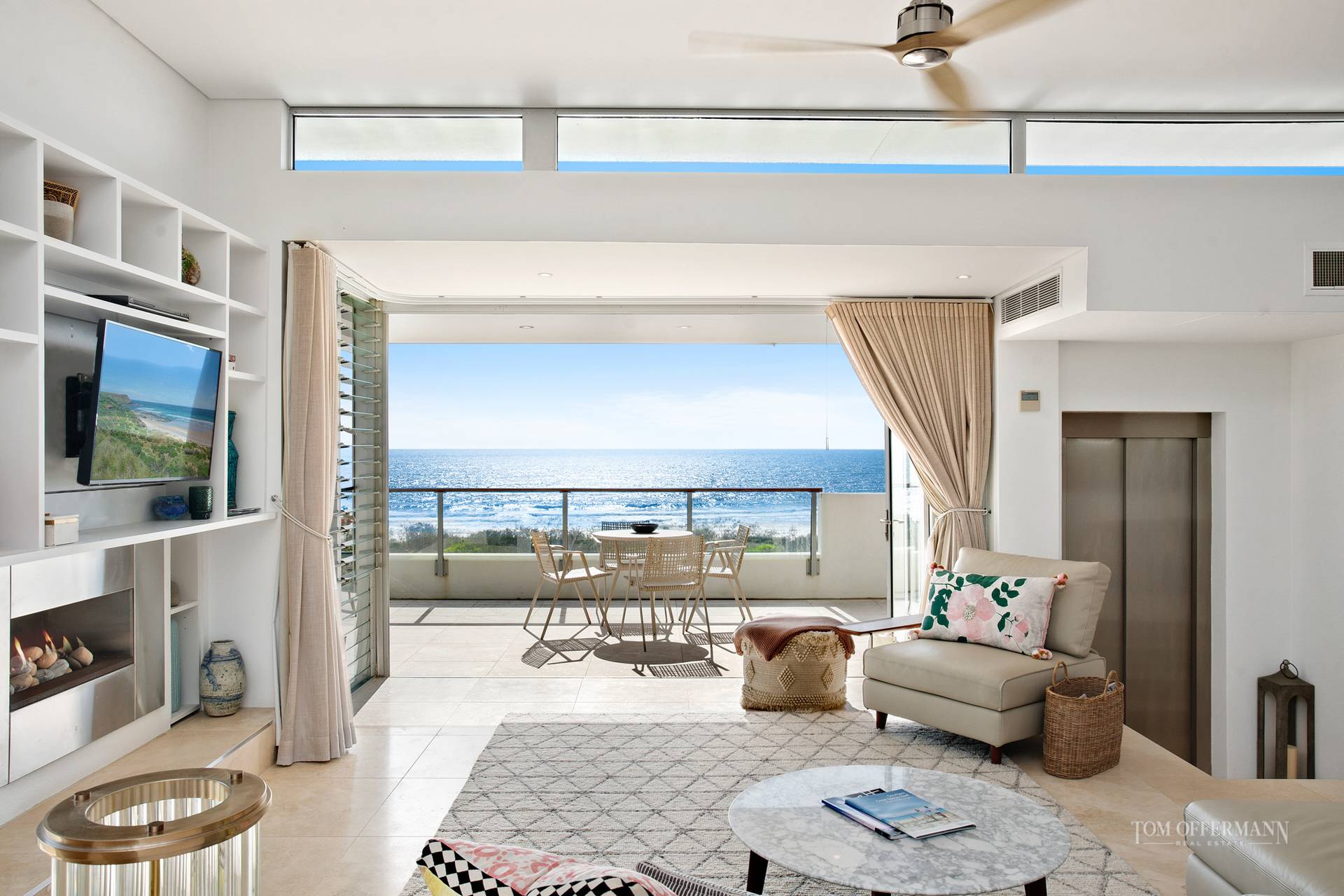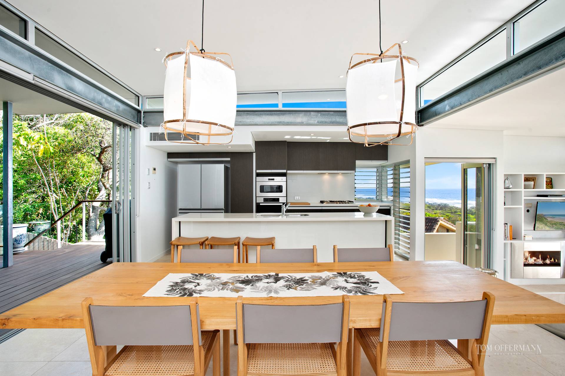 Contributing to the essence of contemporary beach-style living is a custom built feature wall which has an integrated fireplace for cool nights, designer pendants over the dining table, an on-trend kitchen with breakfast bar, Miele appliances, Corian benchtops plus every accoutrement for the consummate entertainer, who has to decide where amongst all the options is the best space to host guests.