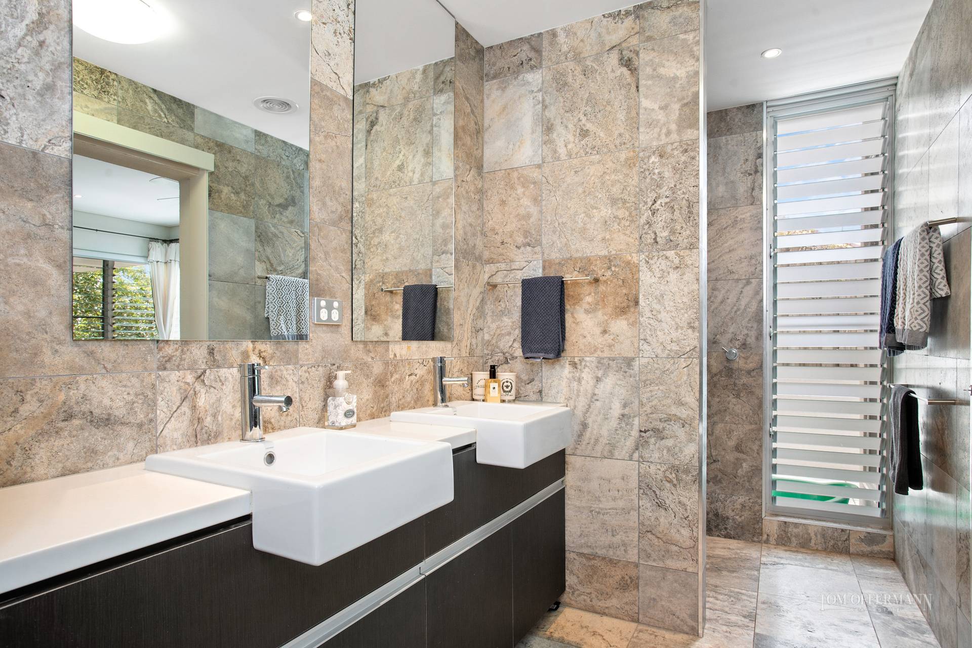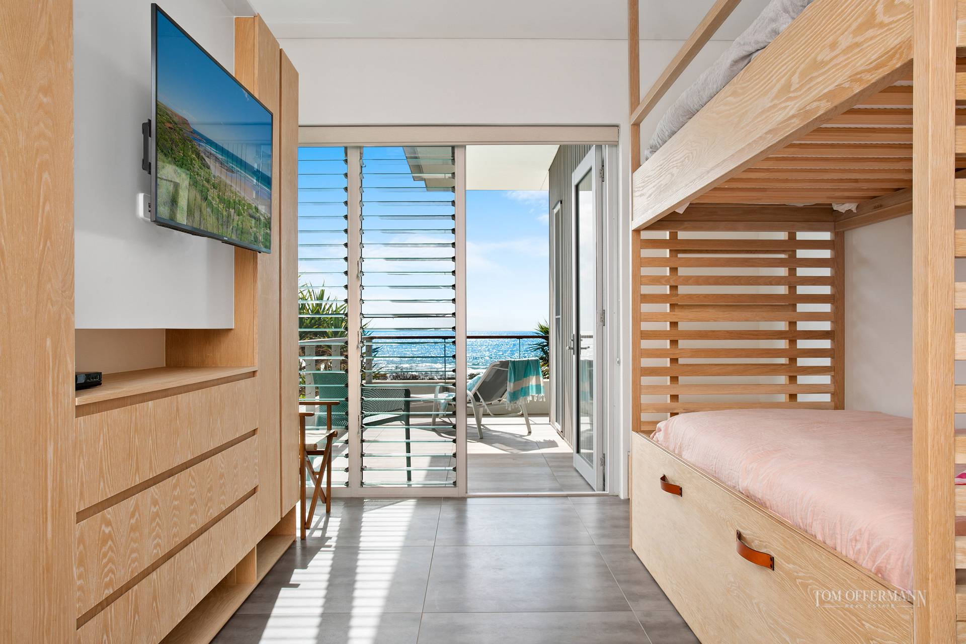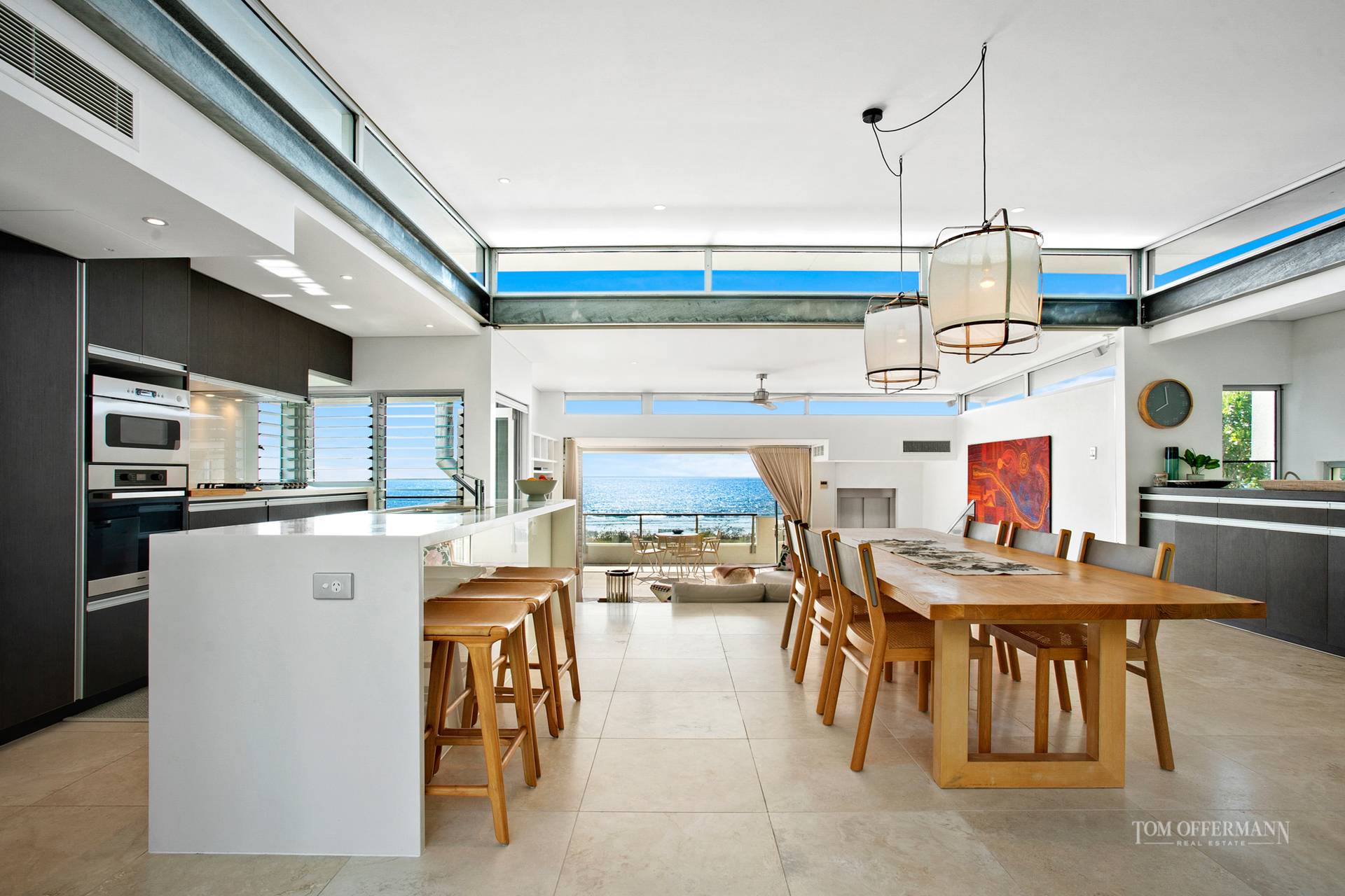 Downstairs is where dreams are made. All bedrooms have access to terraces and north-easterly ocean views. The master has an ensuite; a second is queen-size; the third is set up with custom-built cabinetry and bunks to sleep six; and both share a family-size bathroom.