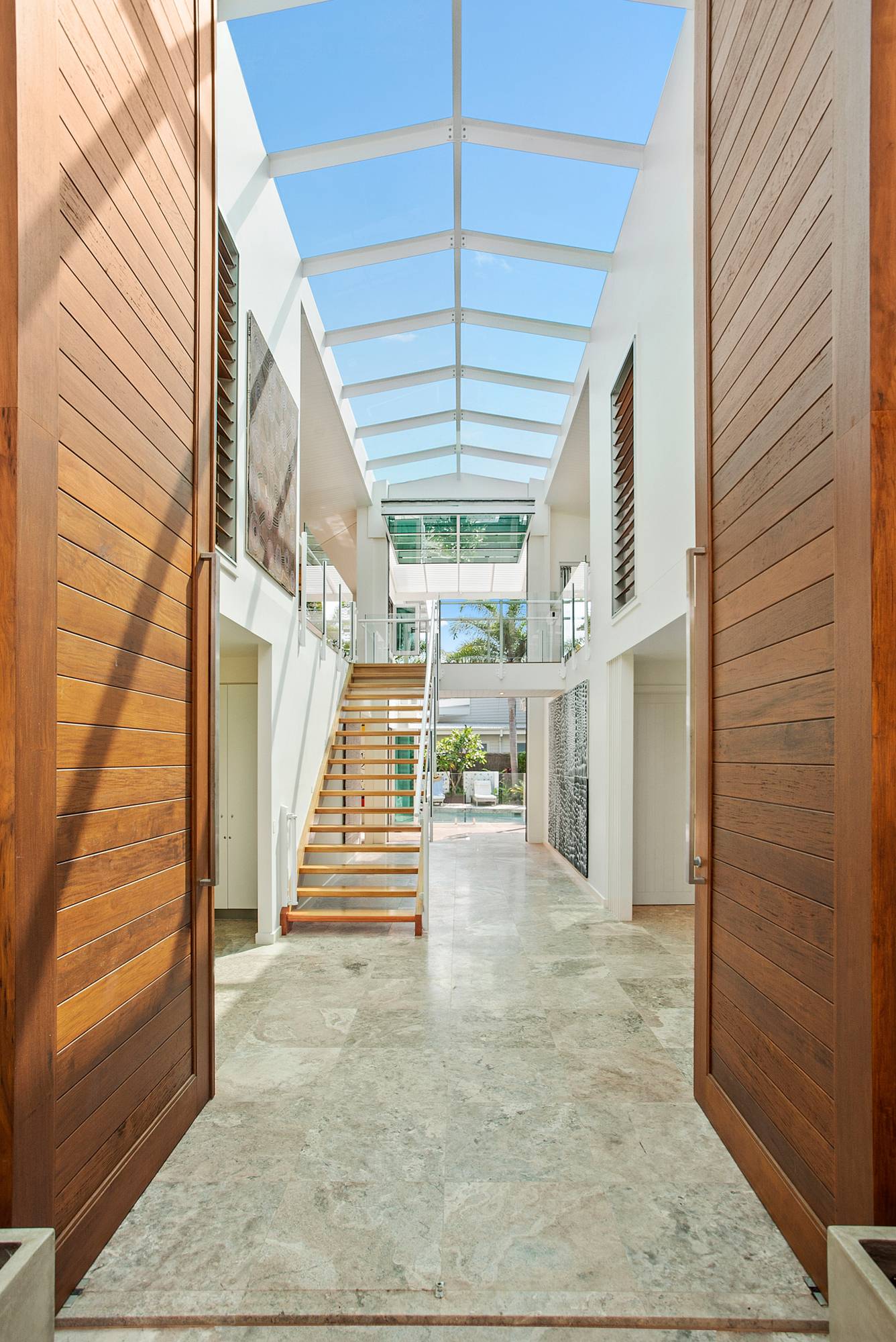 Massive cedar doors seemingly vanish to reveal a grand atrium with sensational artworks, a 7-metre high solar reflective glass panelled ceiling, vast travertine floors and an introspective eye to the pool and green backdrop in the distance.