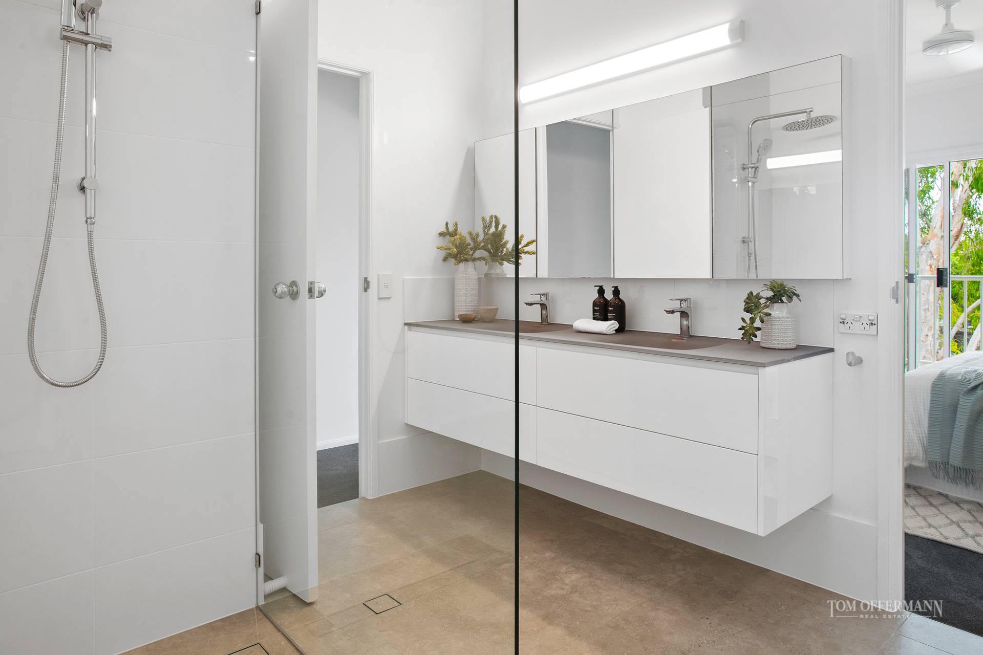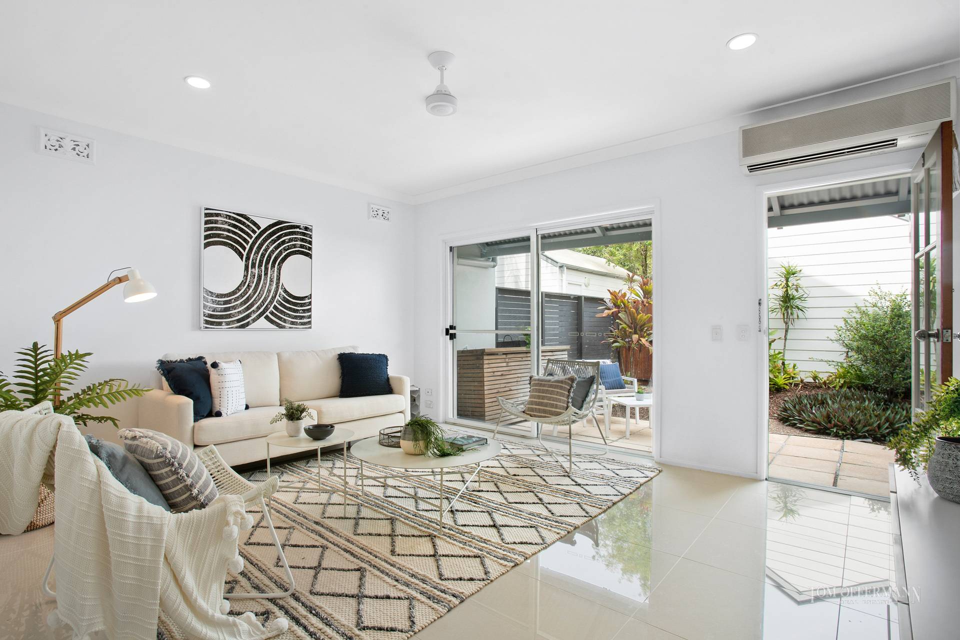 The seamless harmonious transition to the great outdoors begins at the front gate which opens into a courtyard. The front door reveal is a naturally bright interior with shiny white tiles. Directly on the right is a kid's zone perhaps a media room with sliding glass doors to the courtyard. Look ahead and drink in the wonderful vista including the backdrop of a wide waterway framed by handsome Paperbarks.