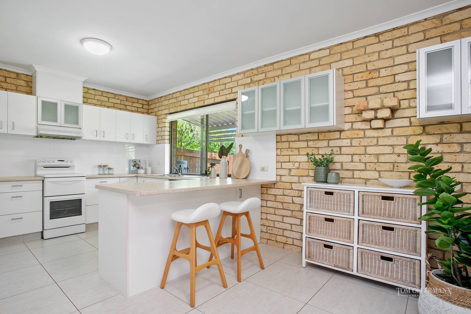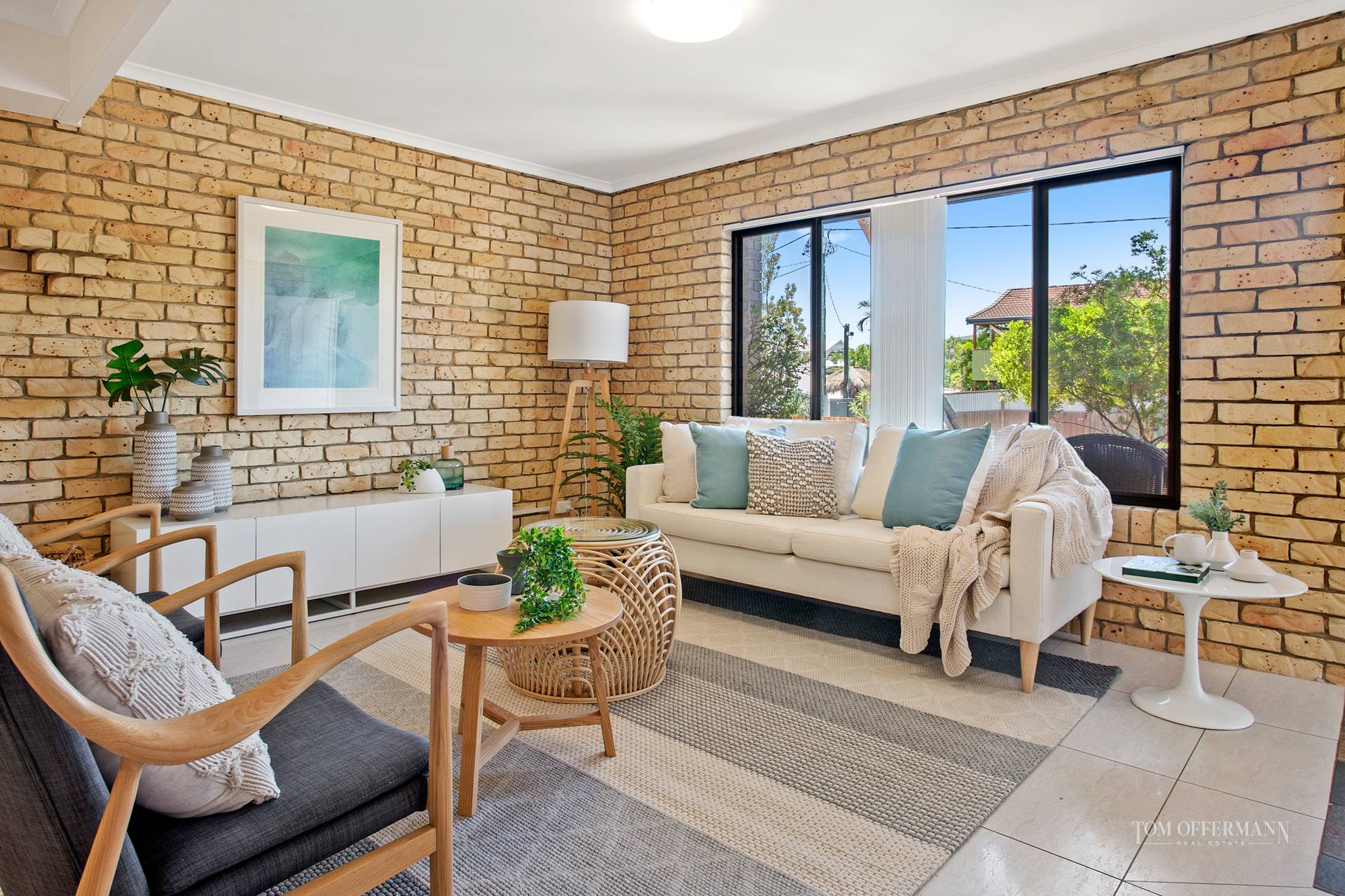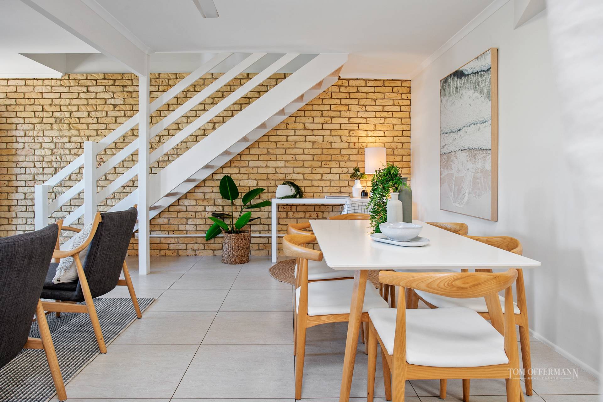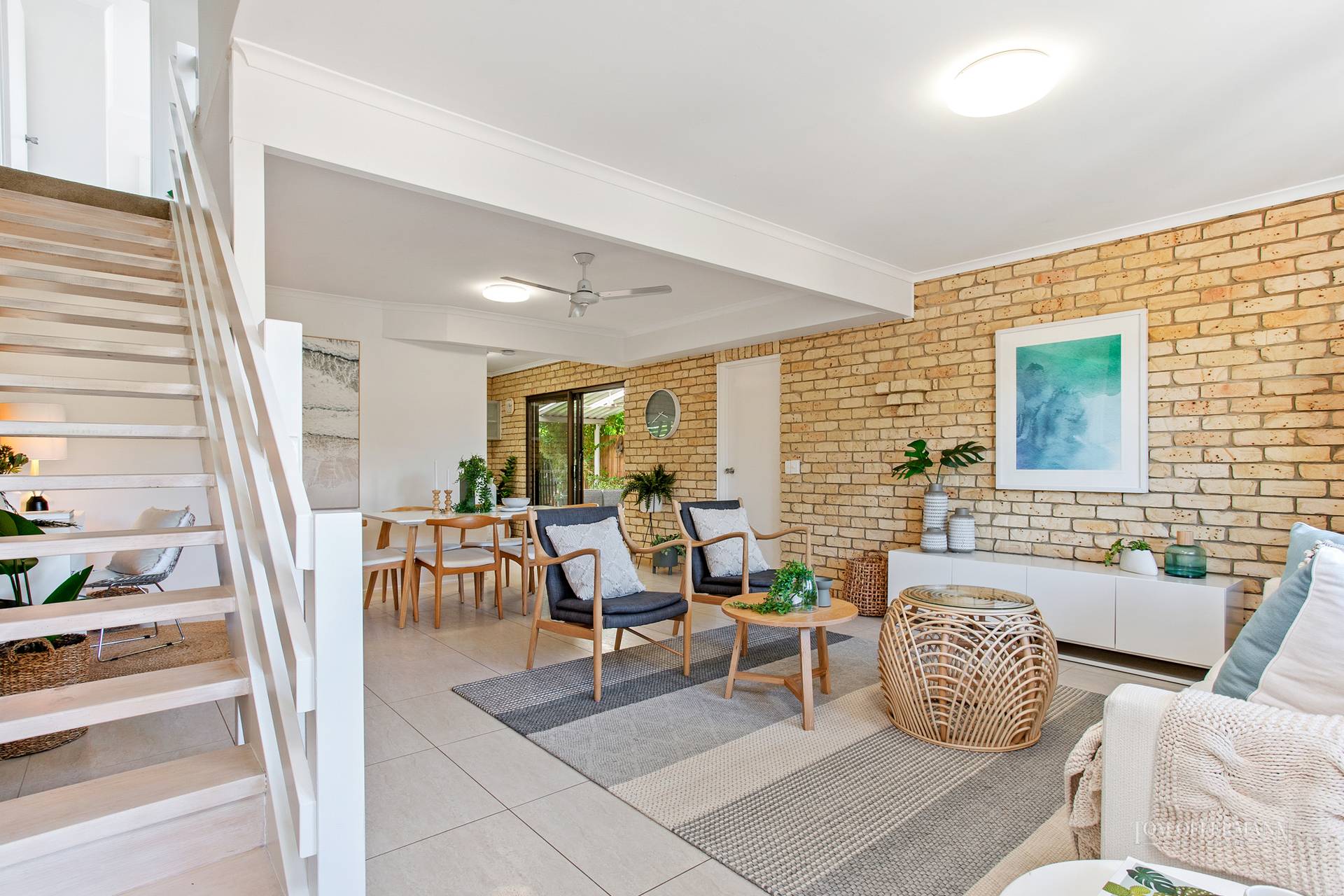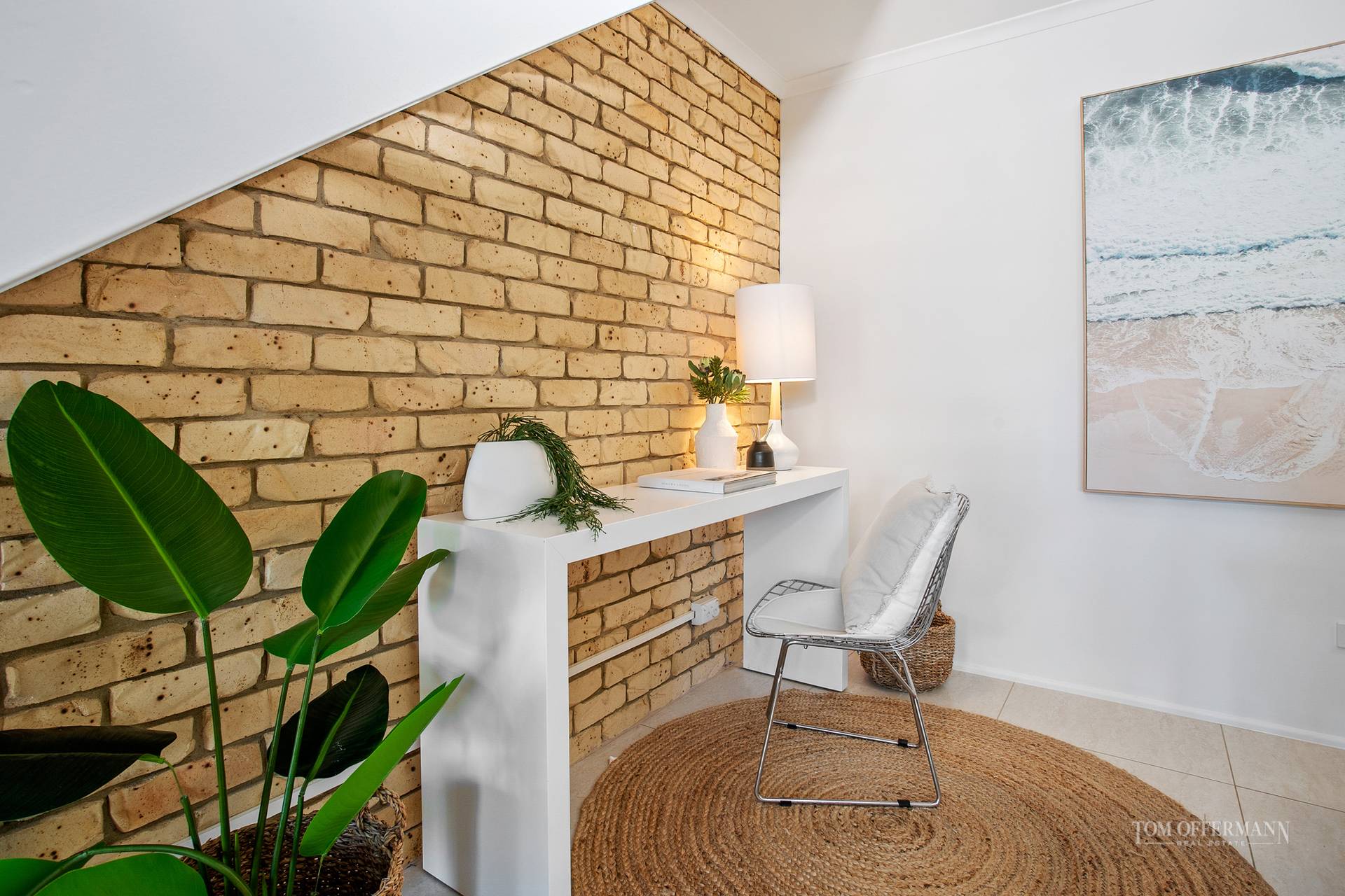The kitchen has been updated and is light and fresh. It's a good size with plenty of storage and was well designed and enjoys an outlook onto your own private courtyard garden. The main living space is spacious and open plan. The exposed brick keeps the property nice and cool and works well with coastal look interiors.
