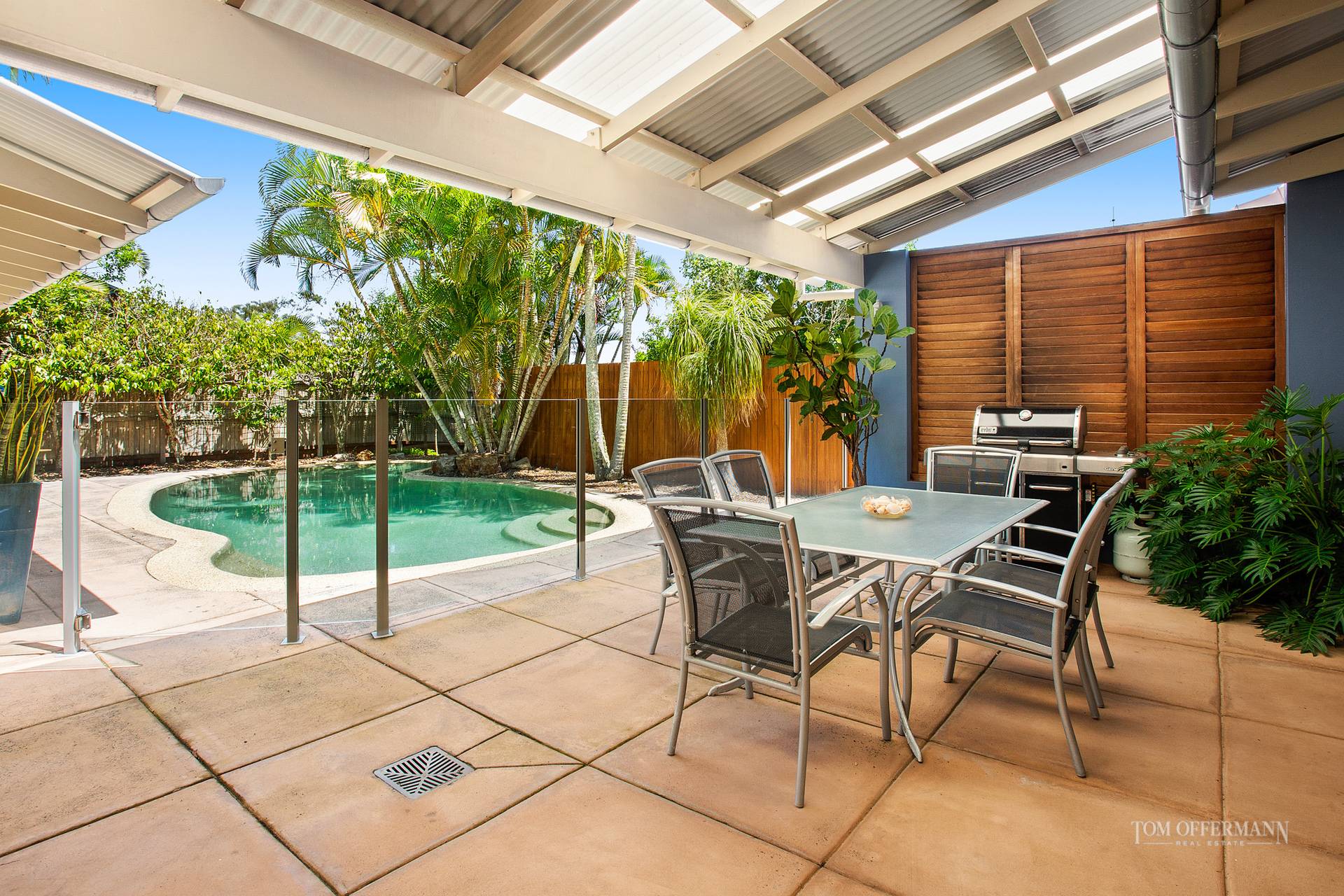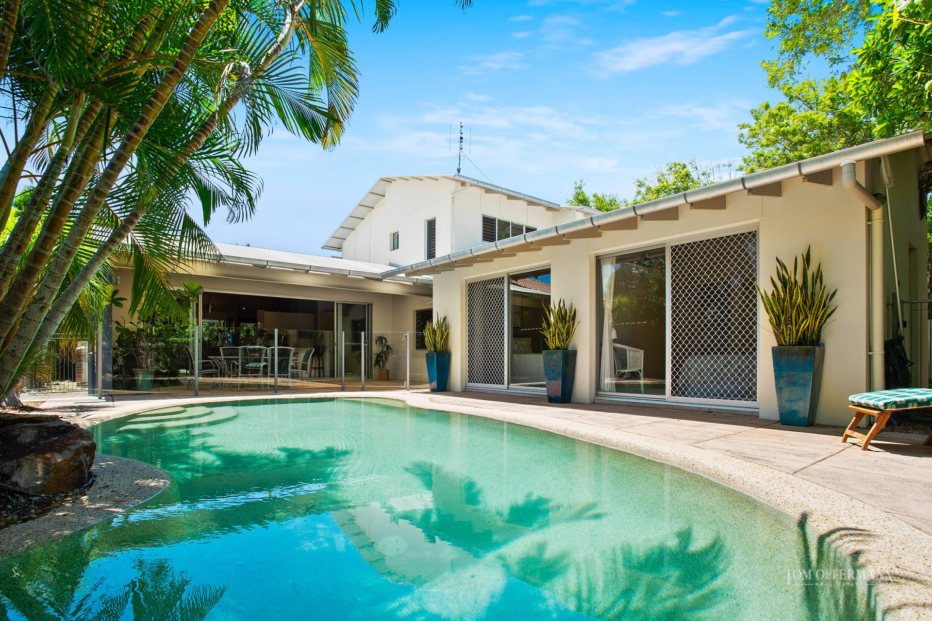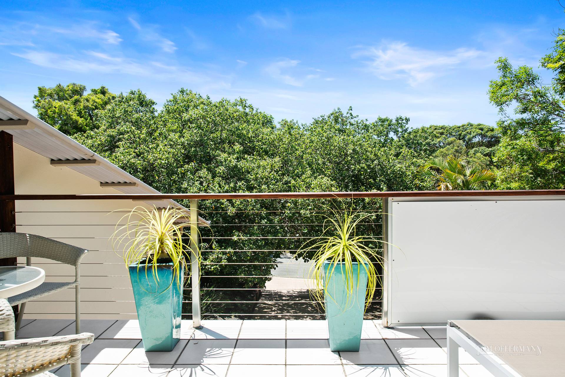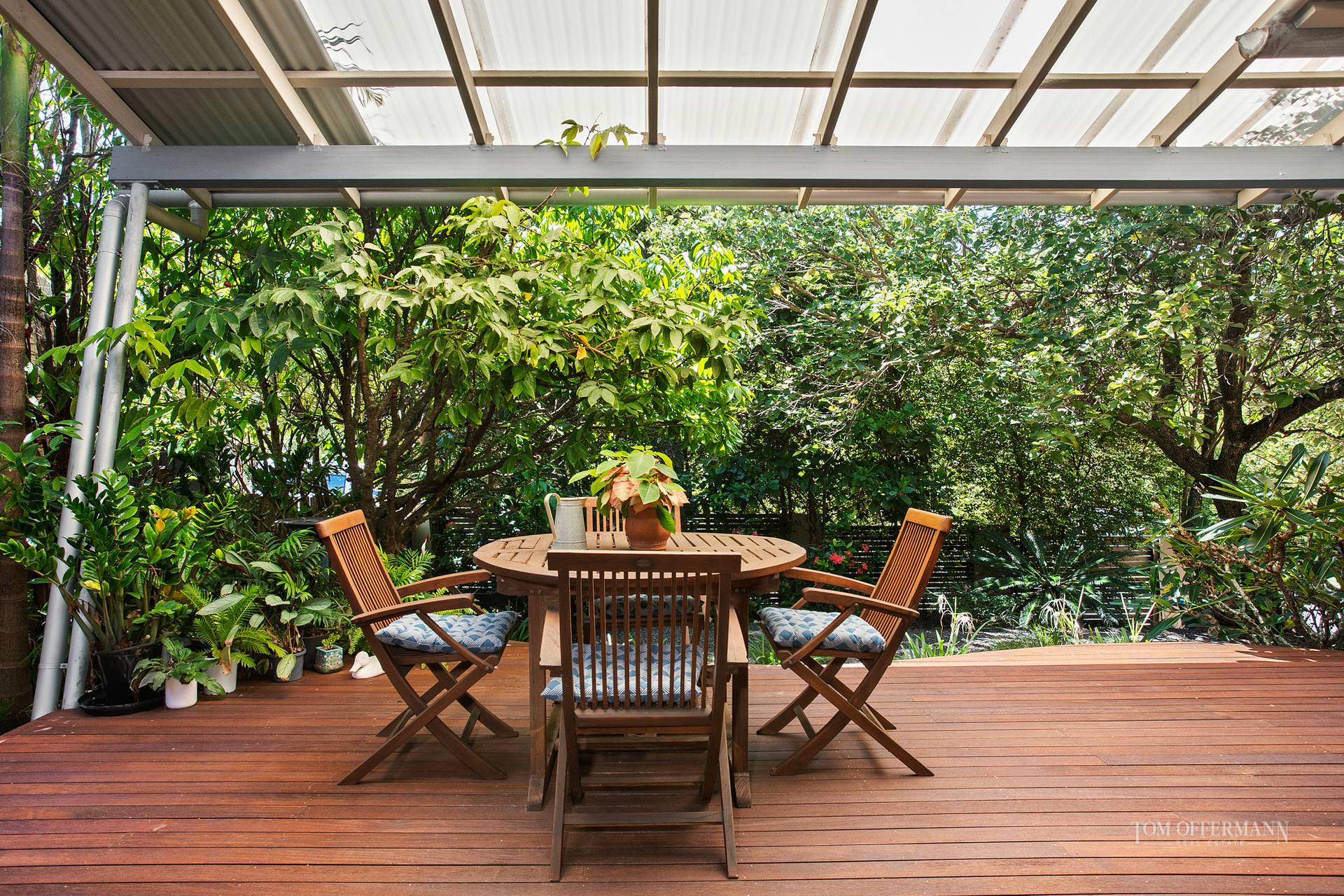 The beauty of the native landscape seemingly wraps around the home and continues in the front garden with its water feature, frangipanis and sub-tropical plants. It also fringes the wide north-facing, undercover timber deck.