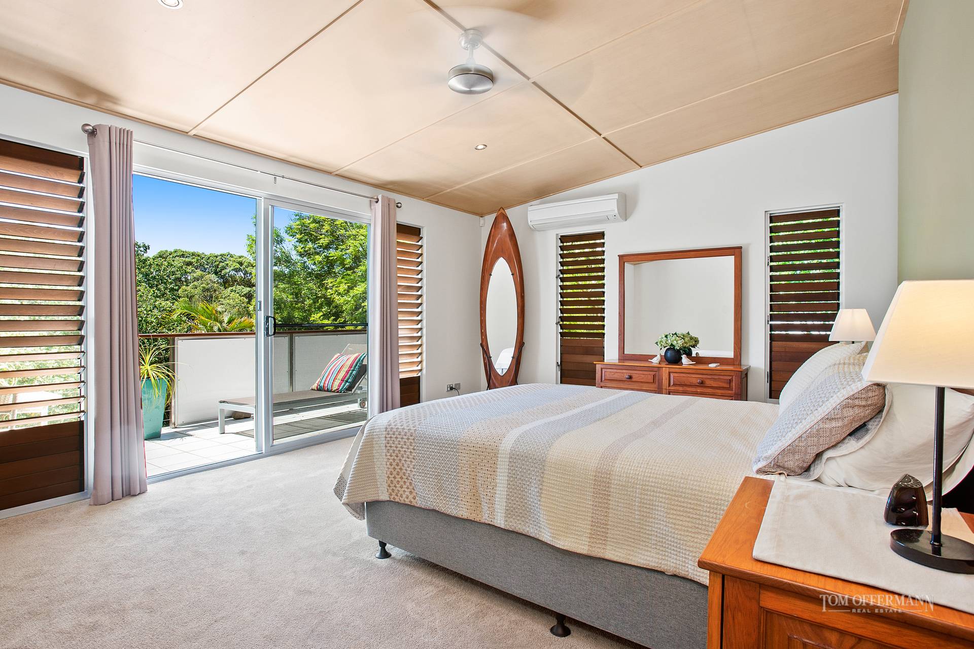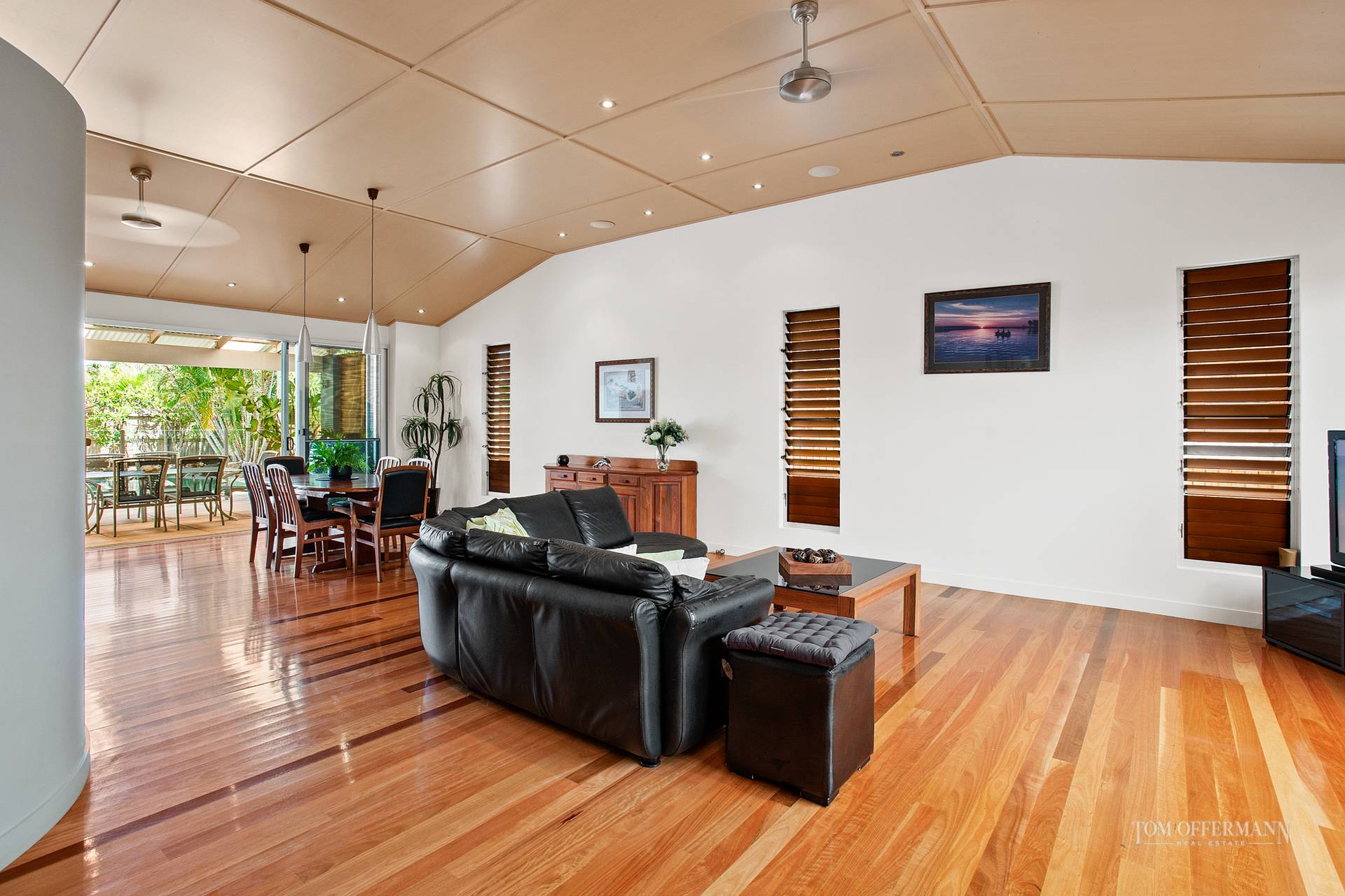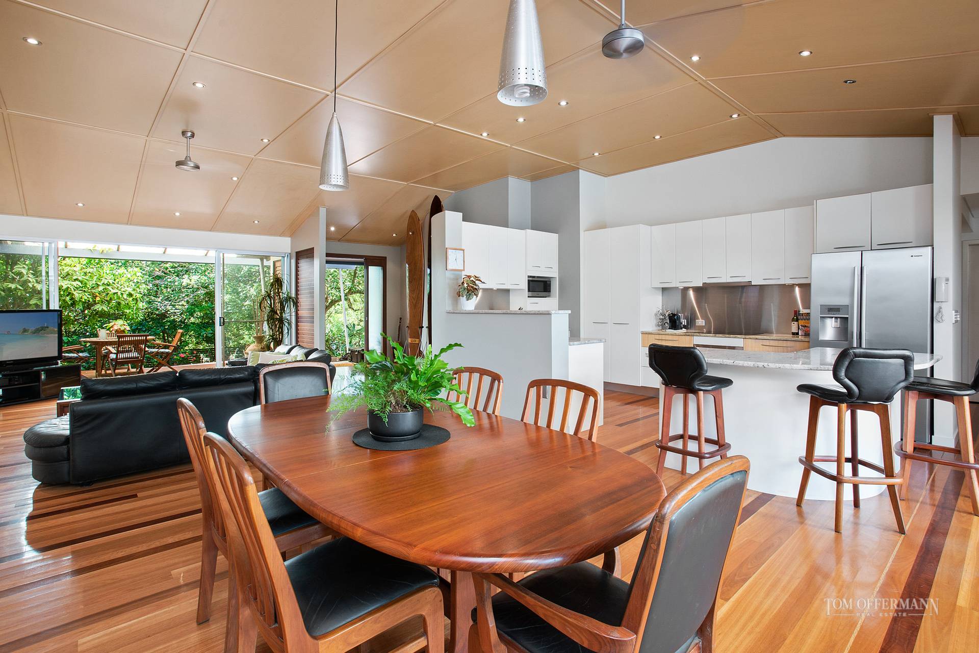 The substantial and versatile layout, embracing a seamless indoor-outdoor lifestyle, and drenched by natural light, is augmented by chapel-like 3.6-metre timber-lined ceilings, polished spotted gum floors and banks of louvres.