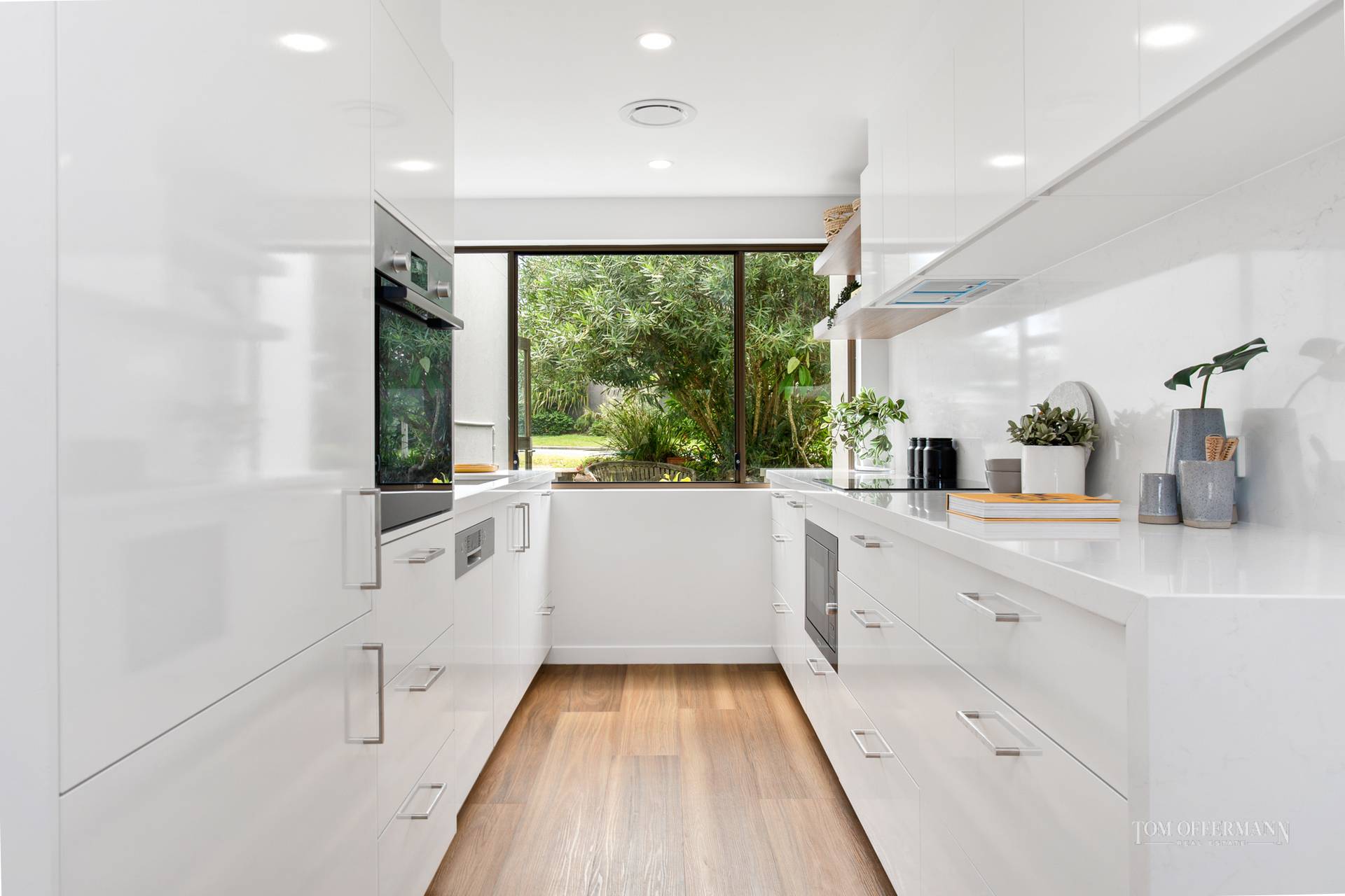 The galley-style kitchen with Quantum Quartz Michelangelo stone benchtops, mirror splashback, white cabinetry and all the latest high quality appliances are cleverly integrated in readiness for a kitchen whizz to create dishes for family and friends.