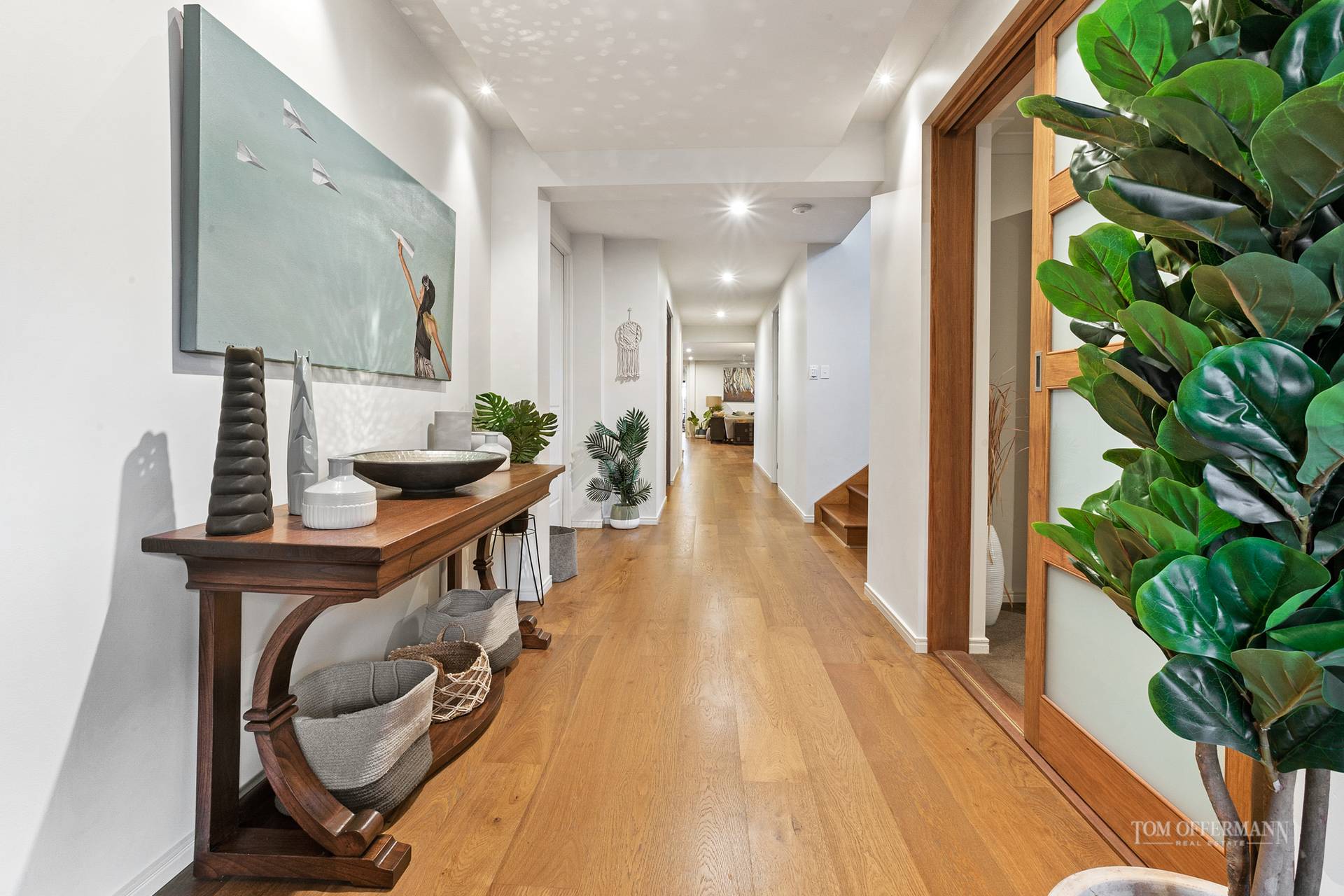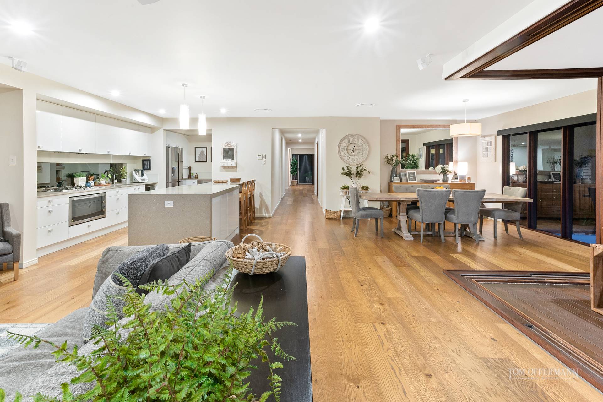 The modern aesthetic with a natural palette of the high-quality fixtures and fittings used throughout. The beautiful polished oak timber floors feature along the lengthy hallway past the study, powder room and guest bedroom with ensuite, ideal for someone preferring single level living, before making a seamless transition to the vast living spaces including dining, family and rumpus rooms, which all have stacker doors opening out to a massive grand outdoor room on the Easterly side.