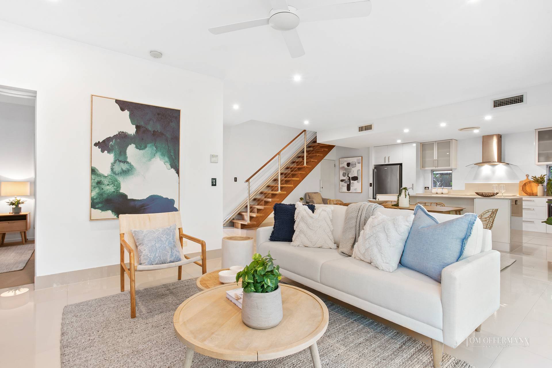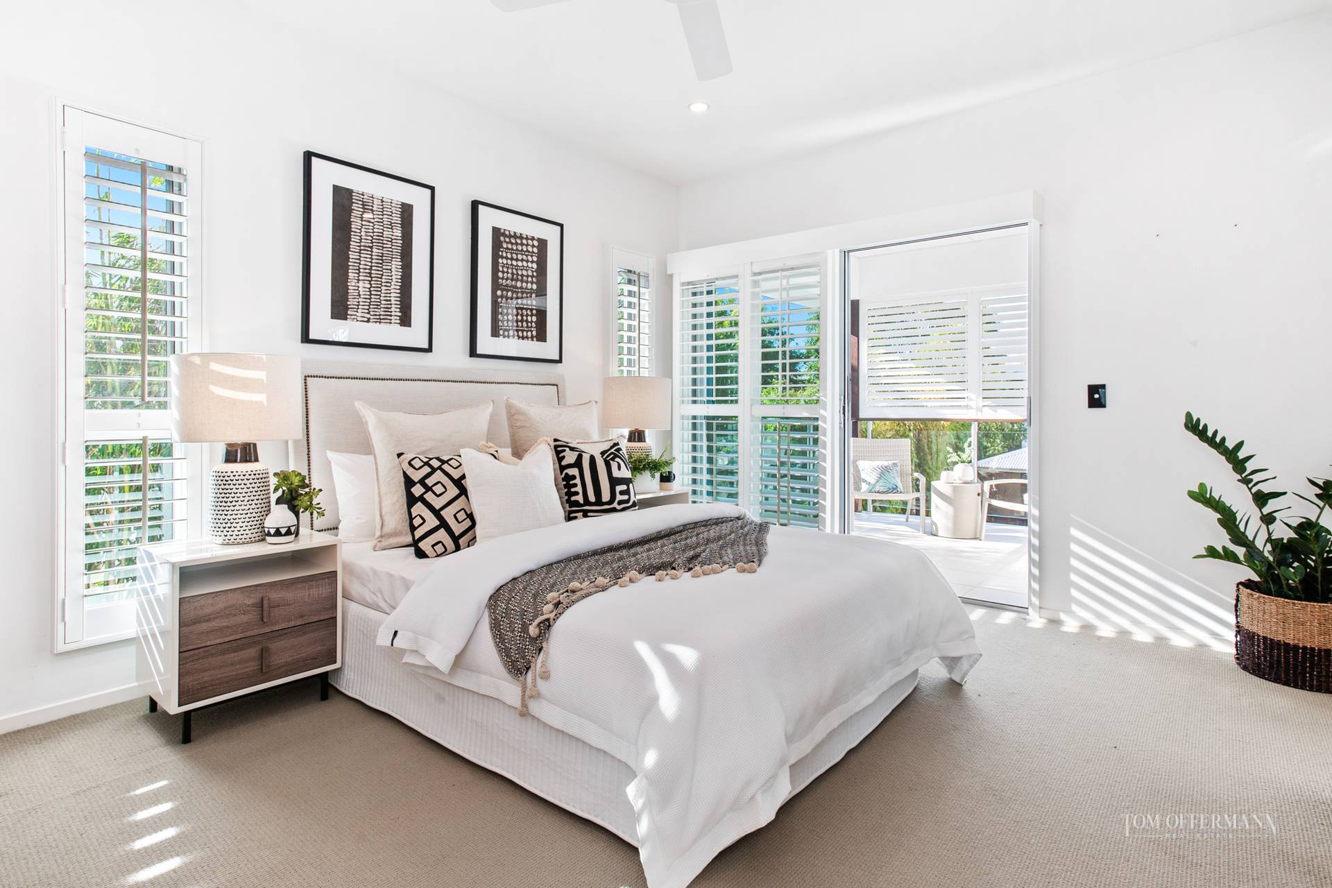 It is all about a modern aesthetic, cool coastal vibe, high ceilings, louvres, a bright white palette, and light sandy-hued porcelain tiles, which spill into the over generous living and dining spaces from the front entrance hall. Banks of sliders complete the seamless transition to outside.