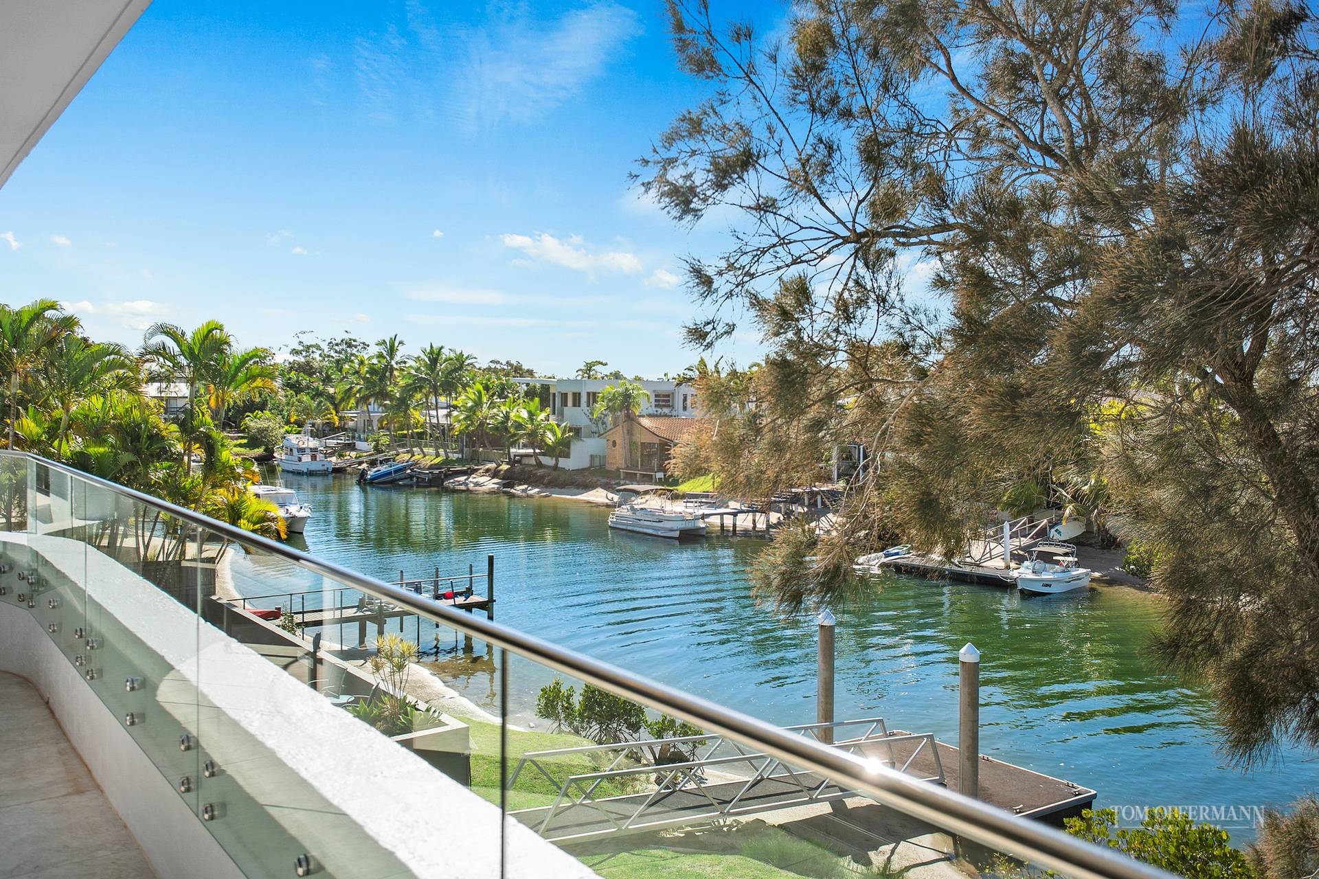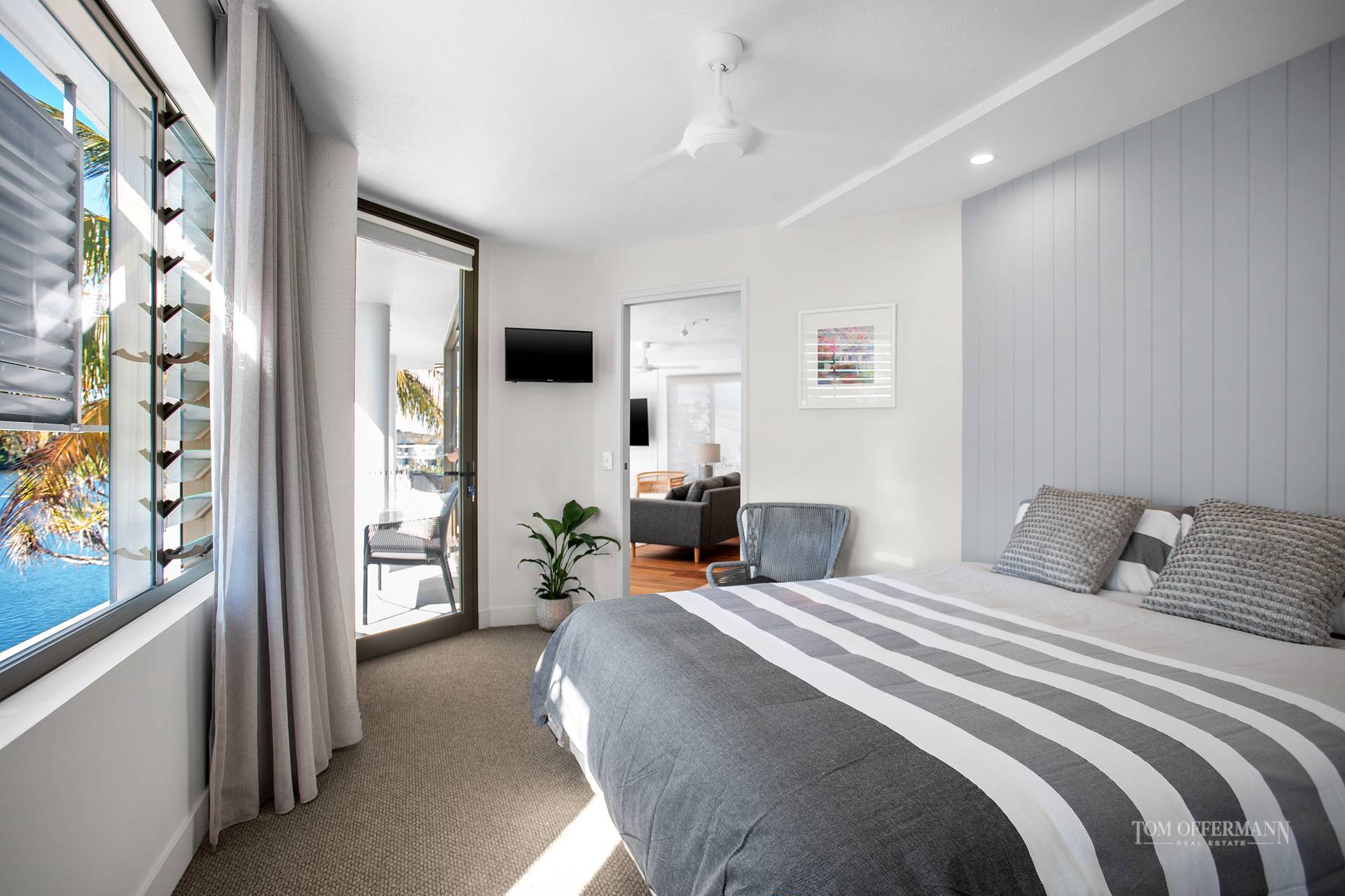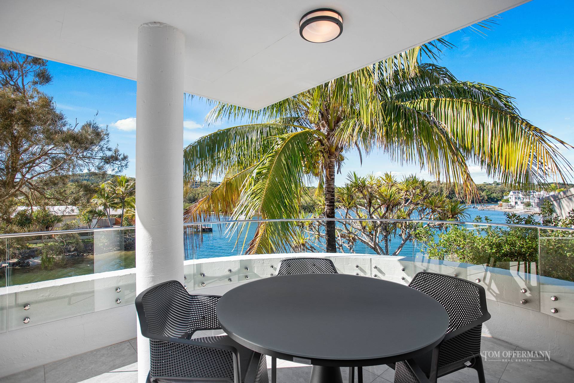 Lines are blurred to outdoors with the long entertaining-style balcony 'wrapping' two sides of the open plan dining/living space. Reach out and almost touch the coconut palm fronds, partially framing the great outdoors where the sunshine shimmers on the wide waterway. It is like a magnet drawing attention to the pelicans gliding by, boaties heading to the upper reaches of the Noosa River plus kayakers and stand-up paddle boarders taking advantage of the idyllic sub-tropical climate.