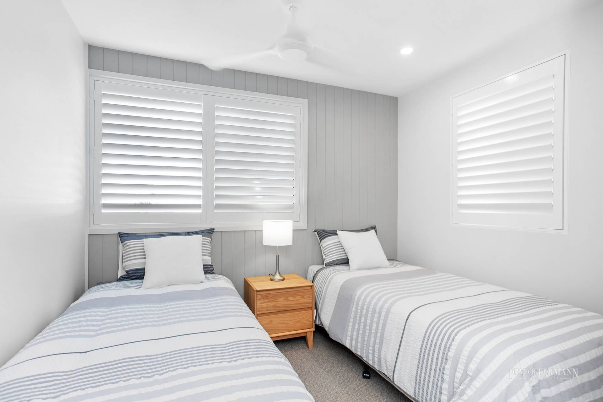 First impressions of this cool calming haven are outstanding. The light-drenched and breezy interior, with rich timber flooring, louvres, white shutters, and shades of grey throughout, oozes sleek on-trend style.